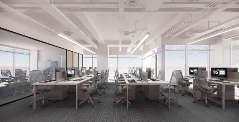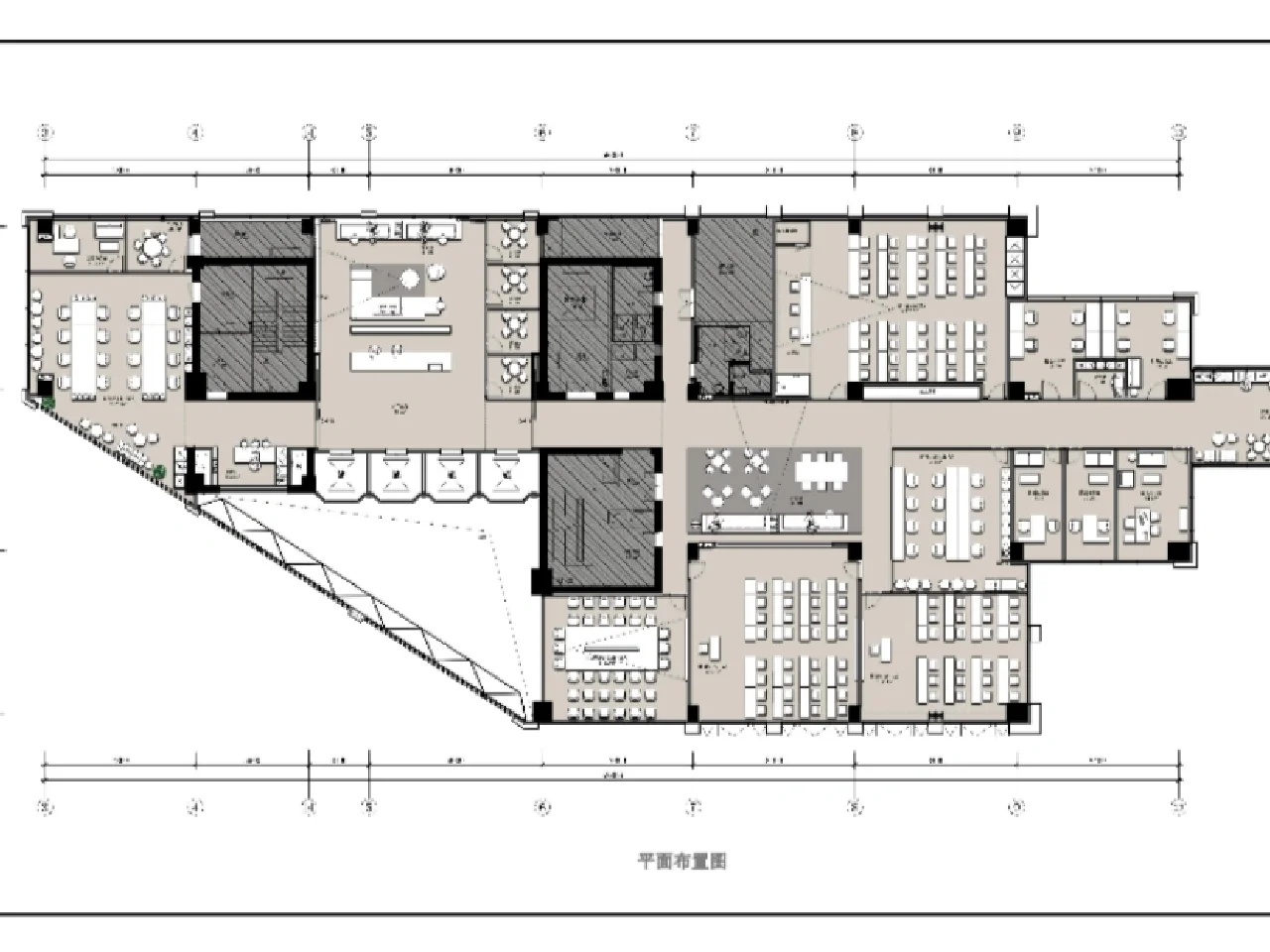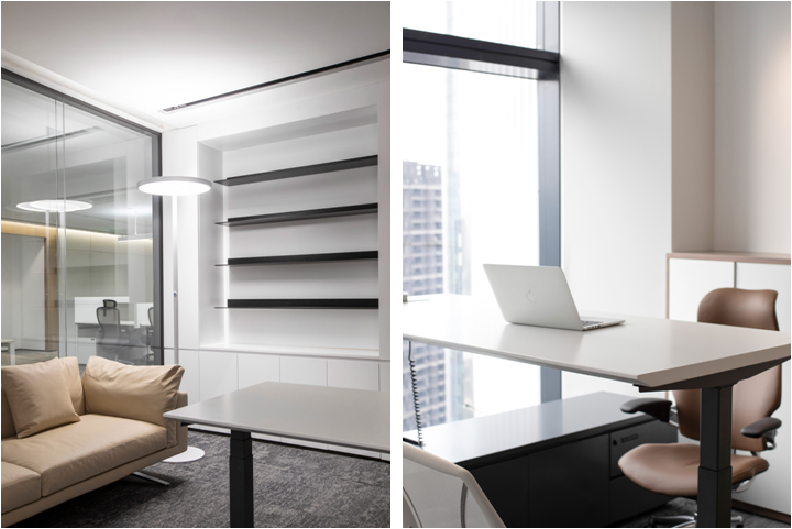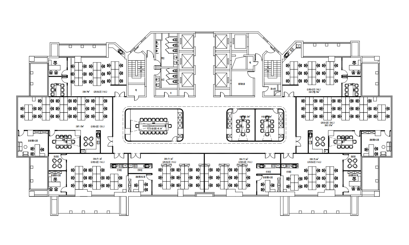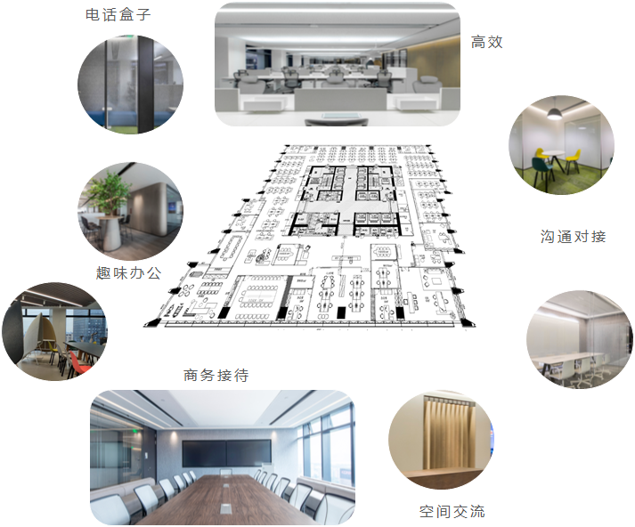 功能分布原则:进门印入眼帘的开放式兼具前台、办公、接待功能于一体的接待空间,幕墙延边均以常用办公人员为主,核心筒内测视野、通风、采光较差的区域设置办公配套功能,并以核心筒的交通动线为核心辐射各个功能区,满足高效办公的原则。动静分离:办公空间南区西区为接待区使用模式(动区),它融合接待、面试,对外文化展示,咖啡社交休闲等多元化功能,北区、东区为较为私密安静专业性办公区使用模式(静区),动静区通过休闲区链接,员工可携带笔记本在这里沐浴