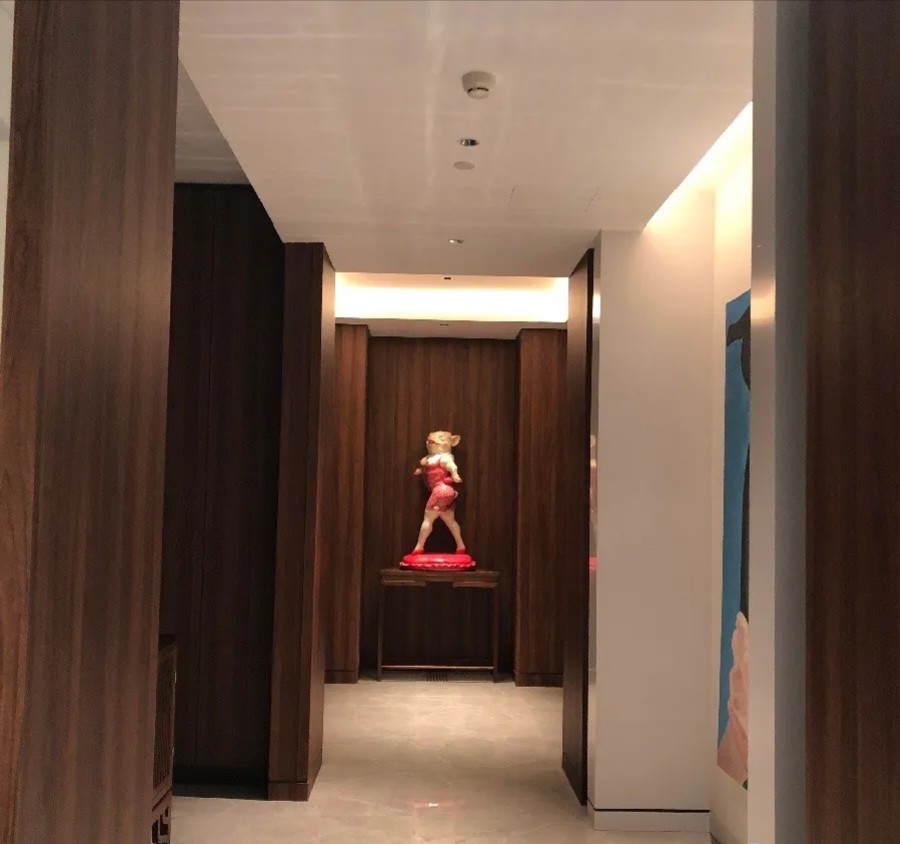 主要动线的墙面以天然的擦色胡桃木与深空灰装配式玻璃隔墙。