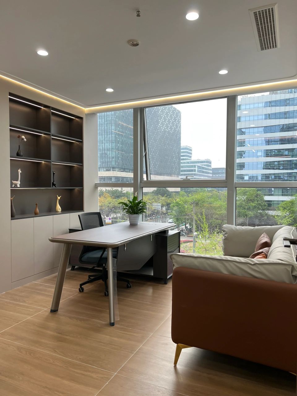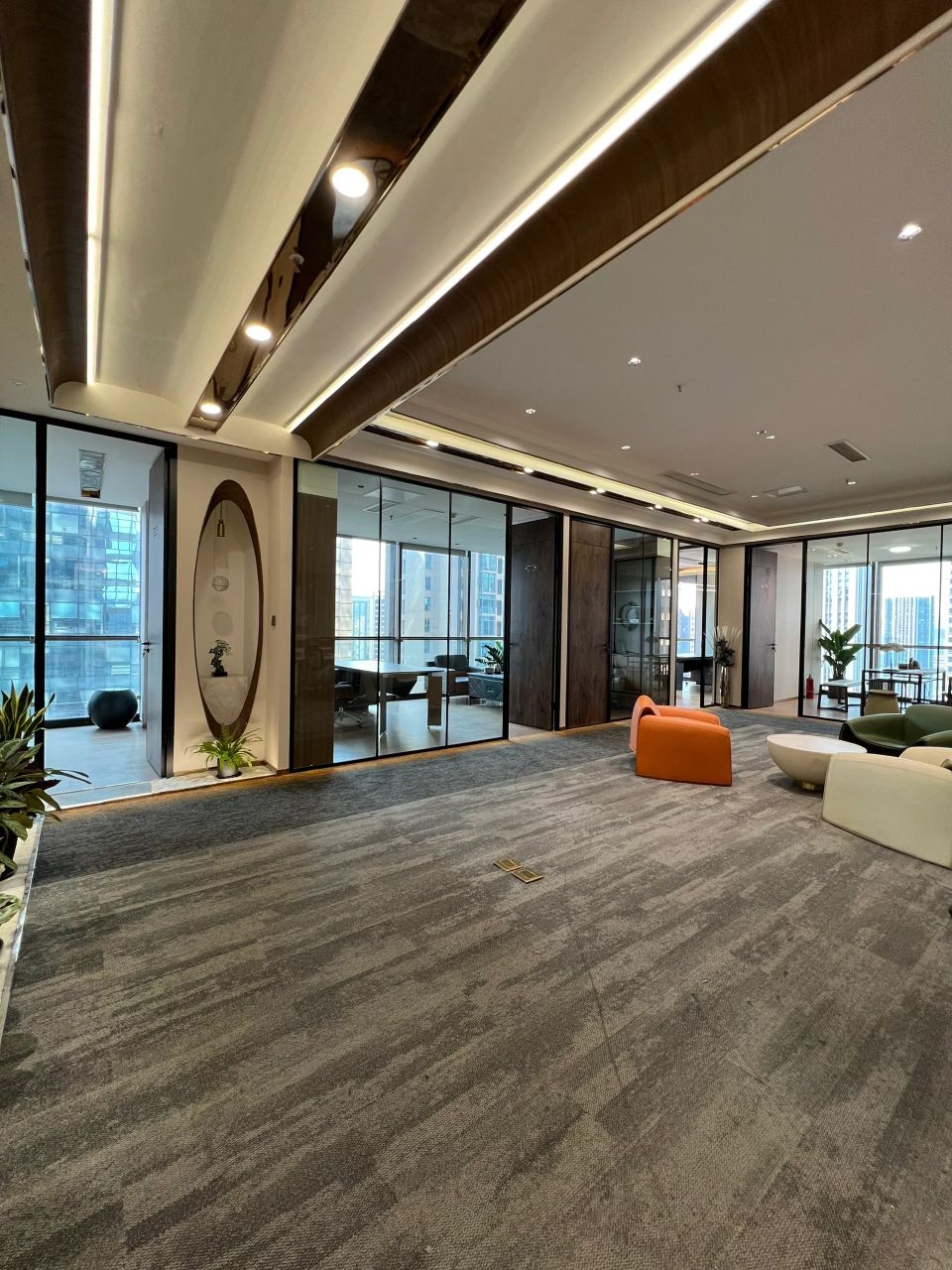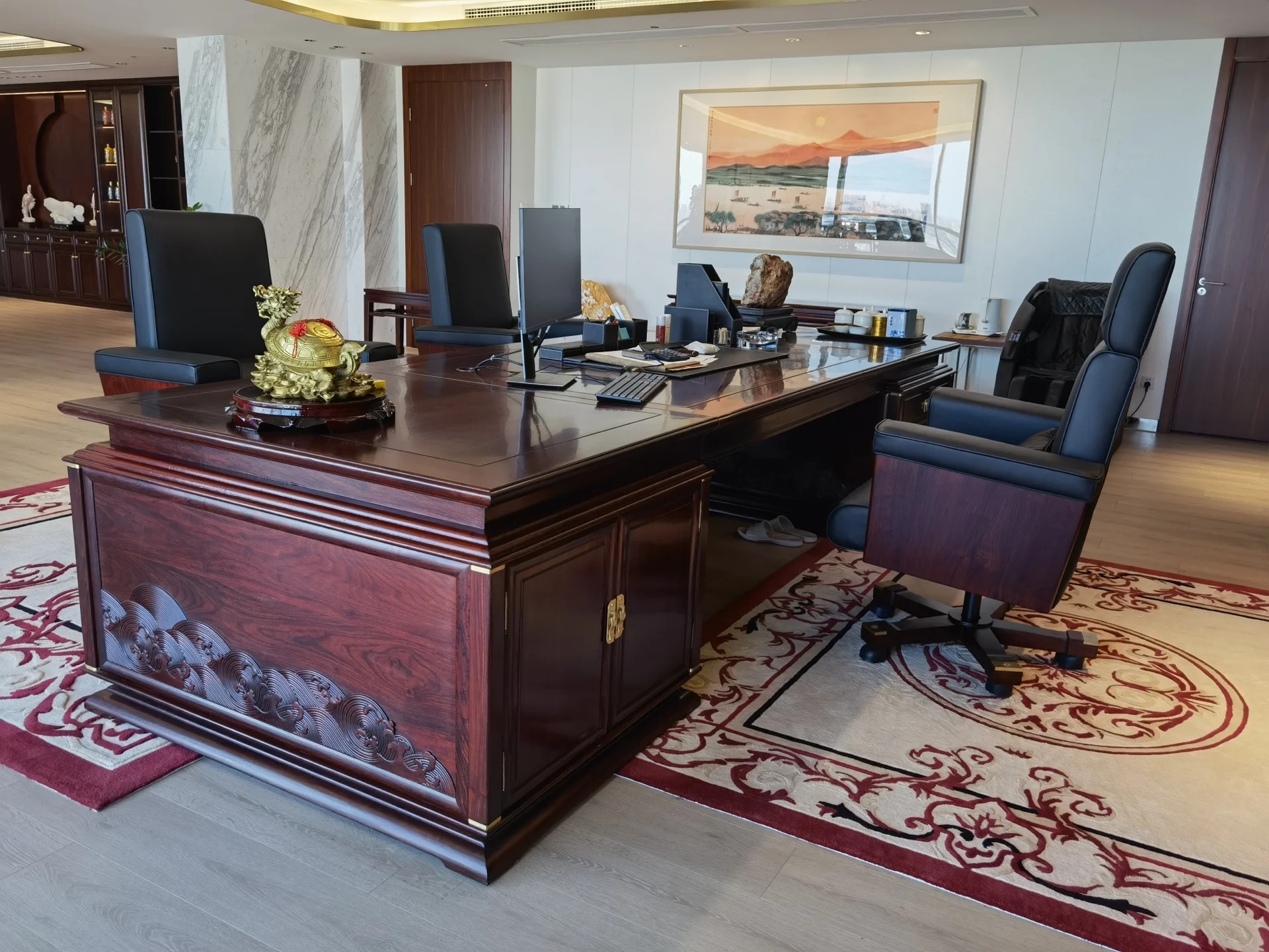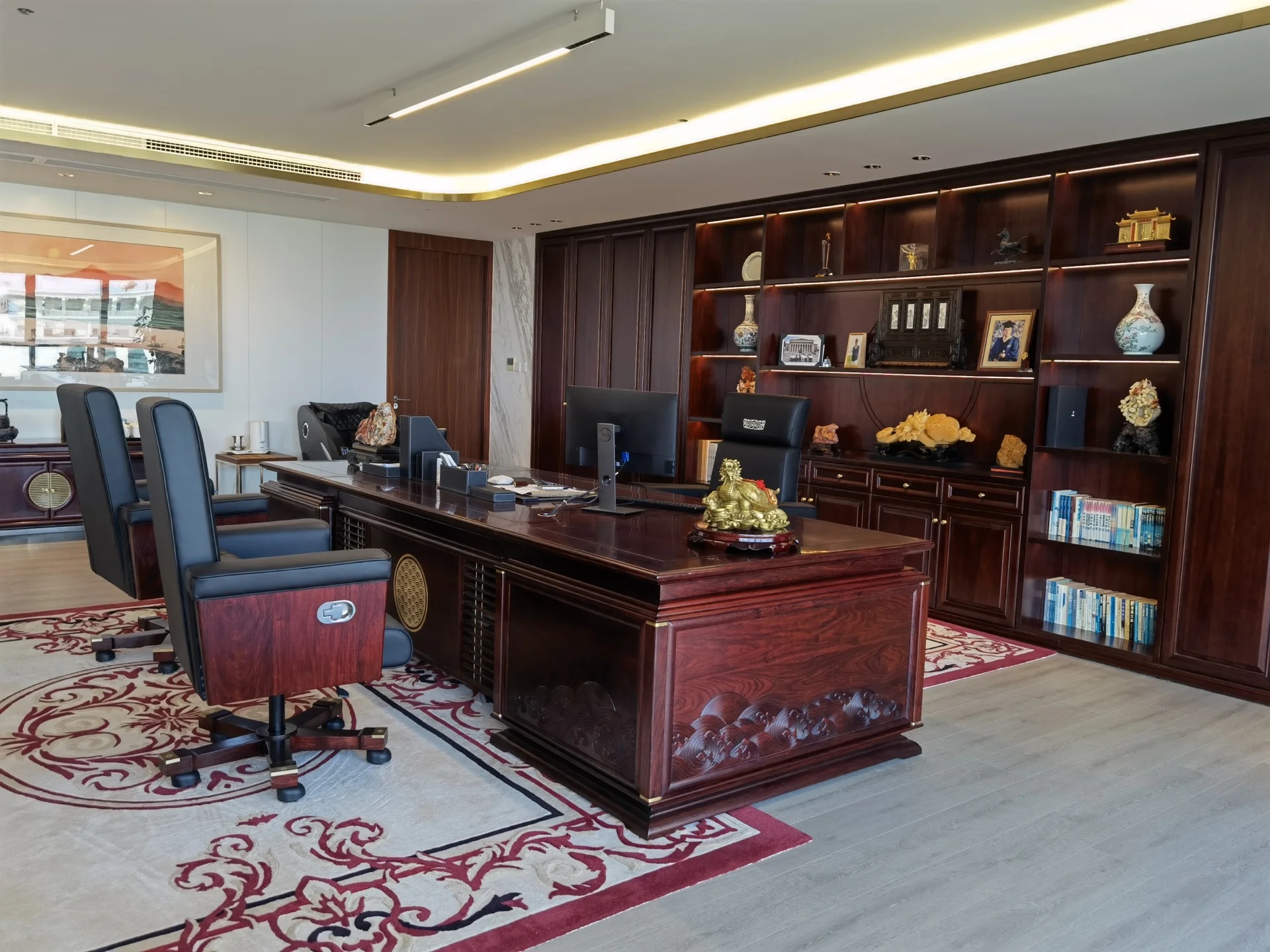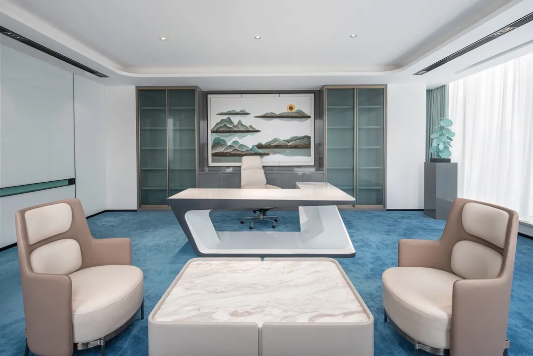 董事长办公室采用极简的现代手法,于室内造雅致之境。值得一提的是,背景墙上悬挂的立体装置油画取材于中式山水画,呈现了中国画的意境,绝妙之处在于以晶圆为旭日,用沙石和芯片铺路,将金箔推满山脊,象征着艾为的事业是点沙成金。