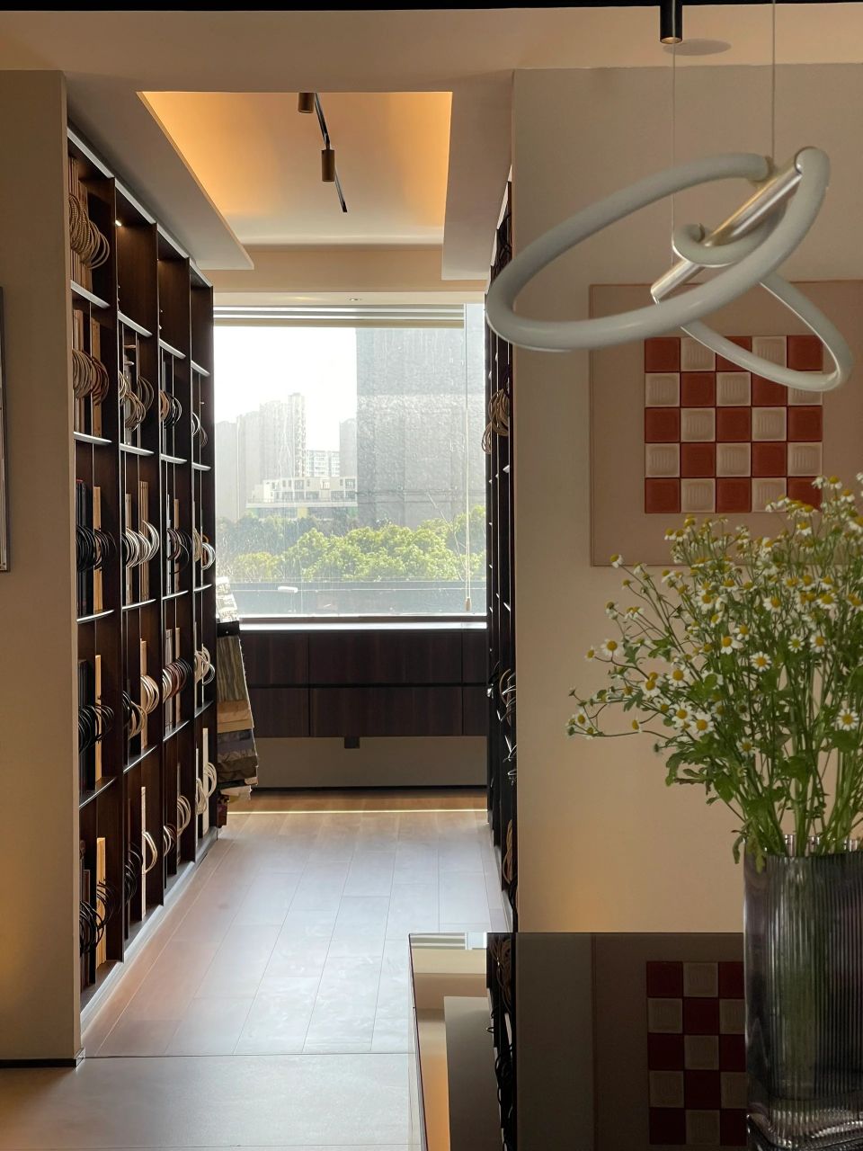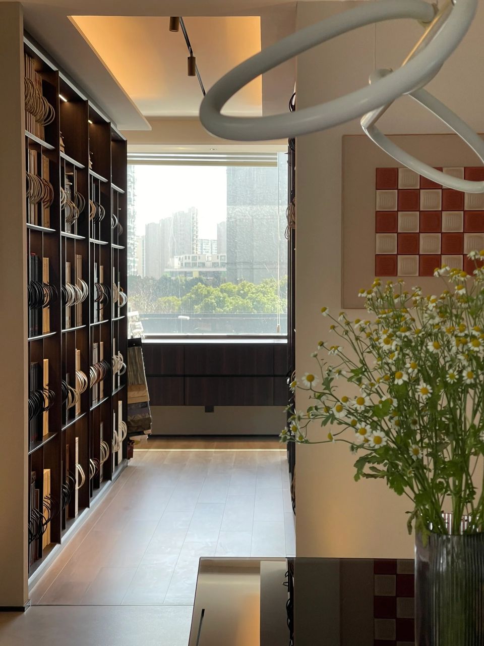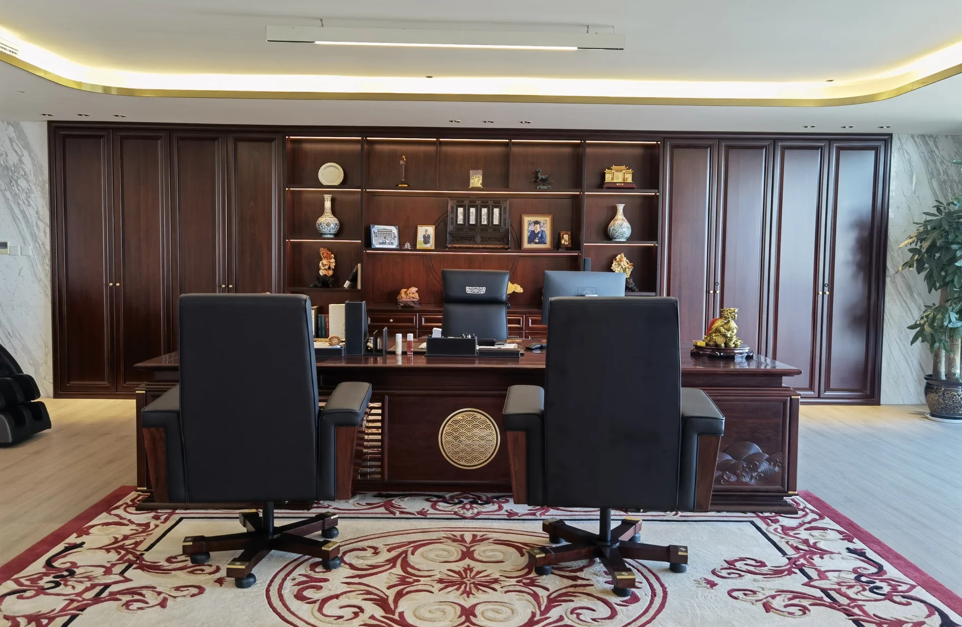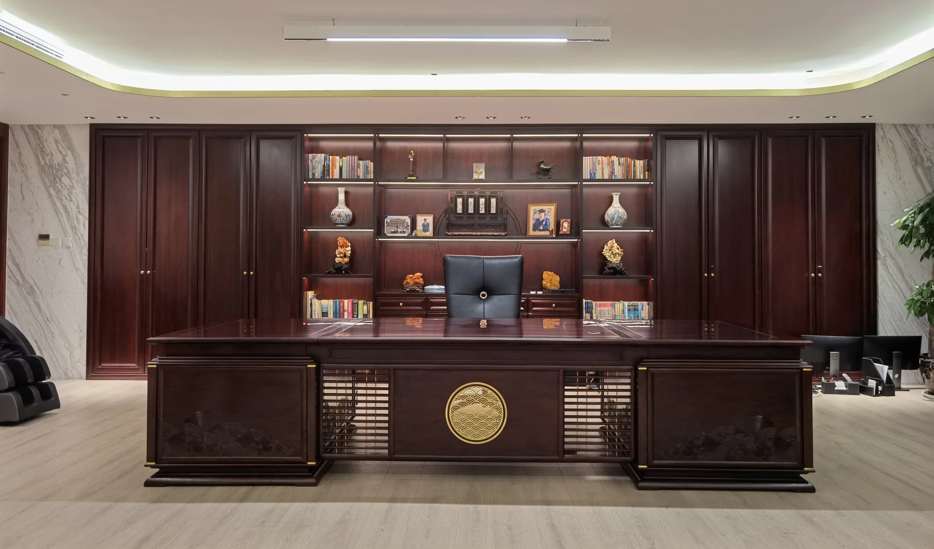 董事长办公室采用极简的现代手法,于室内造雅致之境。值得一提的是,背景墙上悬挂的立体装置油画取材于中式山水画,呈现了中国画的意境,绝妙之处在于以晶圆为旭日,用沙石和芯片铺路,将金箔推满山脊,象征着艾为的事业是点沙成金。