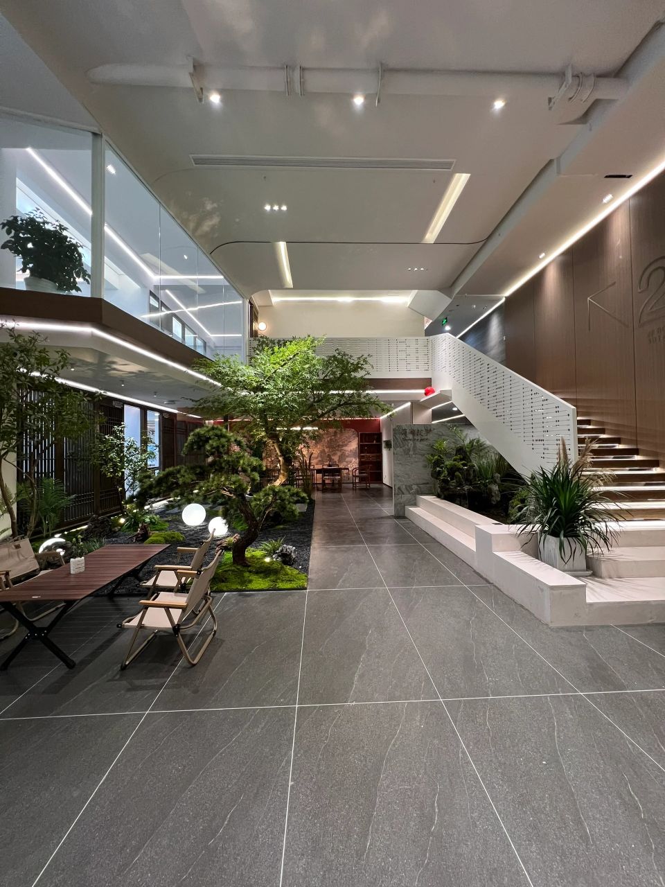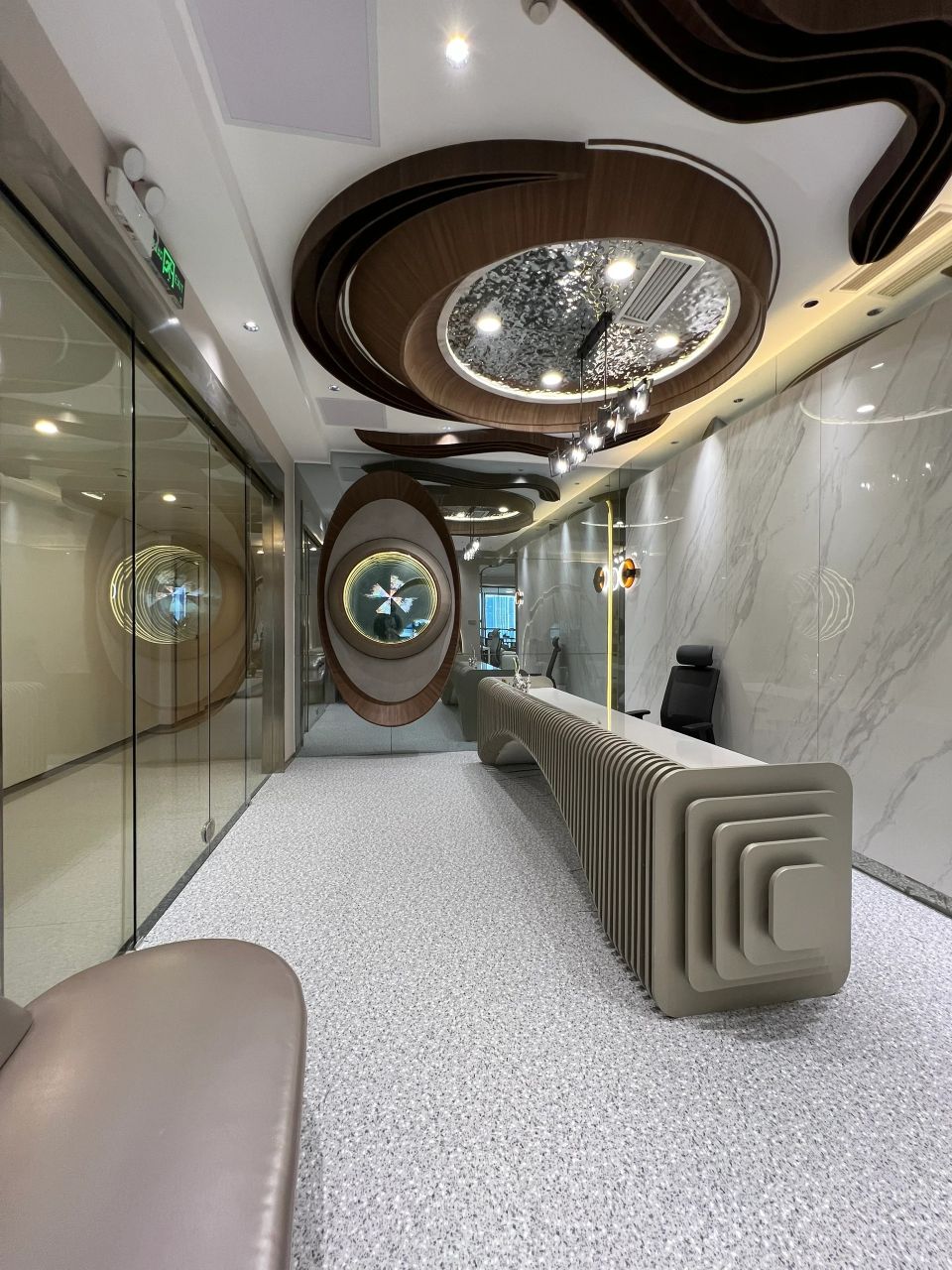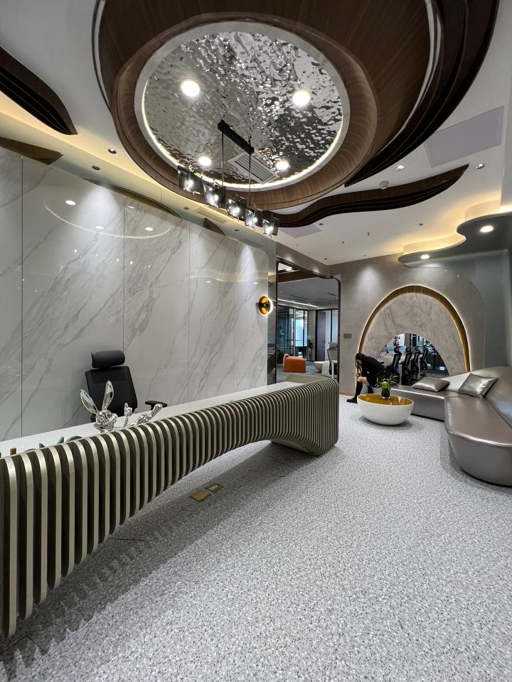 在公共空间的设计上,这个空间是静谧的,充满创造力的,它如同一个能量场,给予到访者力量。大胆的想象力作为燃料,牵引我们触碰未来。将“星系”概念融入到此空间当中,试图把科技与艺术装置融入该项目,呈现出神秘、科幻的空间印象。在充满科技感的空间里,将它艺术化处理,大小不一的球形装置灯以一种失重状态“漂浮”在空中,仿佛呈现了一个微缩的宇宙,讲诉着星球的历程。
