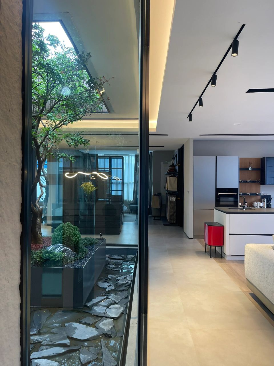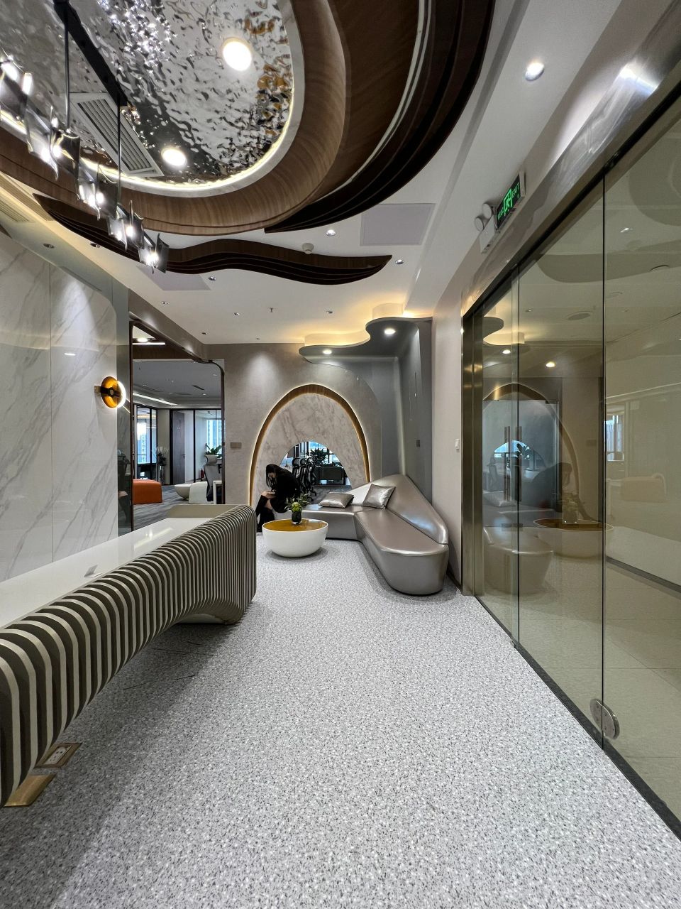 现代科技的发展,使得人对空间维度的认知与认同愈加多元。以舒适高效的空间感知,突破科技、人文与自然的固有边界意识。在材质的选择上,这里选择了镜面不锈钢的材质作为墙面,使得观看者的空间感知概念变得扭曲,通过空间延伸以营造出停留在宇宙中的空间站氛围感。