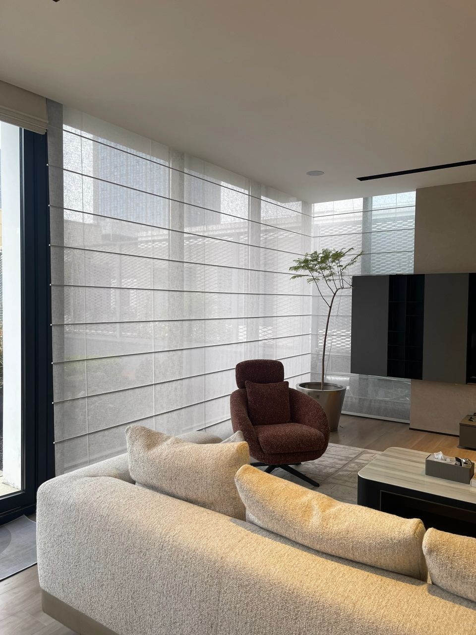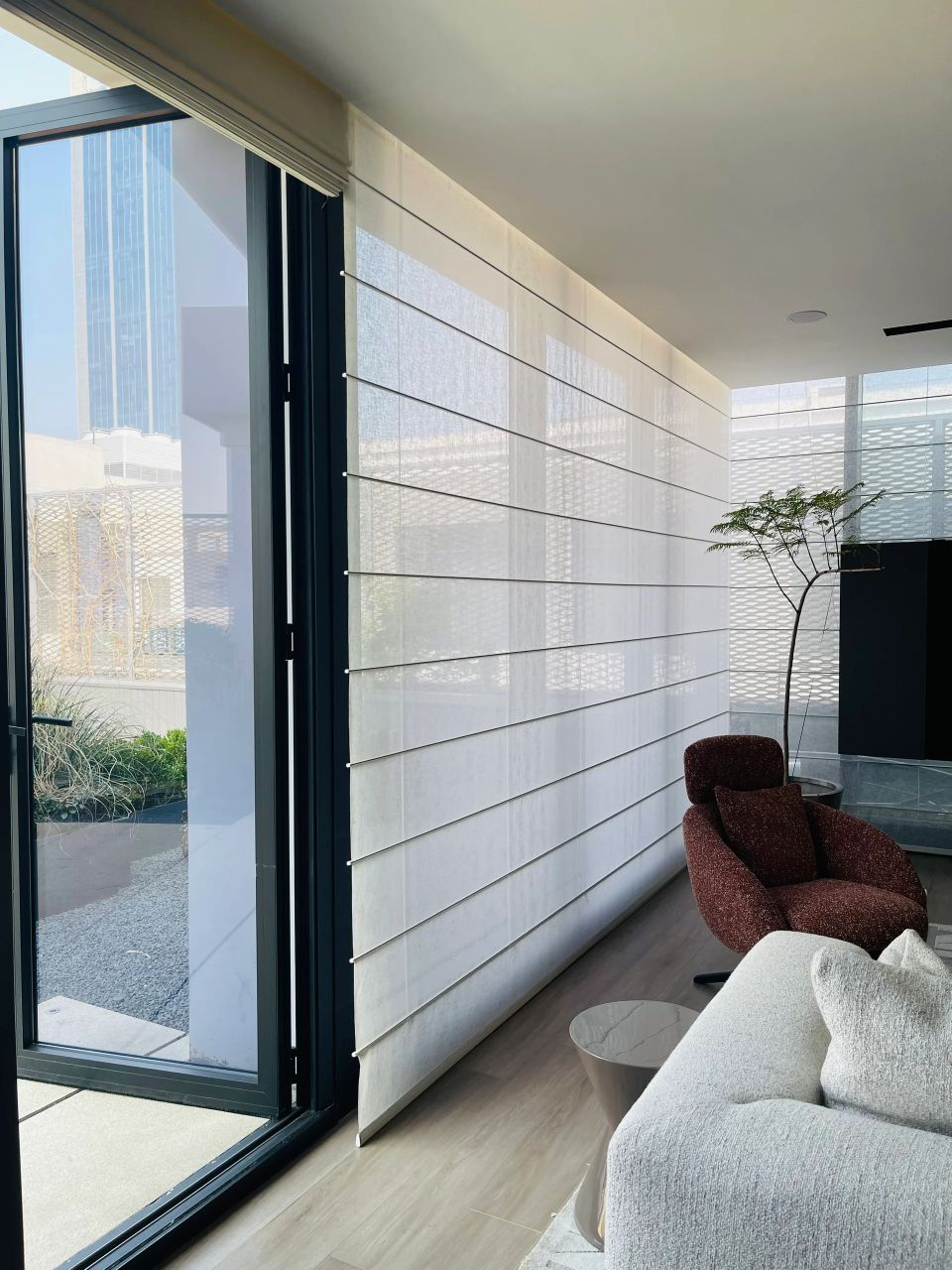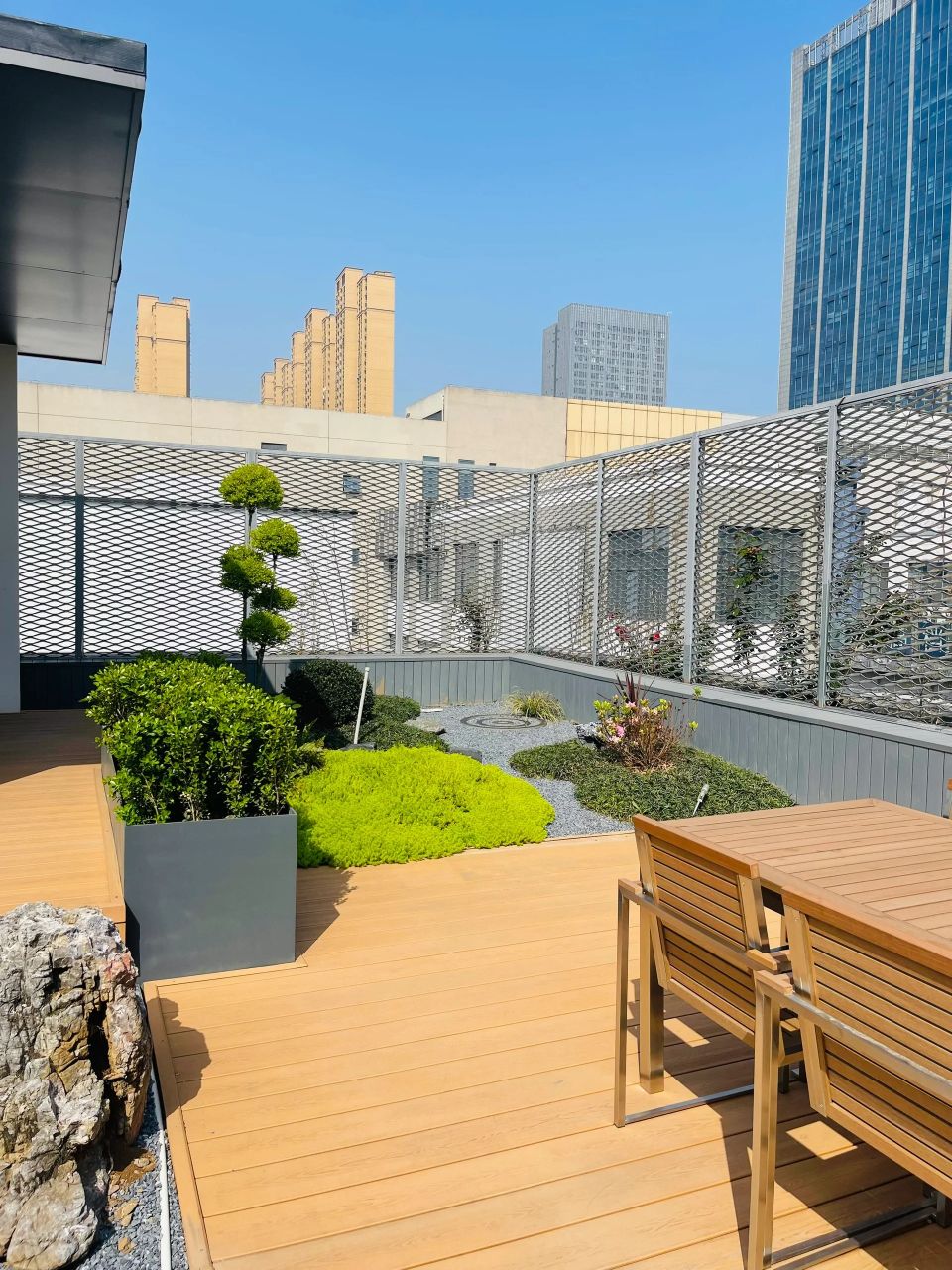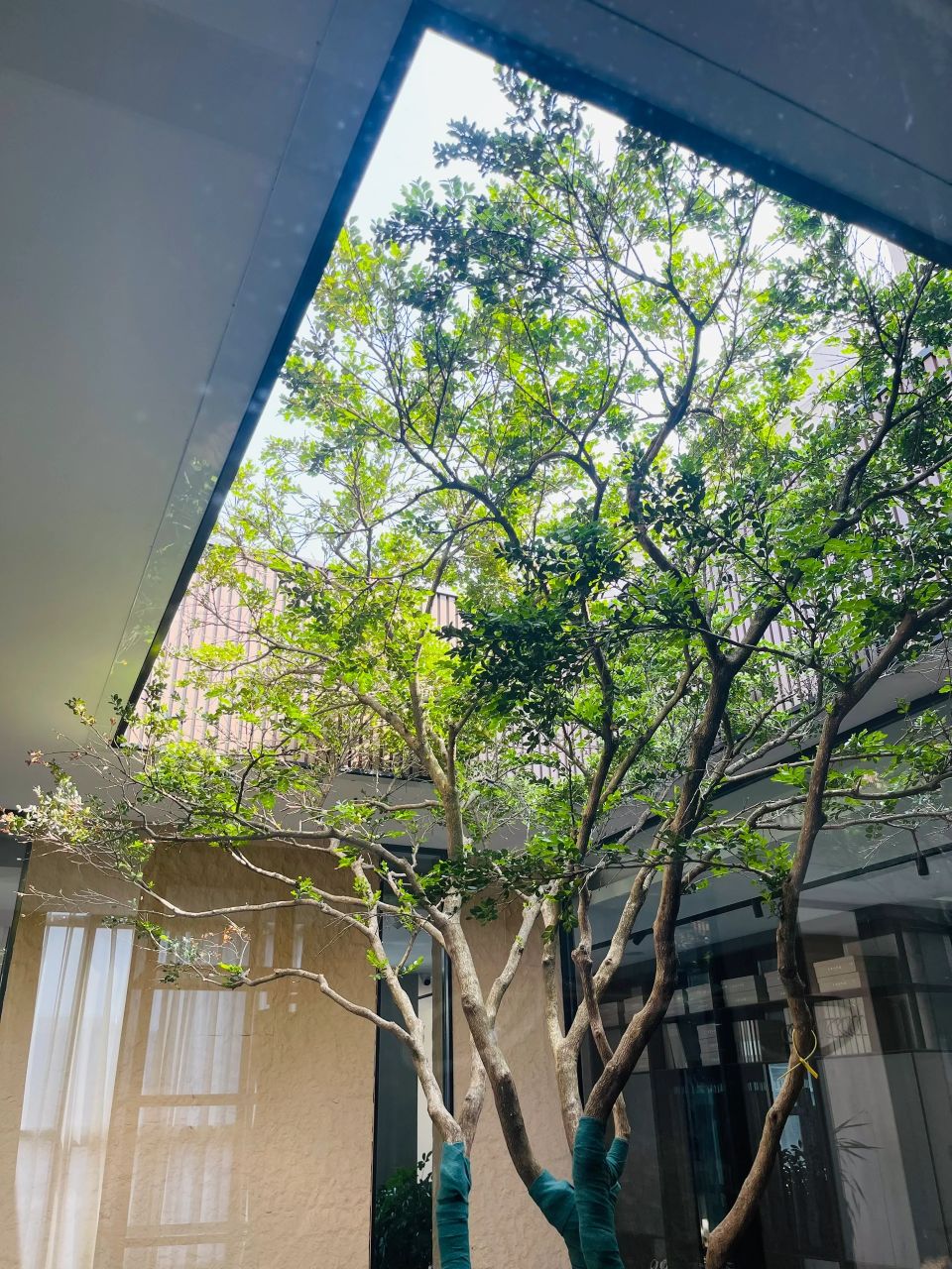 设计师用大面积的透光玻璃满足了客户对空间通透性的需求,阳光倾泻而入,漫射在木质桌椅上,一切都刚刚好。