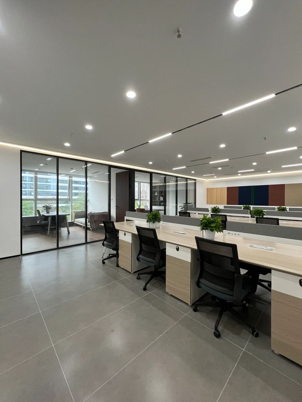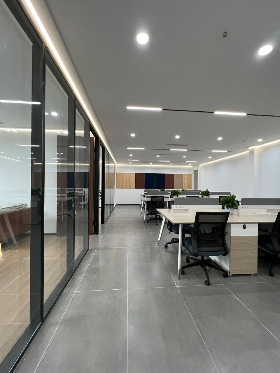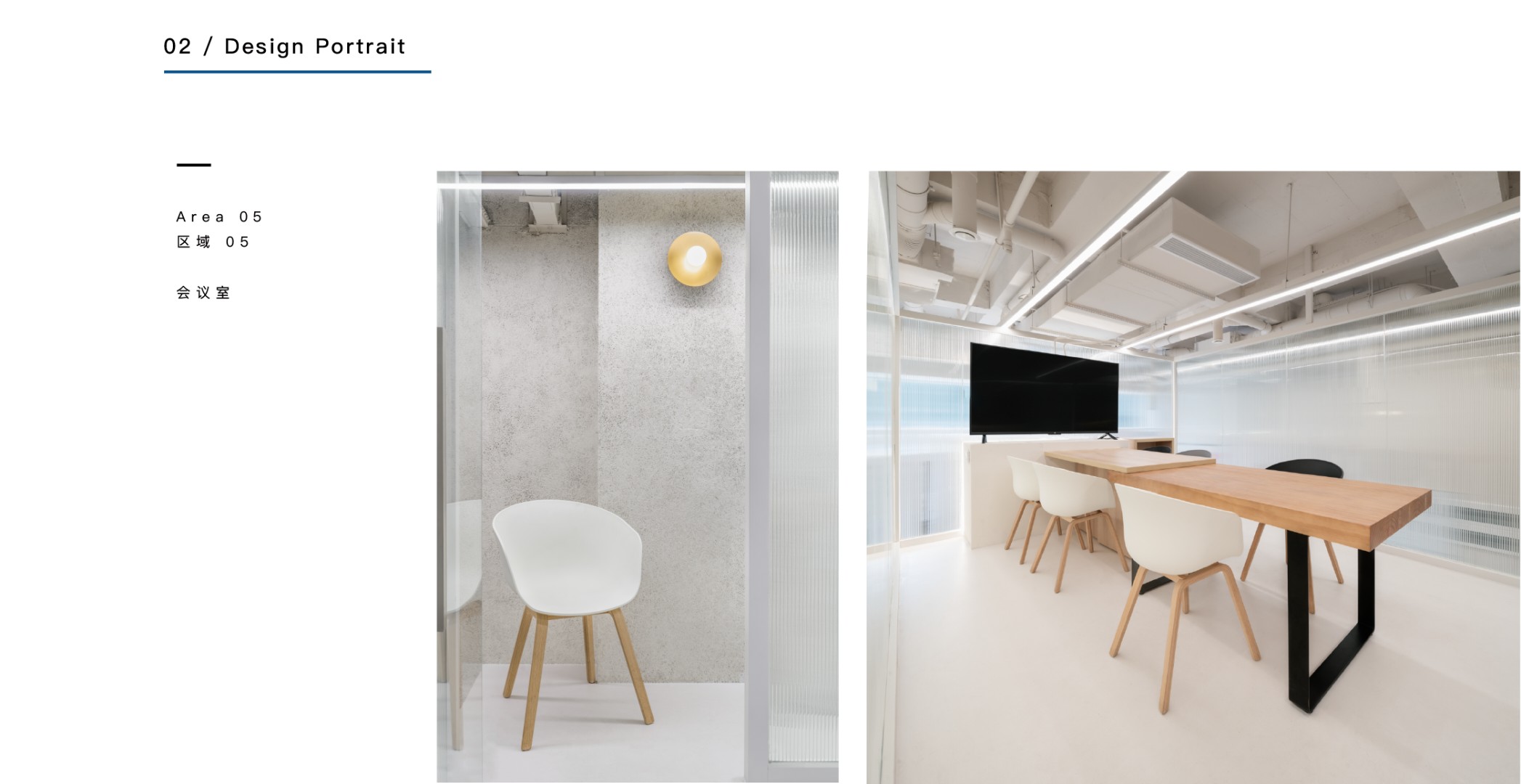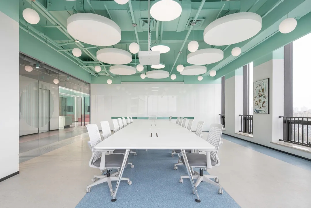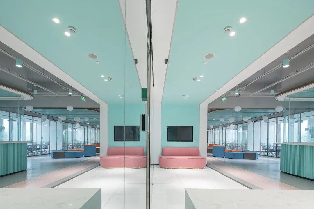 艾为蓝作为企业标志色,我们将它大量的运用在空间中,不同明度的灰色与艾为蓝进行组合,提升了空间的层次感,营造出清透干净的质感。