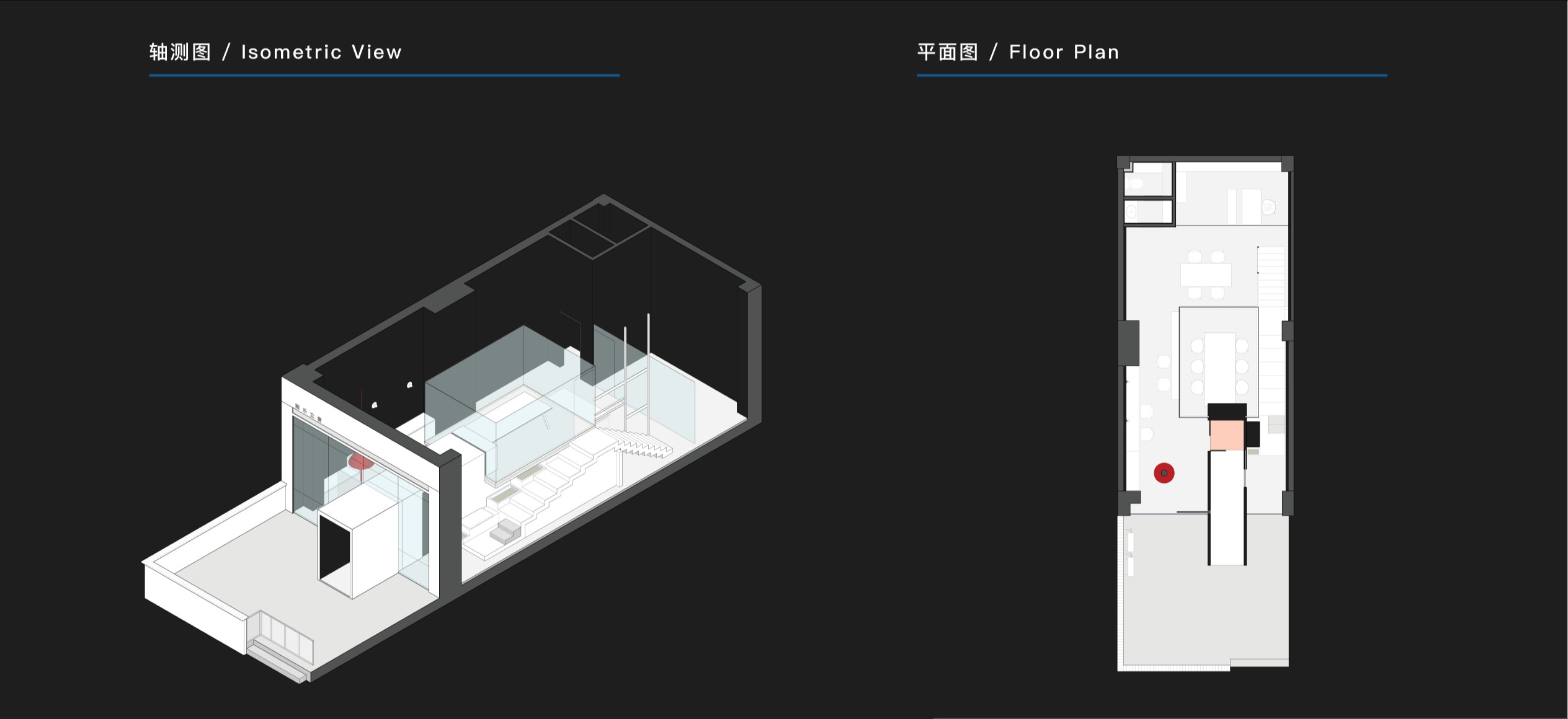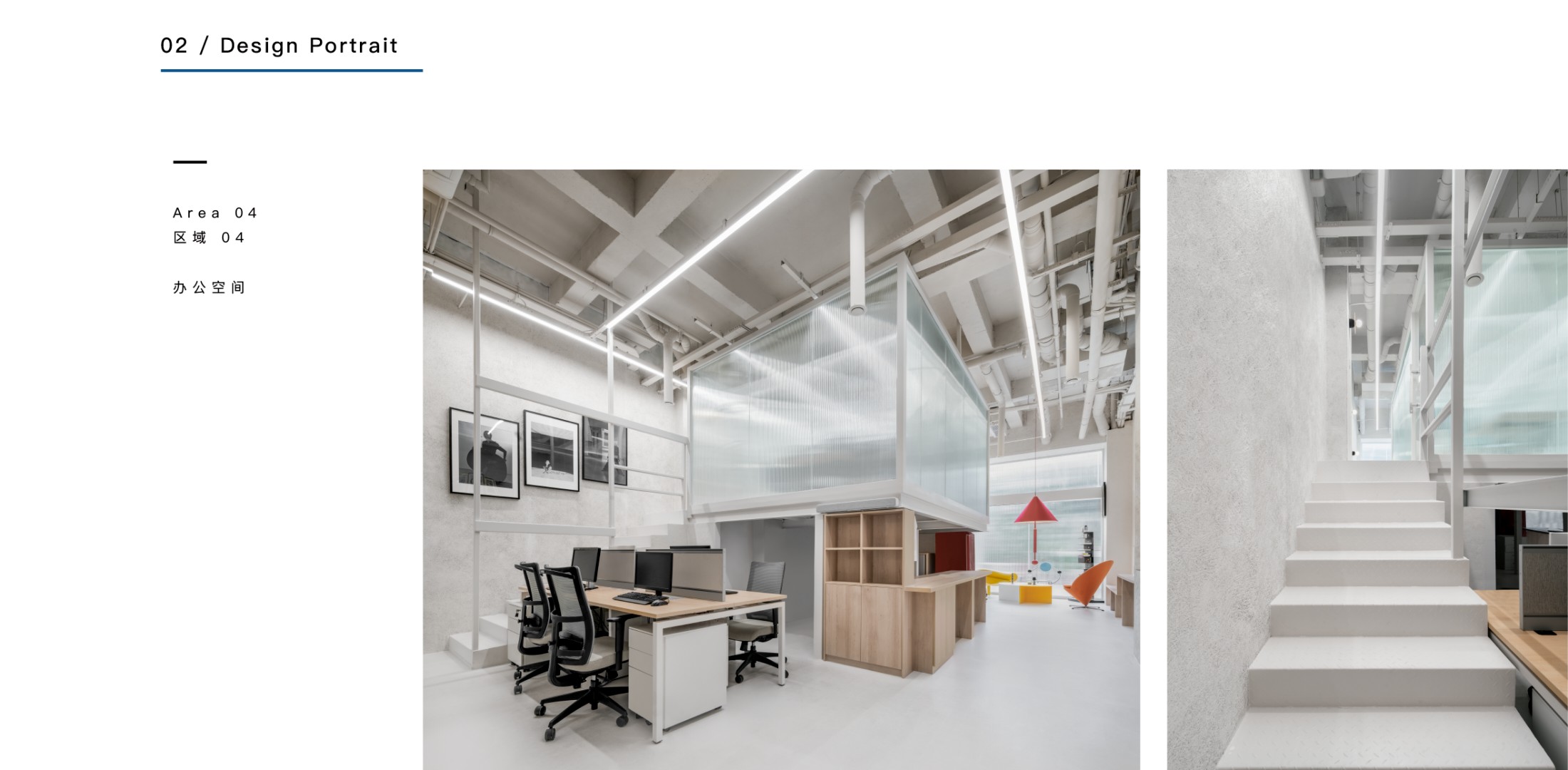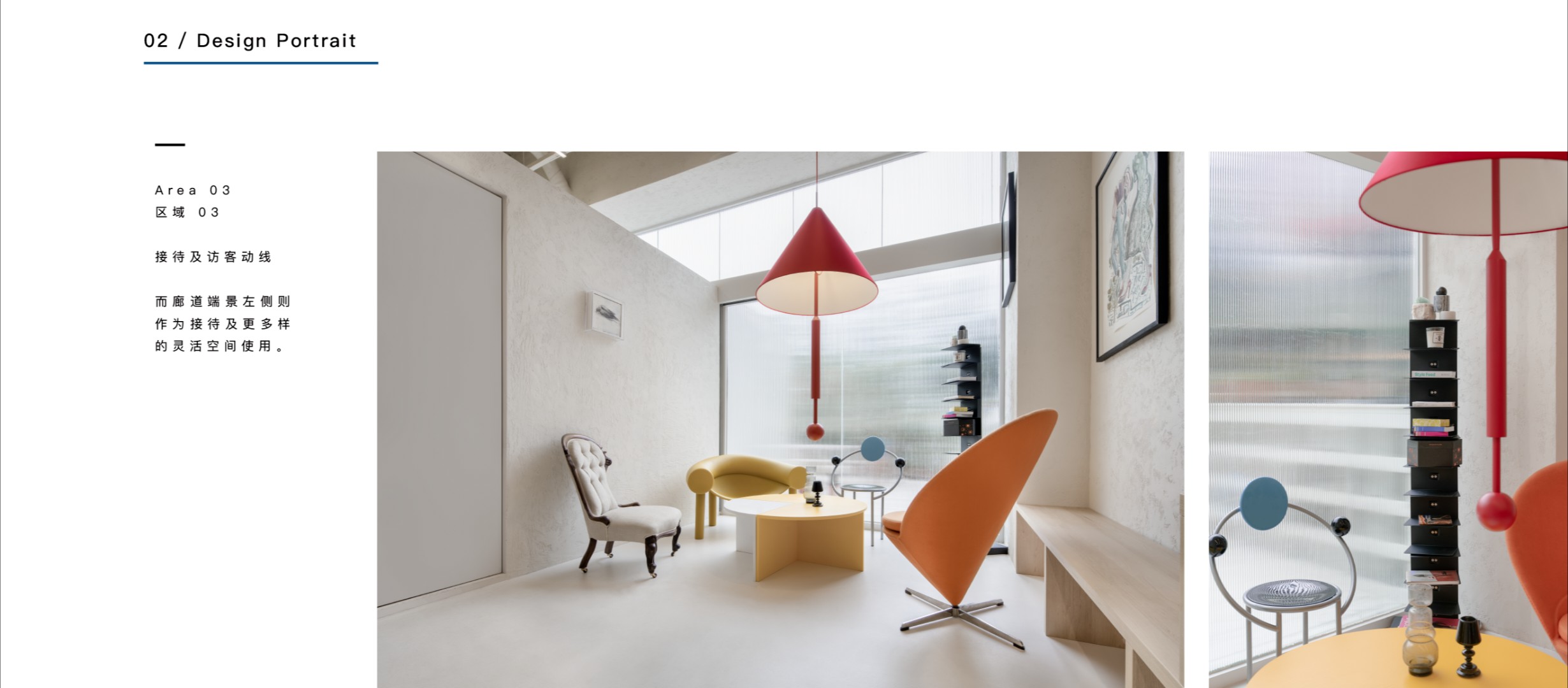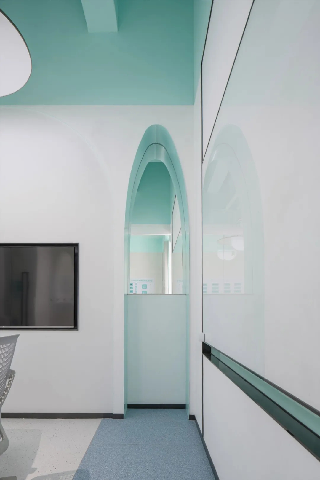 设计师在原始的空间框架内嵌入新的空间关系,使空间造型恰好可以让曲线延伸,形成拱形走廊,成为使用者们最常接触的场地和形成进入者与空间之间的关系。