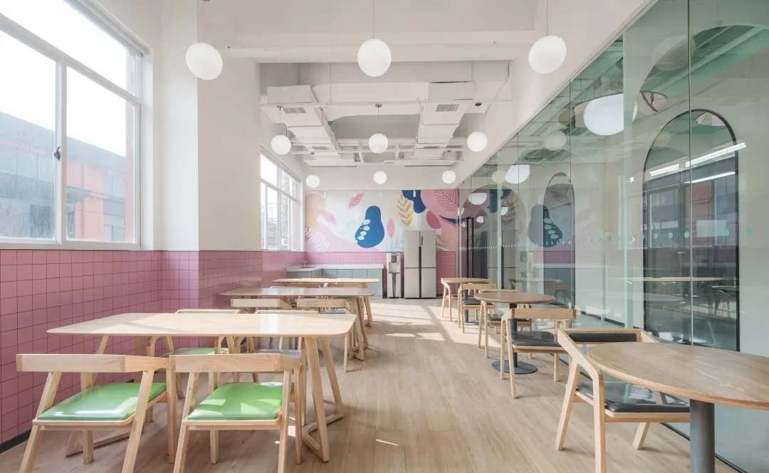 员工餐厅是本案一个重要的功能区域,这是公司特地为员工提供的一个大型聚会场所,设计团队的任务是创建一个可以用餐、咖啡、日常交流于一体的放松空间。