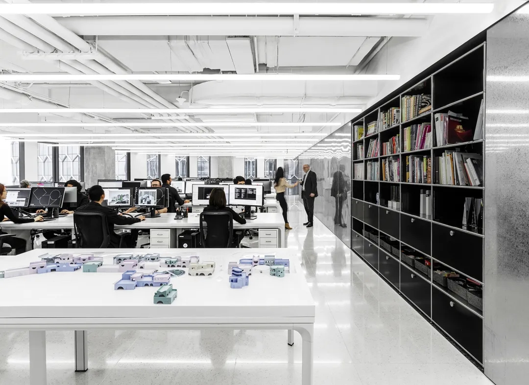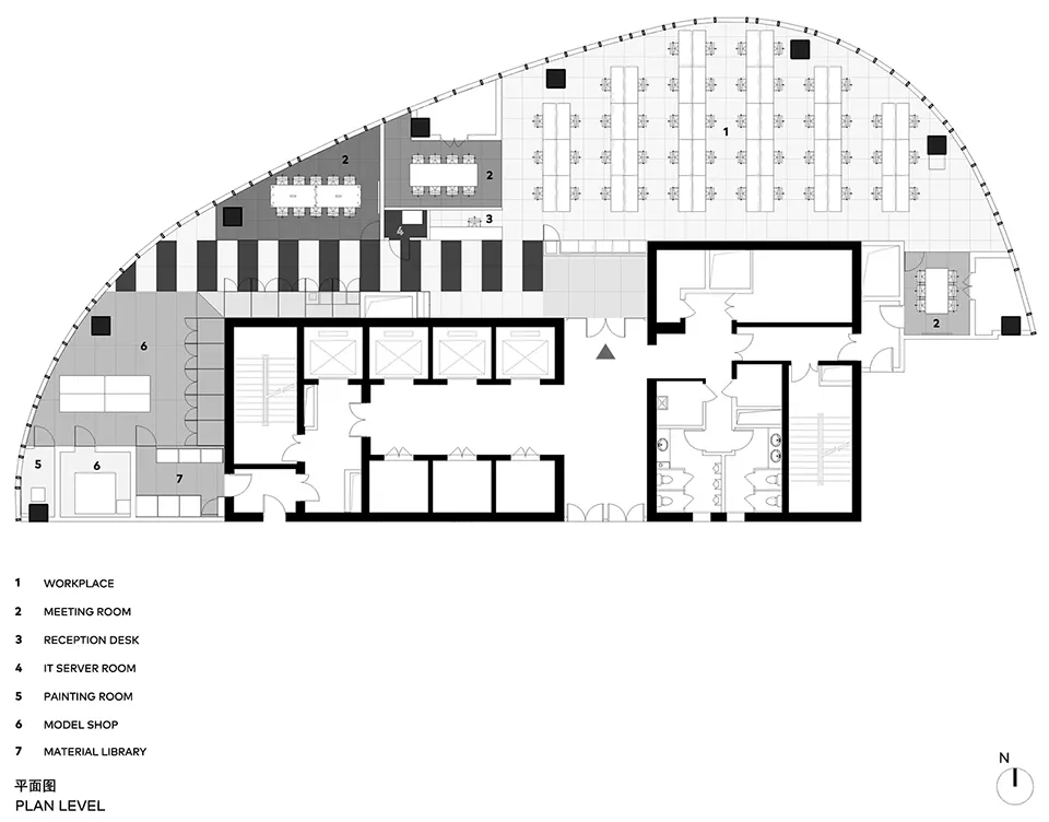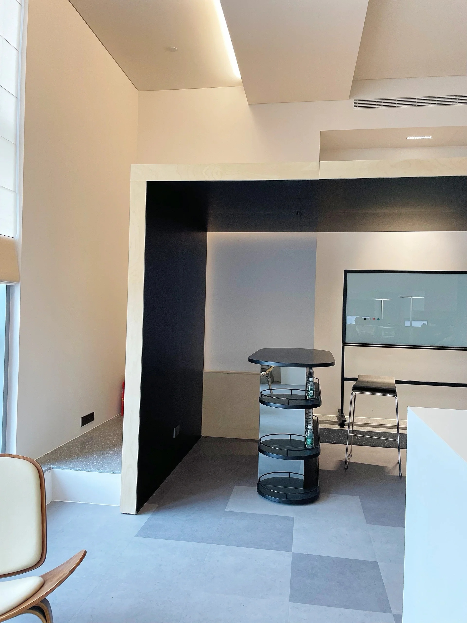 办公室的西南侧为一间功能齐全的模型室:在模型制作、设计测试和材料研究的区域中,木质包覆的环境将工作台、 3D 打印机、激光切割机等与材料储藏室和档案室融合在一起。拆卸、搬运相对灵活的家具可以将模型区域快速转换成影棚或分享演示的小型礼堂。