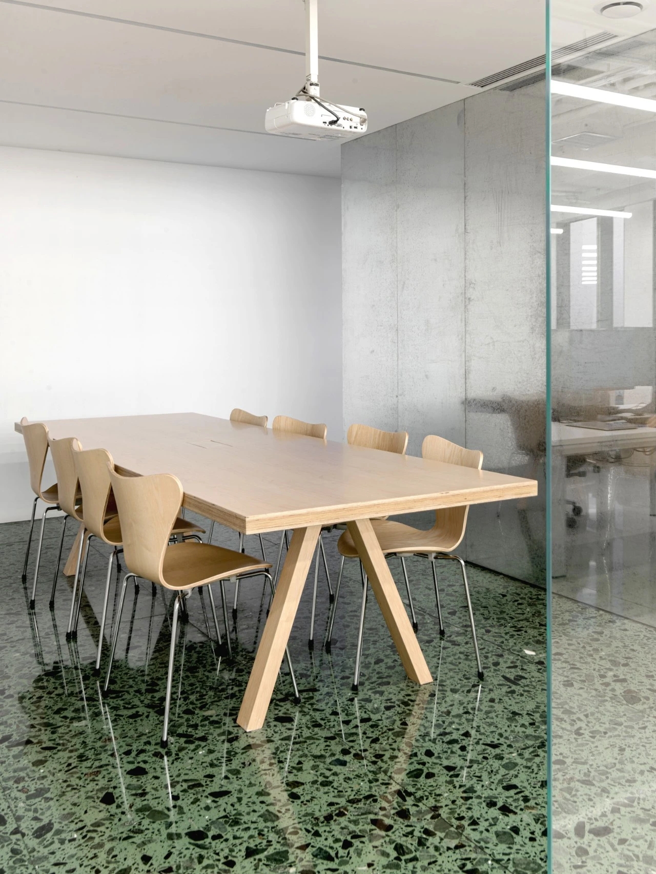 水磨石是一种重复利用石材边角料的好材料,是可持续性建筑材料的好选择,其经济实用,可以手工浇注或预制。过往以水泥作为粘合剂的水磨石色彩单调、粗糙、易开裂、视觉美感欠佳,可选多样性较少。如今,采用环氧树脂代替水泥制作的水磨石很细腻、平滑、光亮,在颜色、形状、星星点点的装饰上有了百花齐发的选择,拥有不规则又粗犷的美感。因此,CLOU在不同的办公室分区内选择了黑、白、蓝、绿等斑点、色泽形态不同的水磨石。