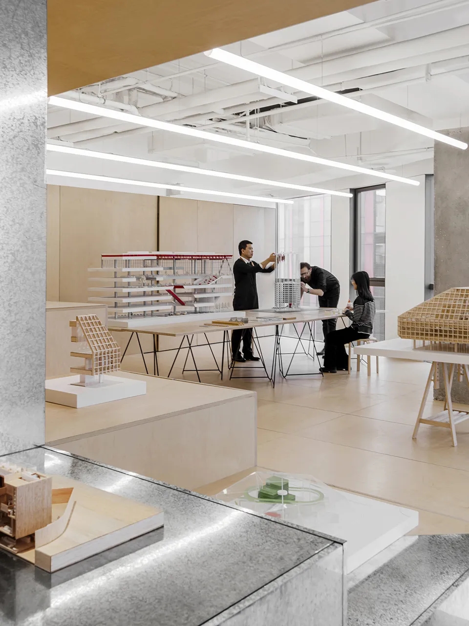 走进被镀锌板包裹天地的入口,映入眼帘的右手边为开放式办公区,左手侧为模型室,两大区域之间由一条阶梯式的展示区、前台公区及公共走廊相连结。
