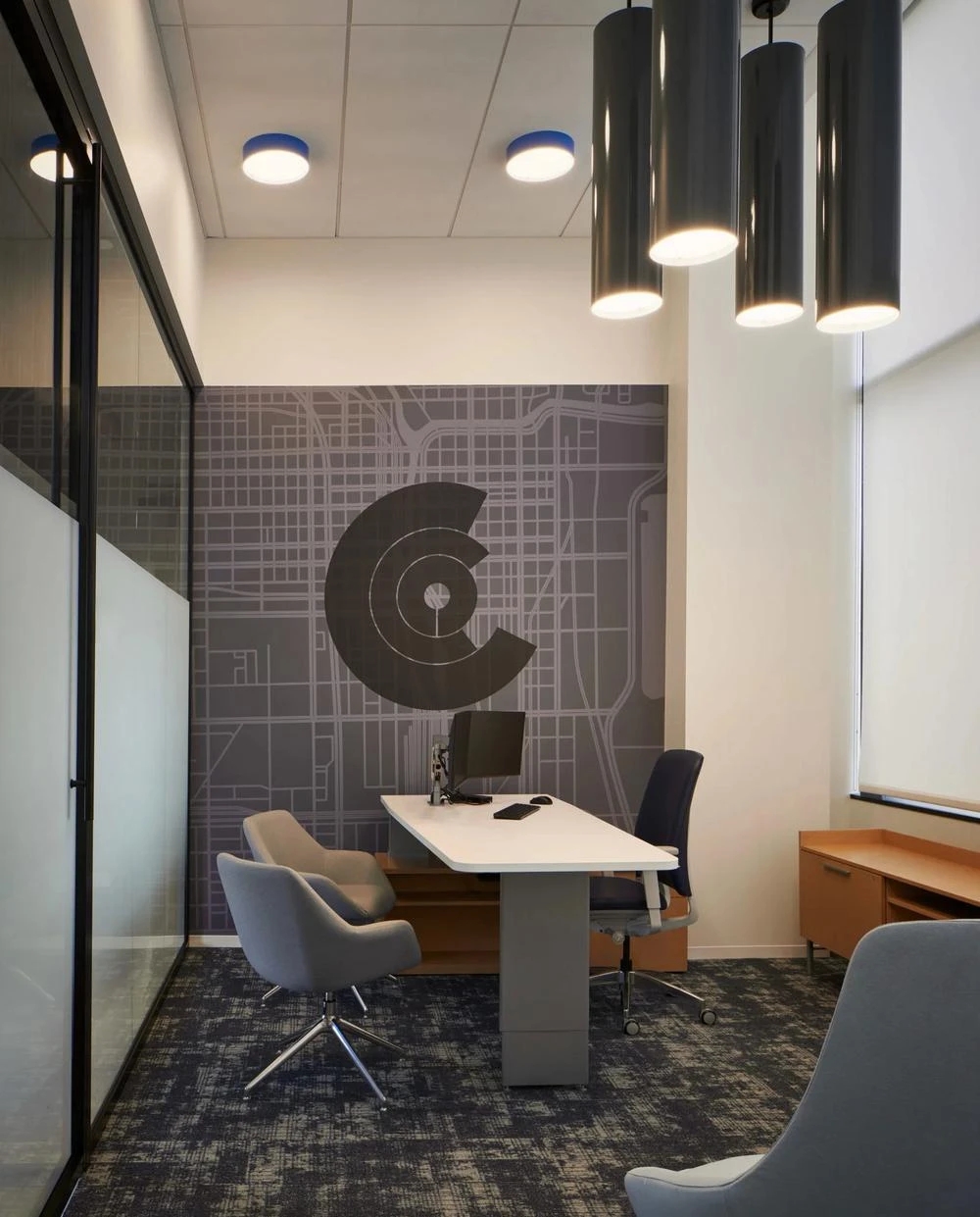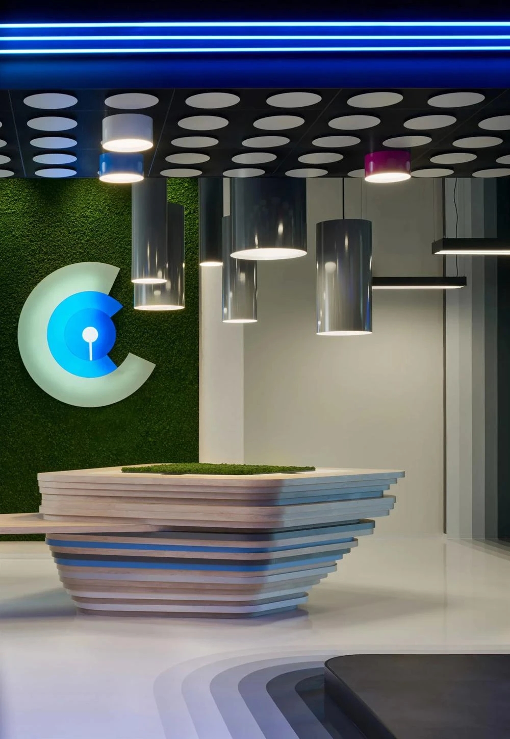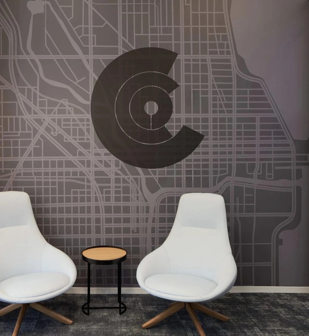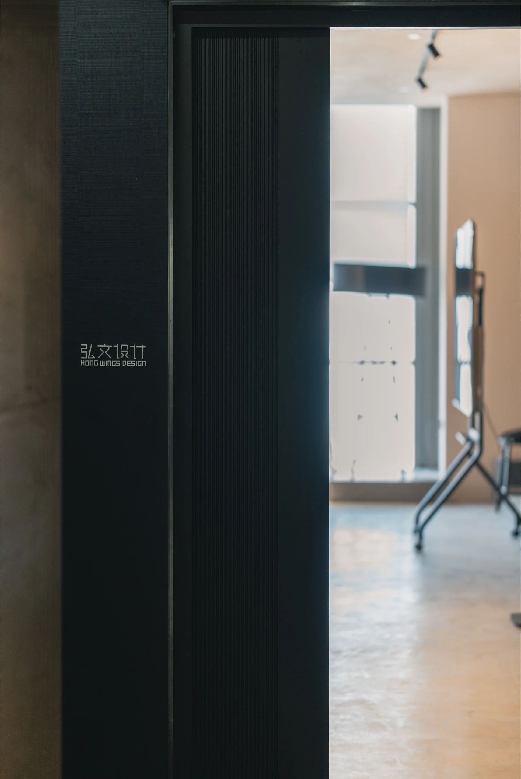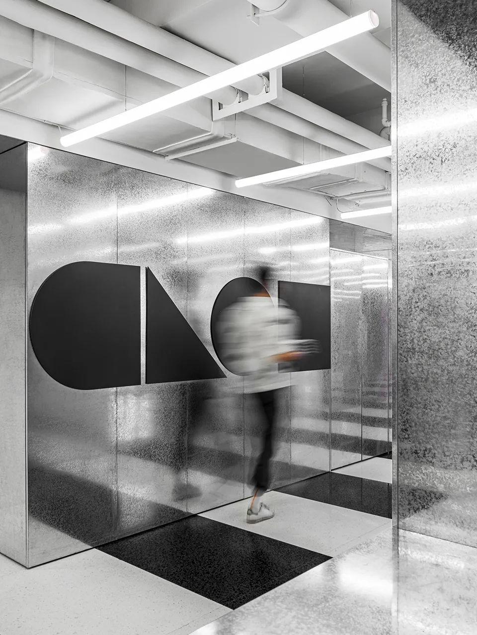 CLOU品牌的图形LOGO以各种不同材料、不同大小的形式呈现在三个区域的墙面上,黑色及银色的品牌LOGO昭示着事务所大胆的创意形象。