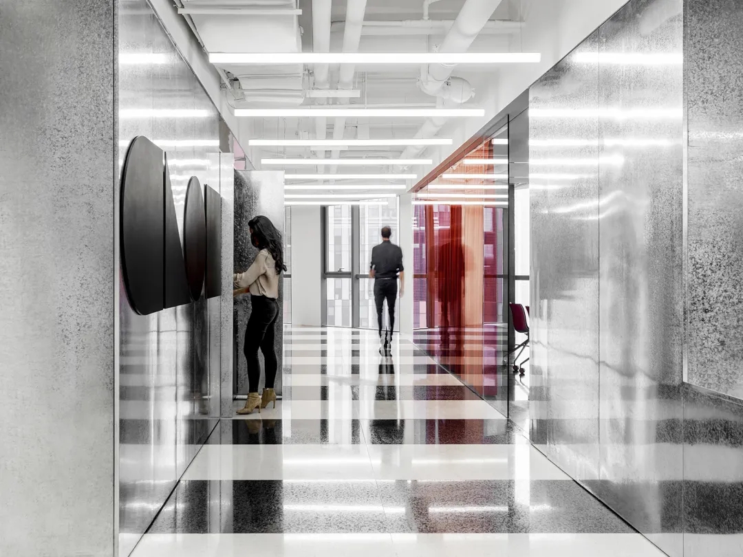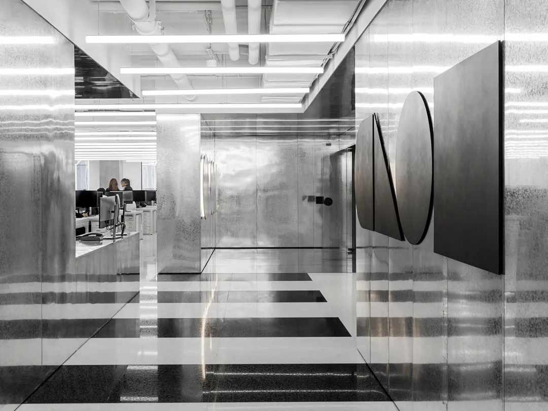 简洁流畅的几何线条勾勒划分出工作、交流、研究、展示等不同区域,标志性的银色镀锌墙环绕连结整个空间,延续、贯穿了自CLOU成立以来至今的一大室内经典特征。镀锌是一种比不锈钢经济而有效的防锈方法。不锈钢是加入微量元素后的合金板,防腐耐酸,而镀锌板是普板,在高温下200-300度下锌才会被慢慢烘烤化掉。镀锌板是表面镀有一层锌的焊接钢板,常应用于建筑、家电、车船、容器制造行业。镀锌钢进入大规模生产和应用于工业商业中已有200多年的历史了。