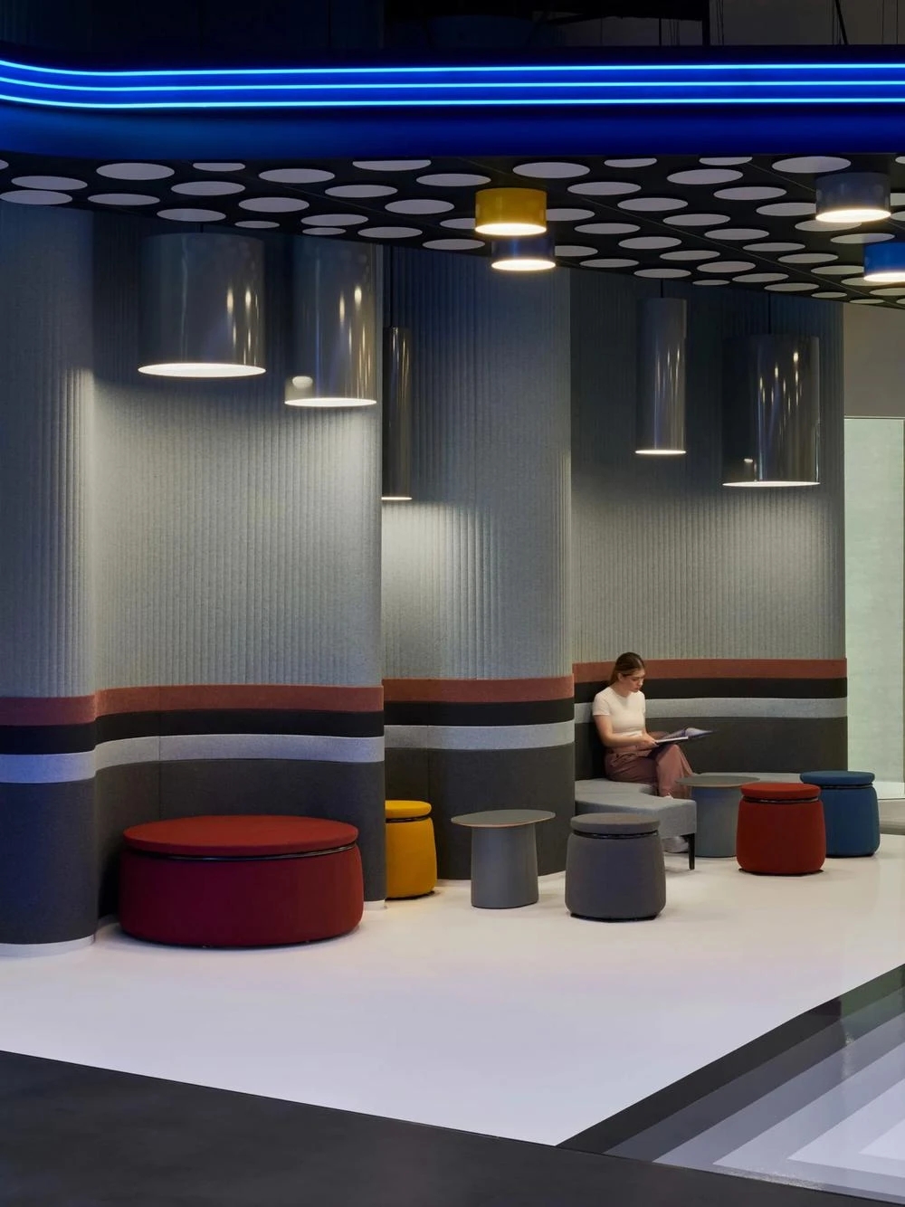 CLOU北京的每间会议空间都独具特点——各类不同的会议室穿插在明亮的开放式办公区之间,便于随时开启线上及线下会议讨论。最大的一间以超白玻璃围绕着明亮的蓝色水磨石地板,搭配温暖的橙红色幕布用于营造更加私密的探讨氛围;另外一间则以斑点绿水磨石铺地配备木制家具;东南角的一间则以全木装饰天地,宛如洞穴一般,适用于更加安静的工作和对话。