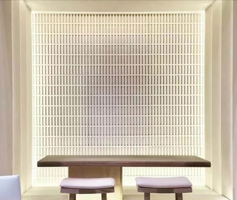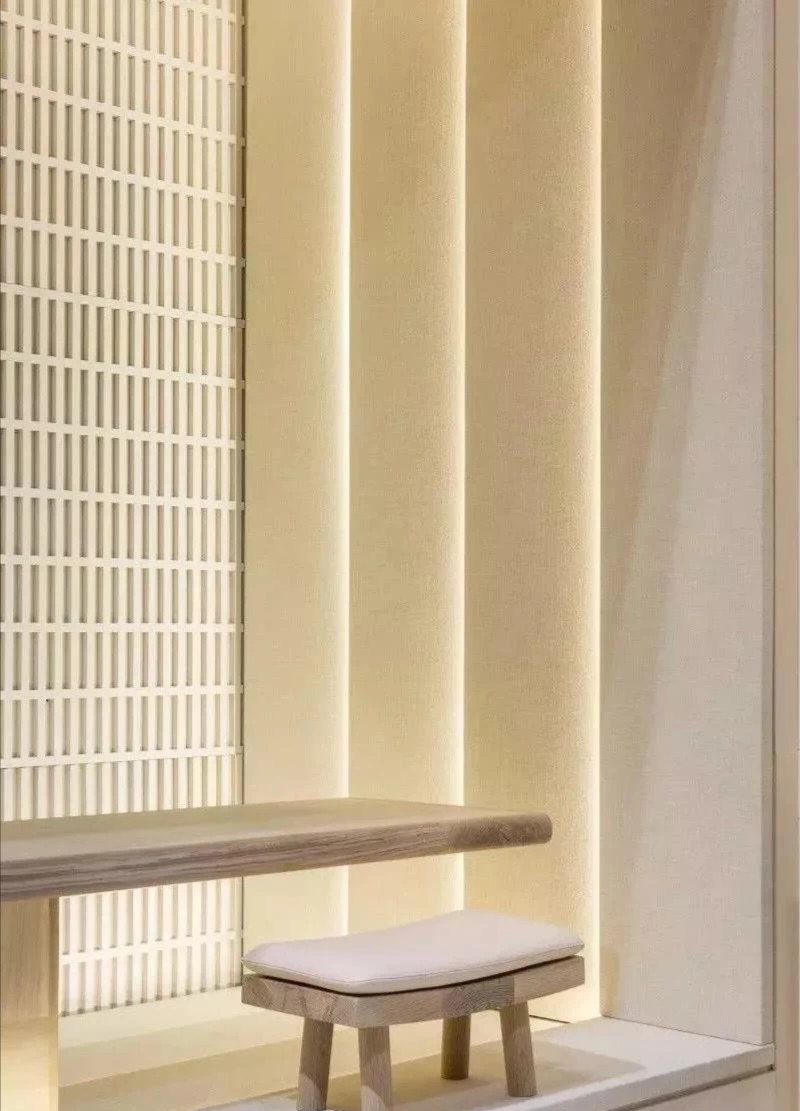前厅空间以暖色调为基调,墙身原木色与禅意装饰画的结合,线条贯穿于整个室内空间,利用线条的交错穿插建立出富有韵律感和动感的活跃空间,具有浓厚的设计感,营造出安静、优雅的空间。