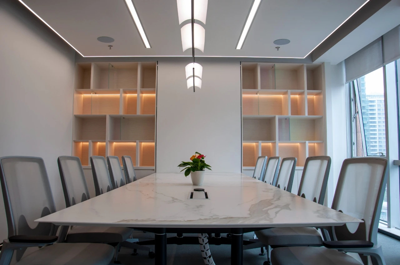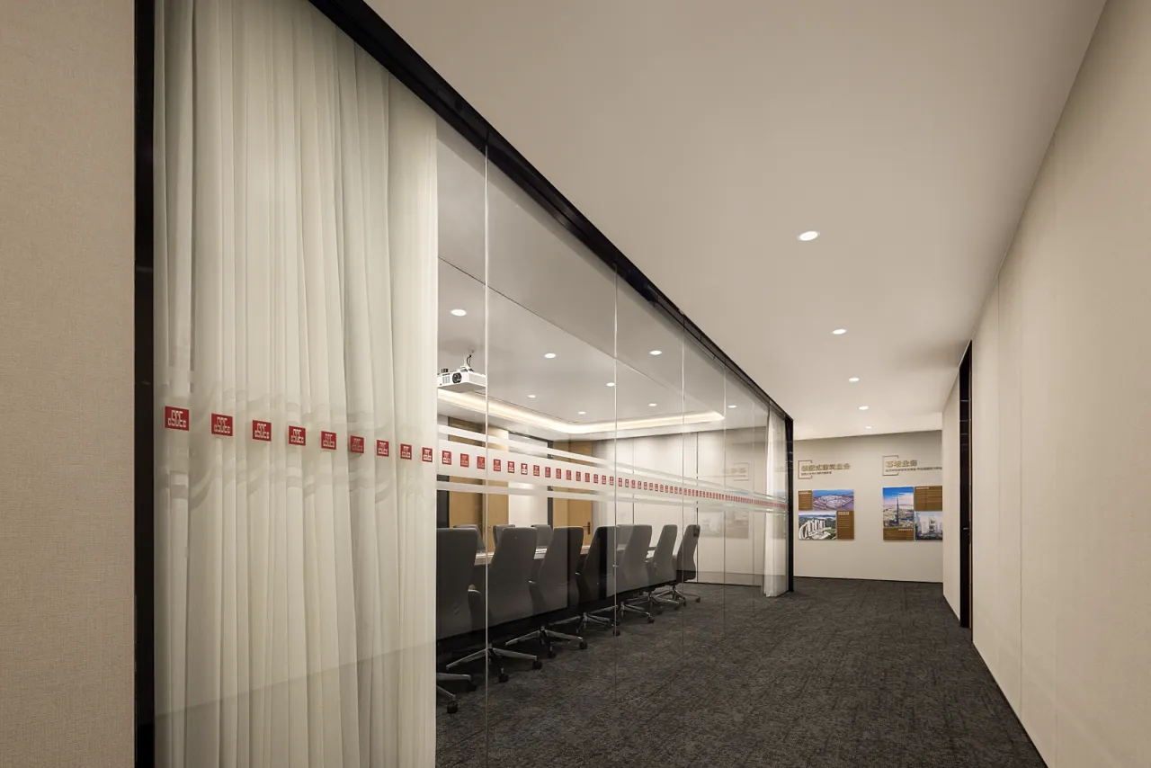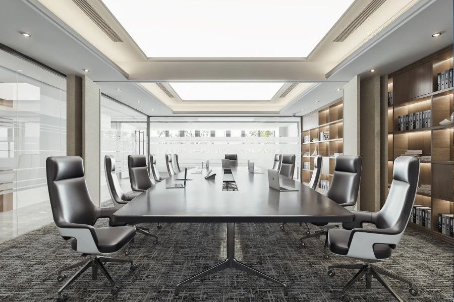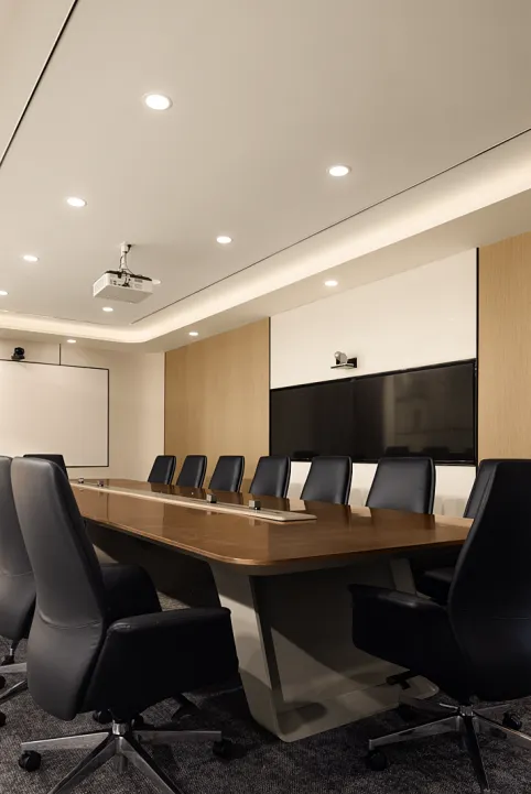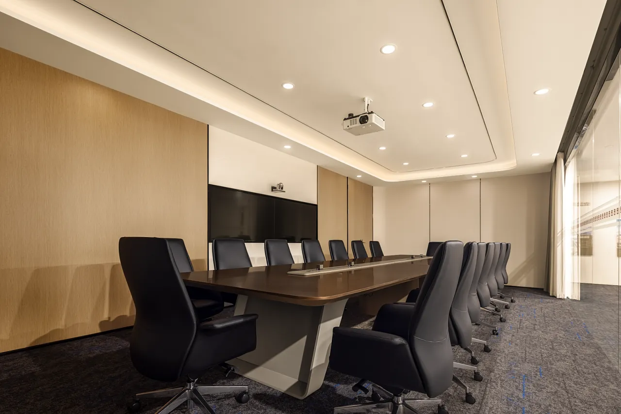 会议室 以白和灰为基调,方正硬朗、有棱有角,对称的装饰墙板,给这空间带来一些庄主大气之感,地面蓝色线条点缀增添了几许别致的情趣。