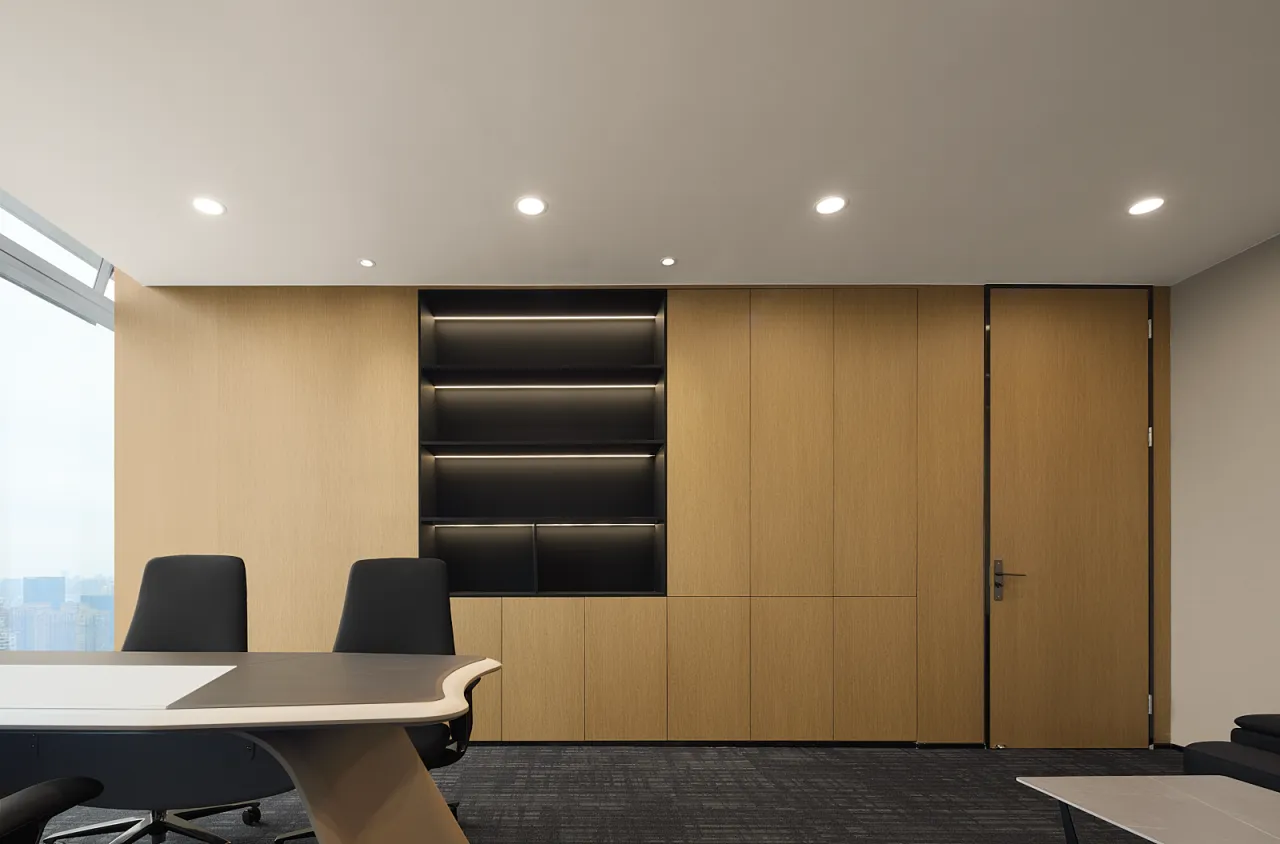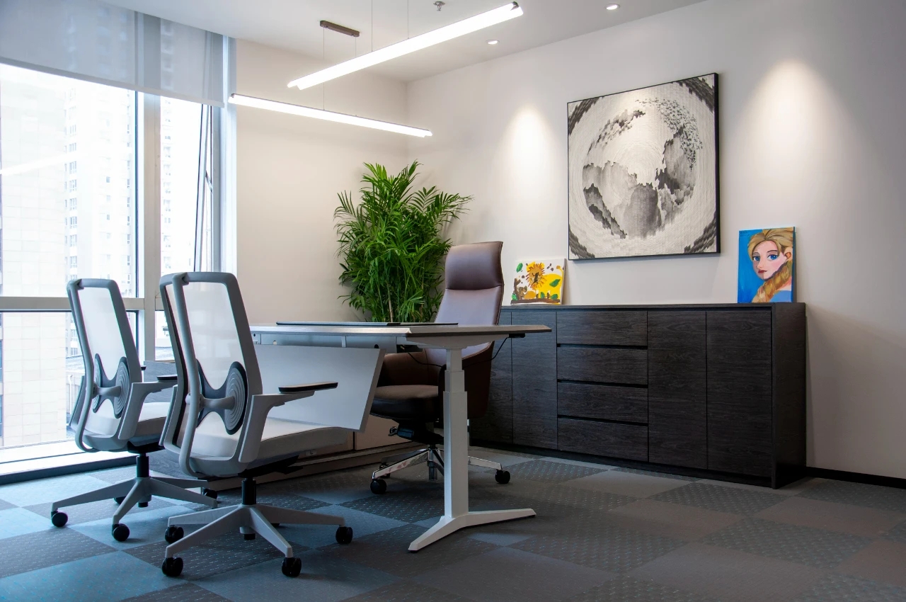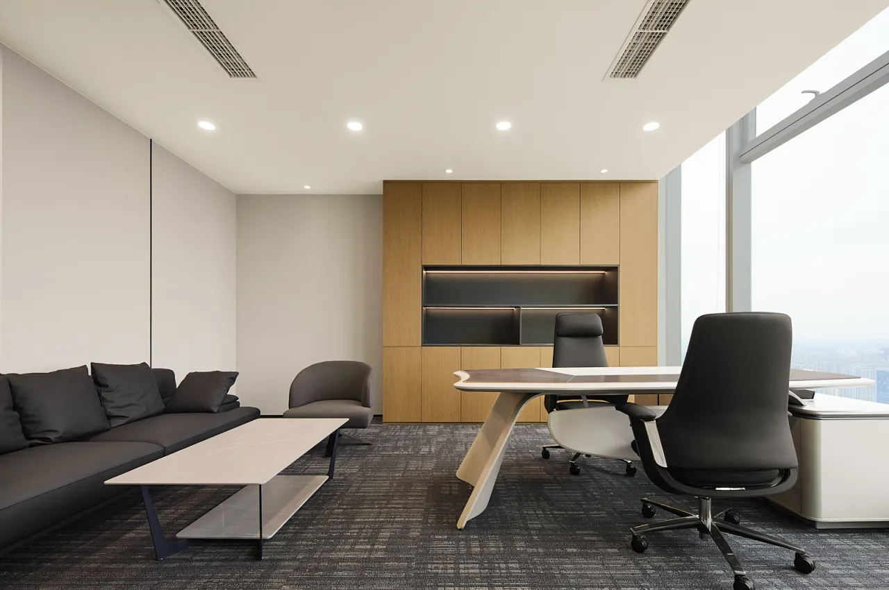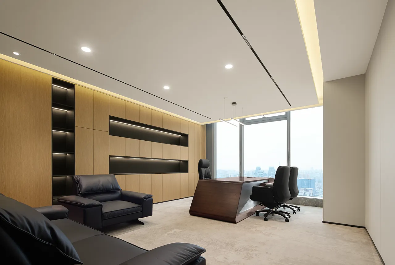 走廊尽头是领导室,几个领导室都采用了同样的家具配置,升降班台+矮柜的组合方式,其中一处房间采用了黑色胡桃木的贴皮颜色,与背景墙黑白色挂画相呼应,高柜黑白撞色设计,内嵌扣手,整体利落、科技感十足。