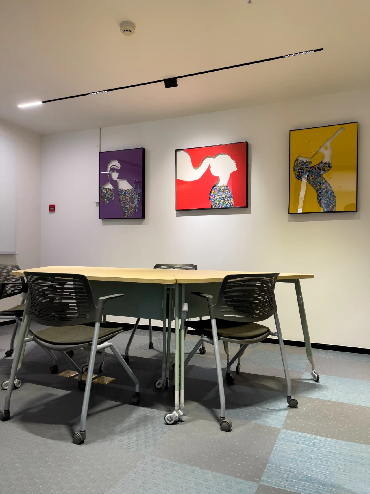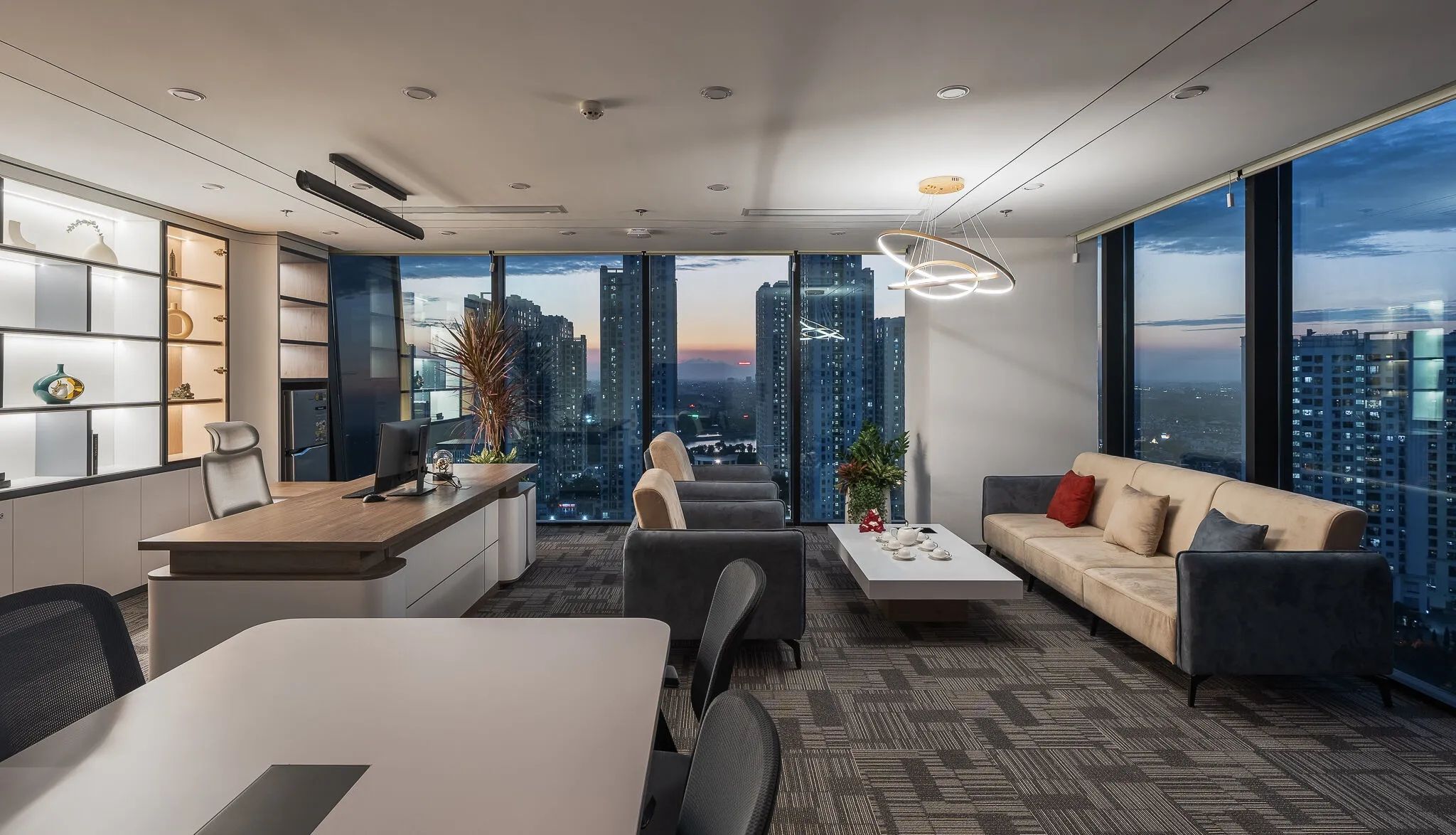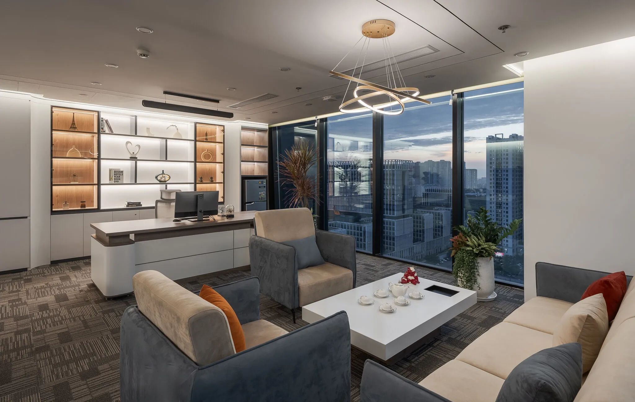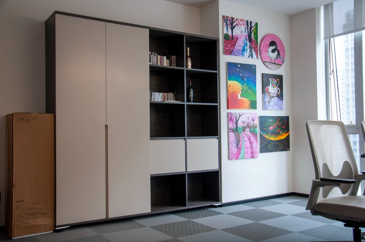 走廊尽头是领导室,几个领导室都采用了同样的家具配置,升降班台+矮柜的组合方式,其中一处房间采用了黑色胡桃木的贴皮颜色,与背景墙黑白色挂画相呼应,高柜黑白撞色设计,内嵌扣手,整体利落、科技感十足。