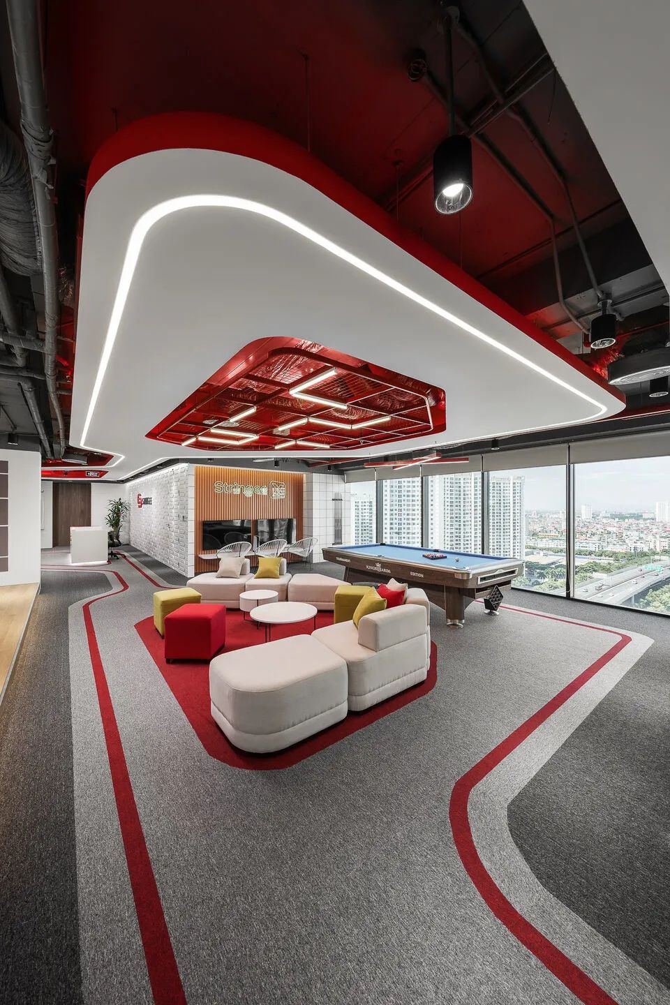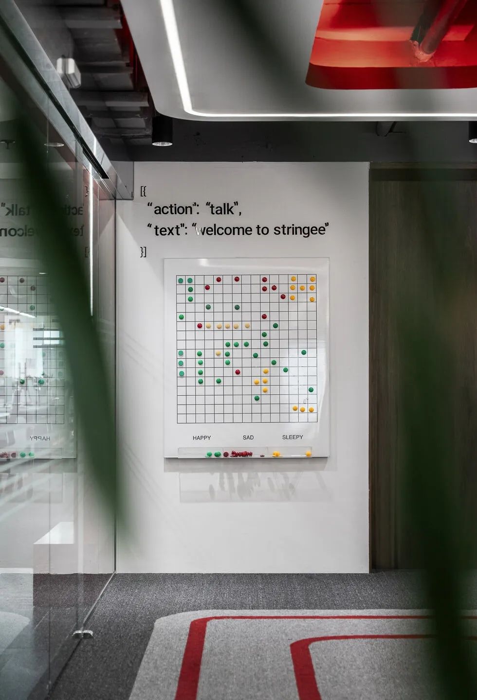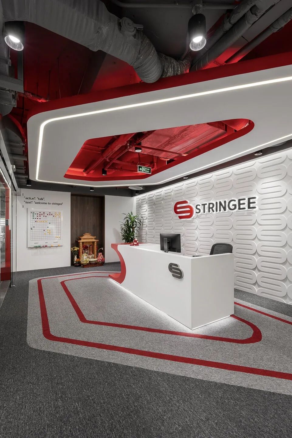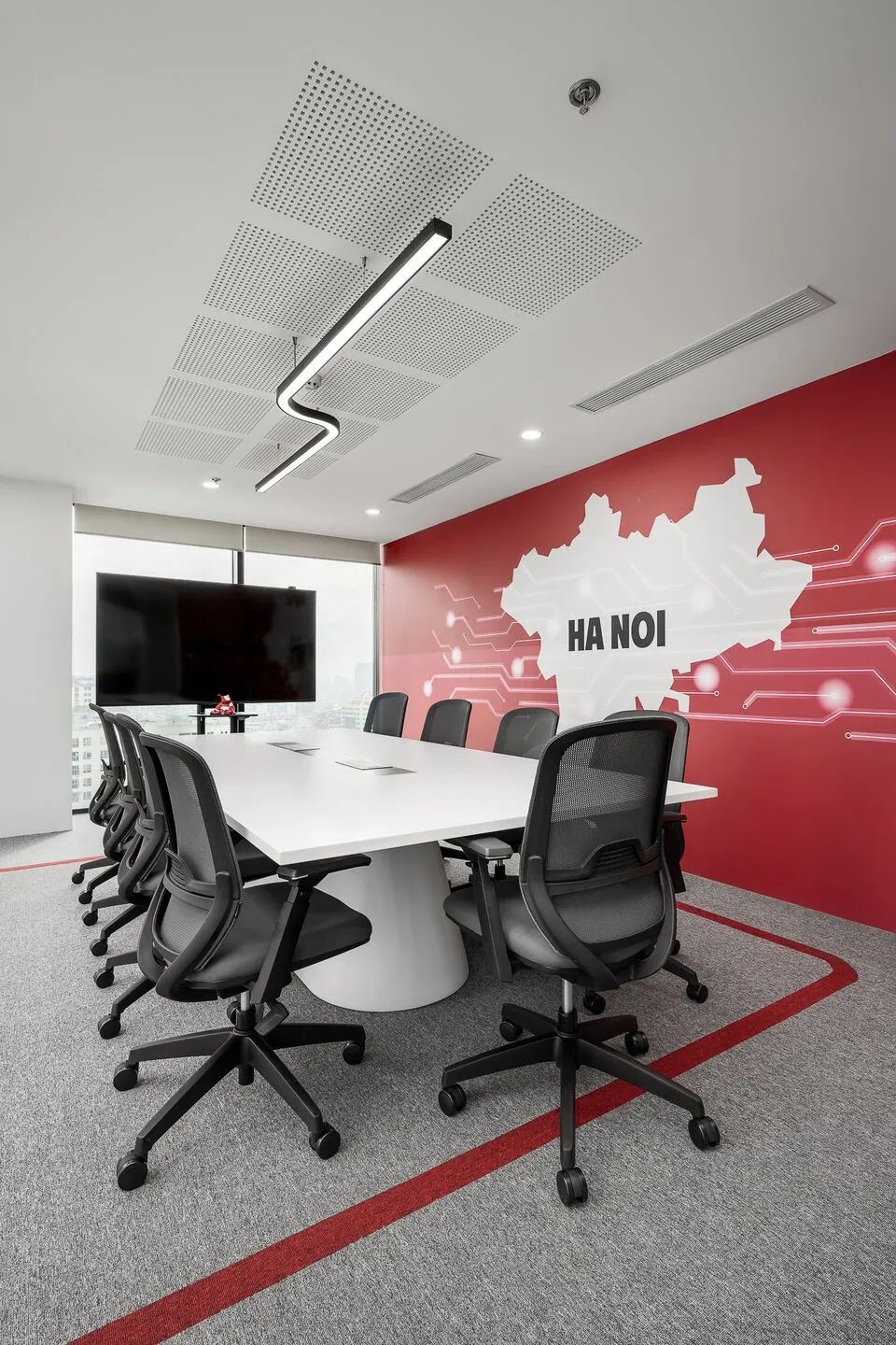 办公室的设计概念是“传输线路式办公室”,灵感来自于Stringee提供的通信API和项目的具体布局。设计师提取编程语言中的字符串,将它们设计成可视化的线条,形成了项目的关键视觉元素。为了保持空间的联系和一致性,这条线在所有办公室中不断重复出现。办公室中的众多功能区域作为节点,在传输线上接收和发送信号。