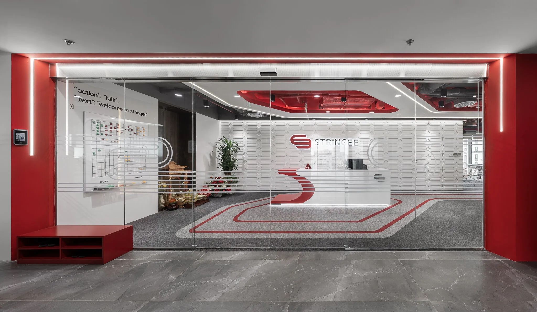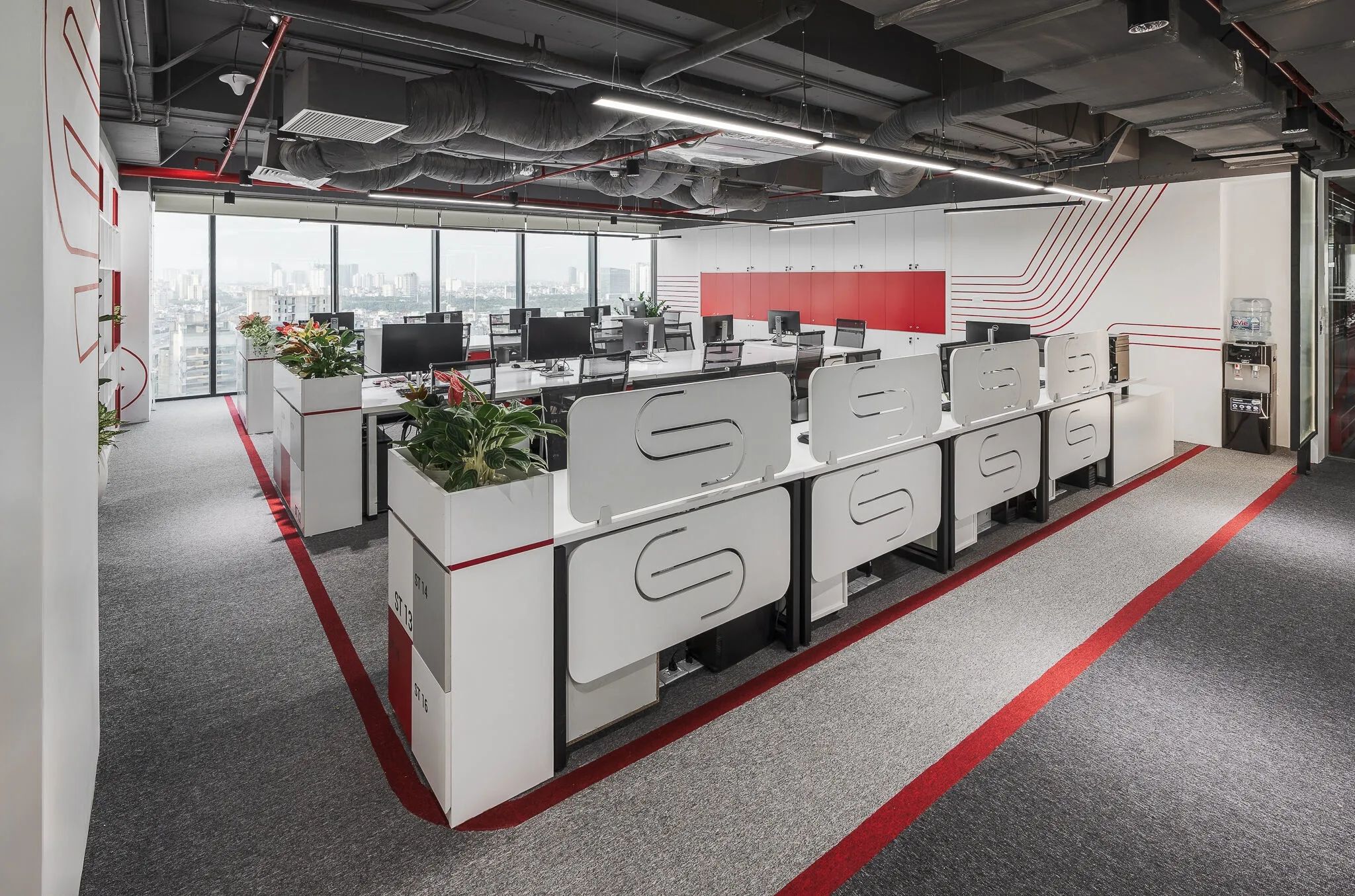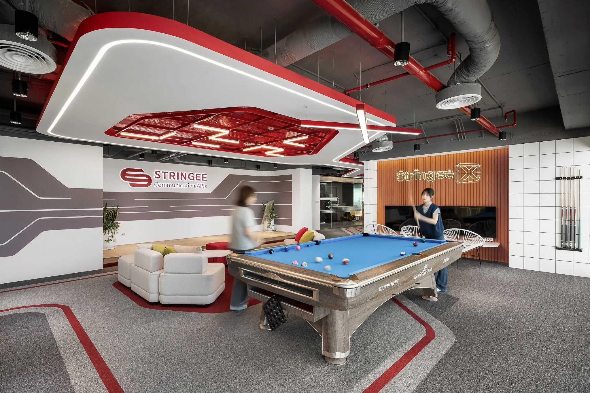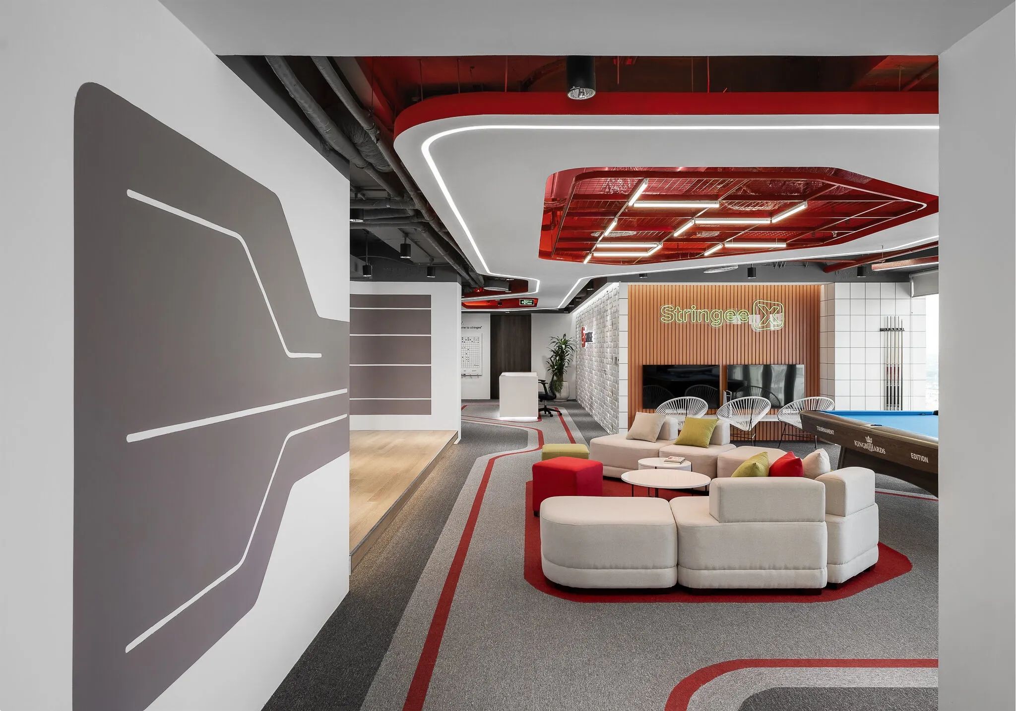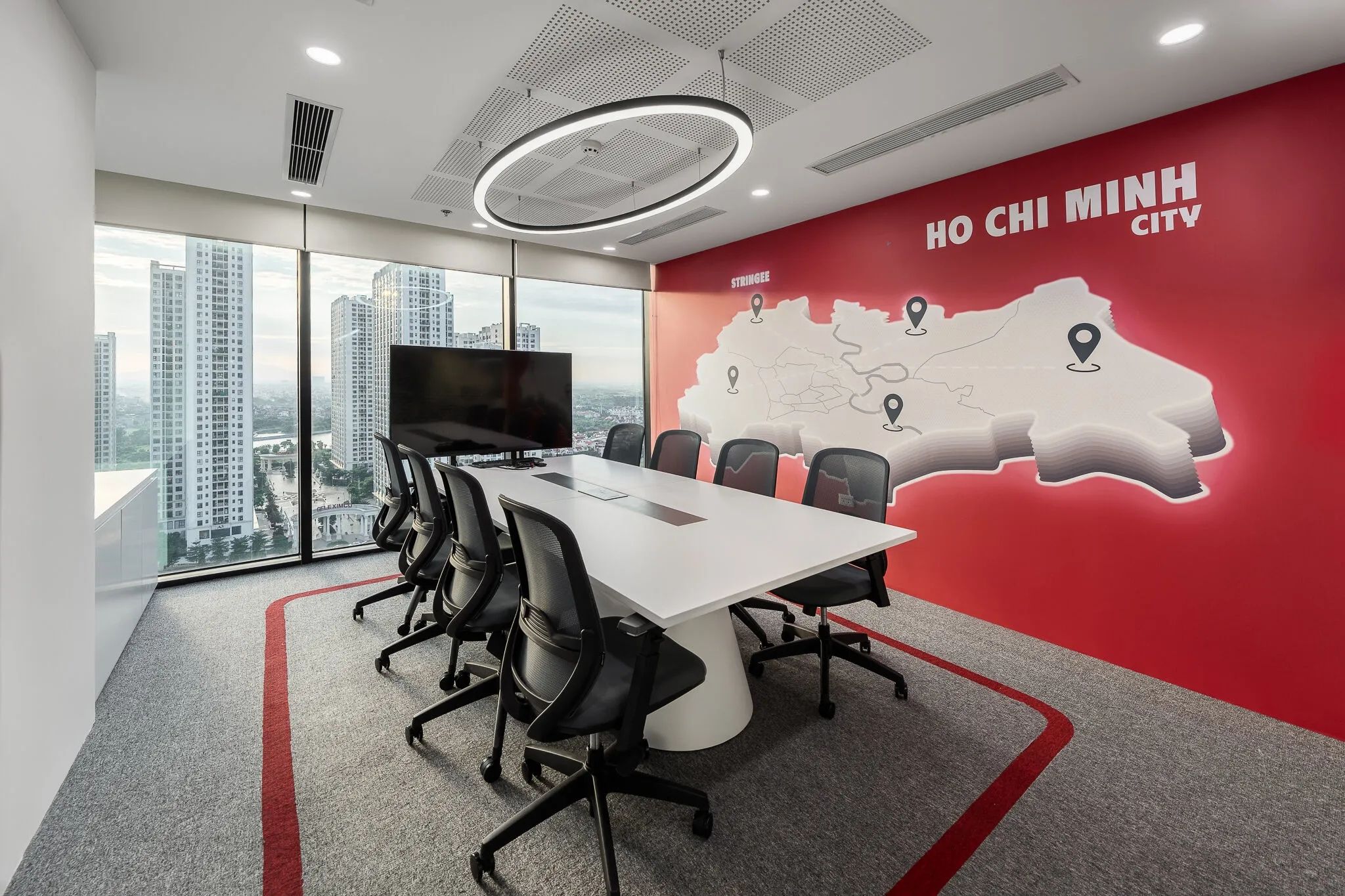 办公室的设计概念是“传输线路式办公室”,灵感来自于Stringee提供的通信API和项目的具体布局。设计师提取编程语言中的字符串,将它们设计成可视化的线条,形成了项目的关键视觉元素。为了保持空间的联系和一致性,这条线在所有办公室中不断重复出现。办公室中的众多功能区域作为节点,在传输线上接收和发送信号。