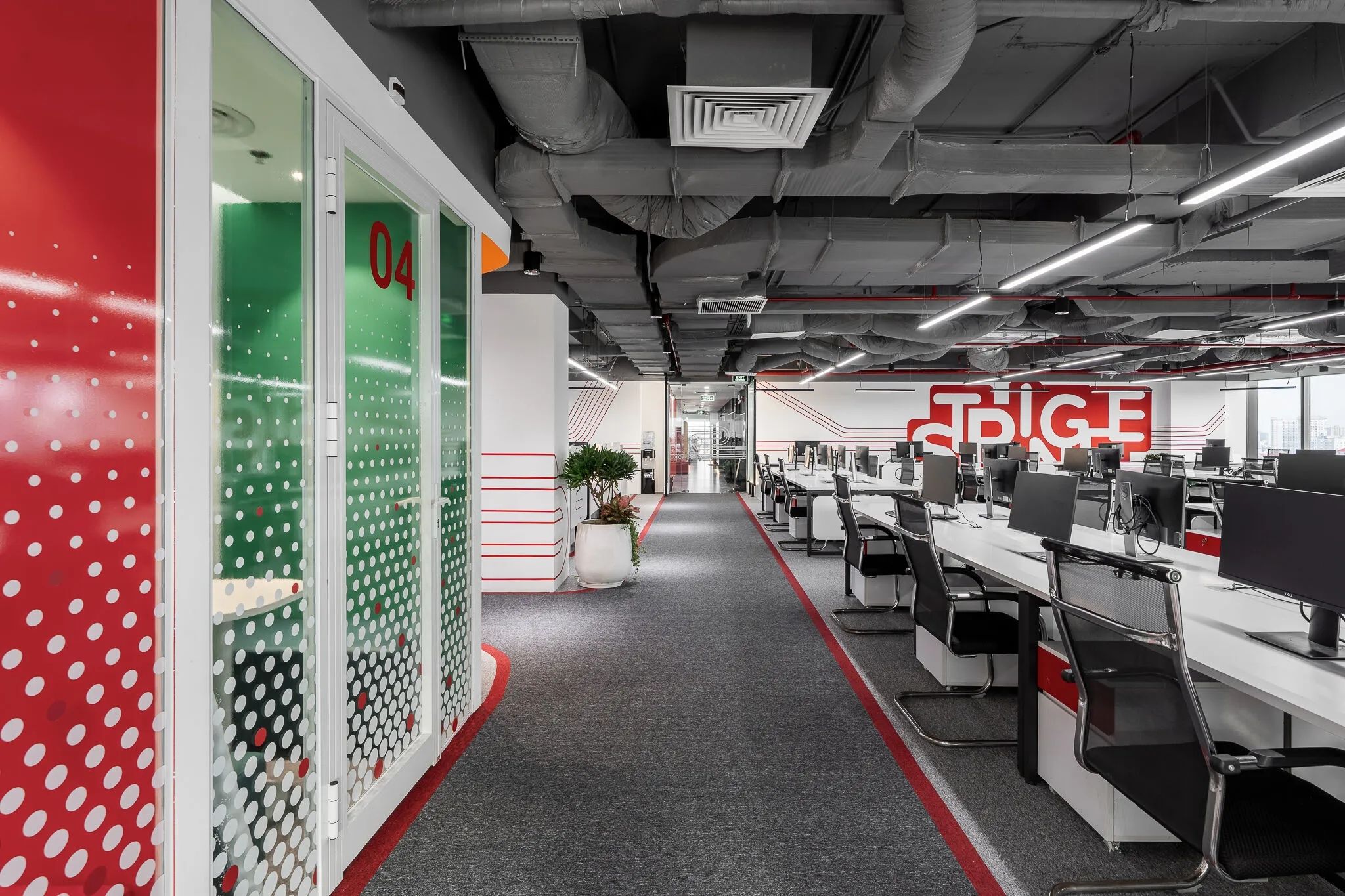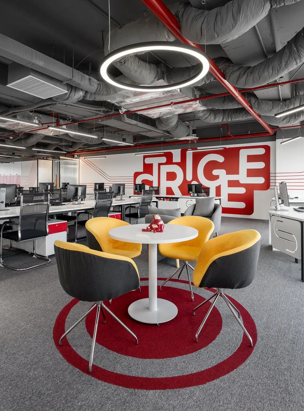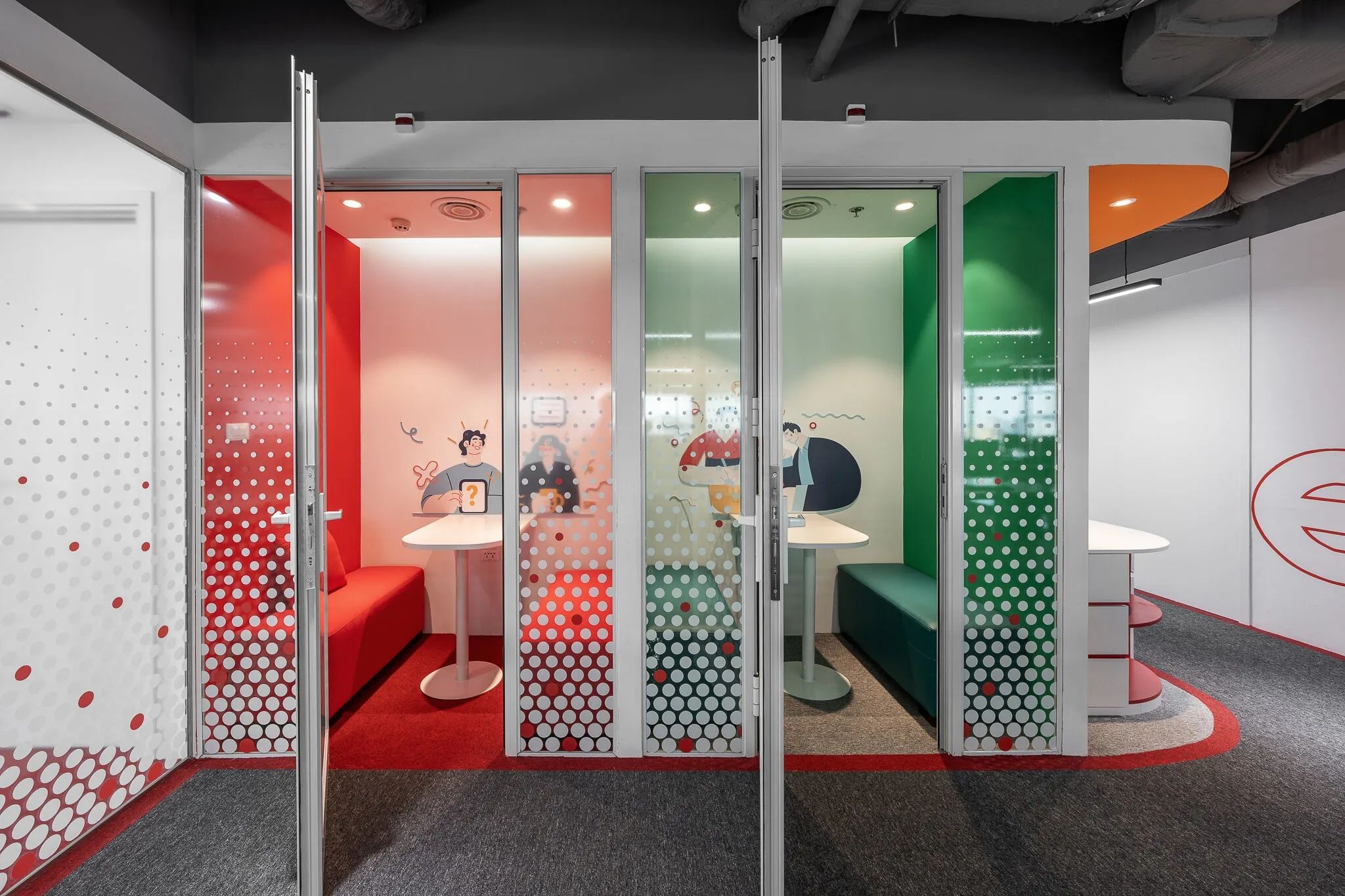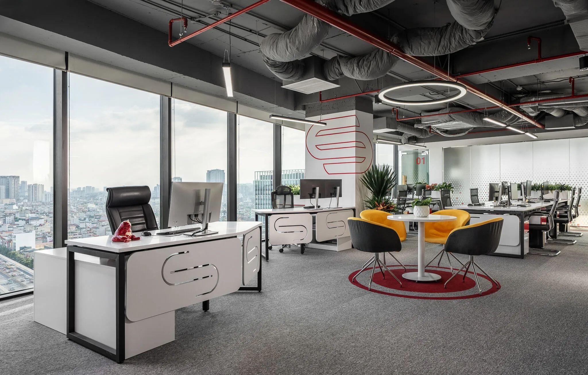 办公室的设计概念是“传输线路式办公室”,灵感来自于Stringee提供的通信API和项目的具体布局。设计师提取编程语言中的字符串,将它们设计成可视化的线条,形成了项目的关键视觉元素。为了保持空间的联系和一致性,这条线在所有办公室中不断重复出现。办公室中的众多功能区域作为节点,在传输线上接收和发送信号。