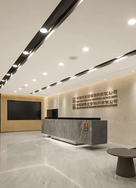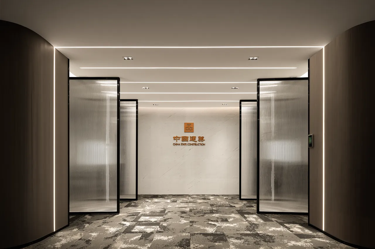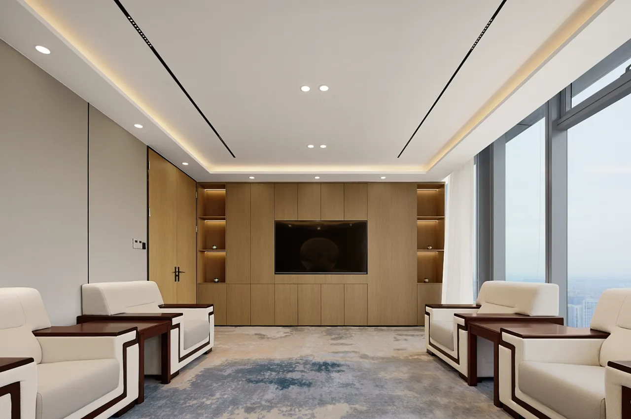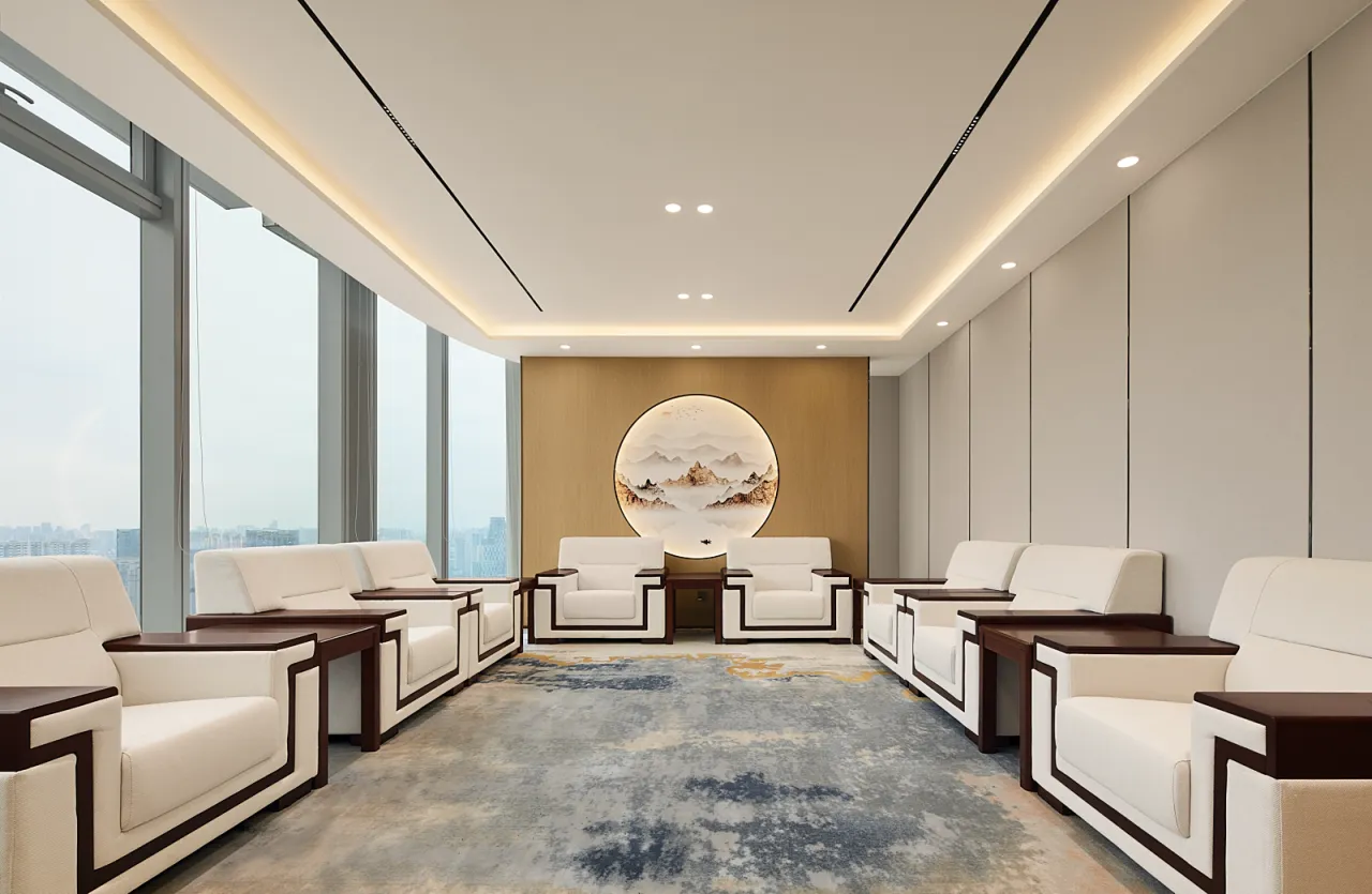 VIP接待室 直线条的造型让整个空间显得稳重大方,浅色系材料的运用延续了灵动而清澈的气韵,大方庄重却内含现代时尚。而且色调淡雅的地毯、沙发、还突出了接待厅亲切、和睦、宽松的氛围,使稳静而坦诚的晤谈气氛盎然一室。背景墙融汇方圆曲直,体现出天地圆融、世界大同的理想境界和人文意识。