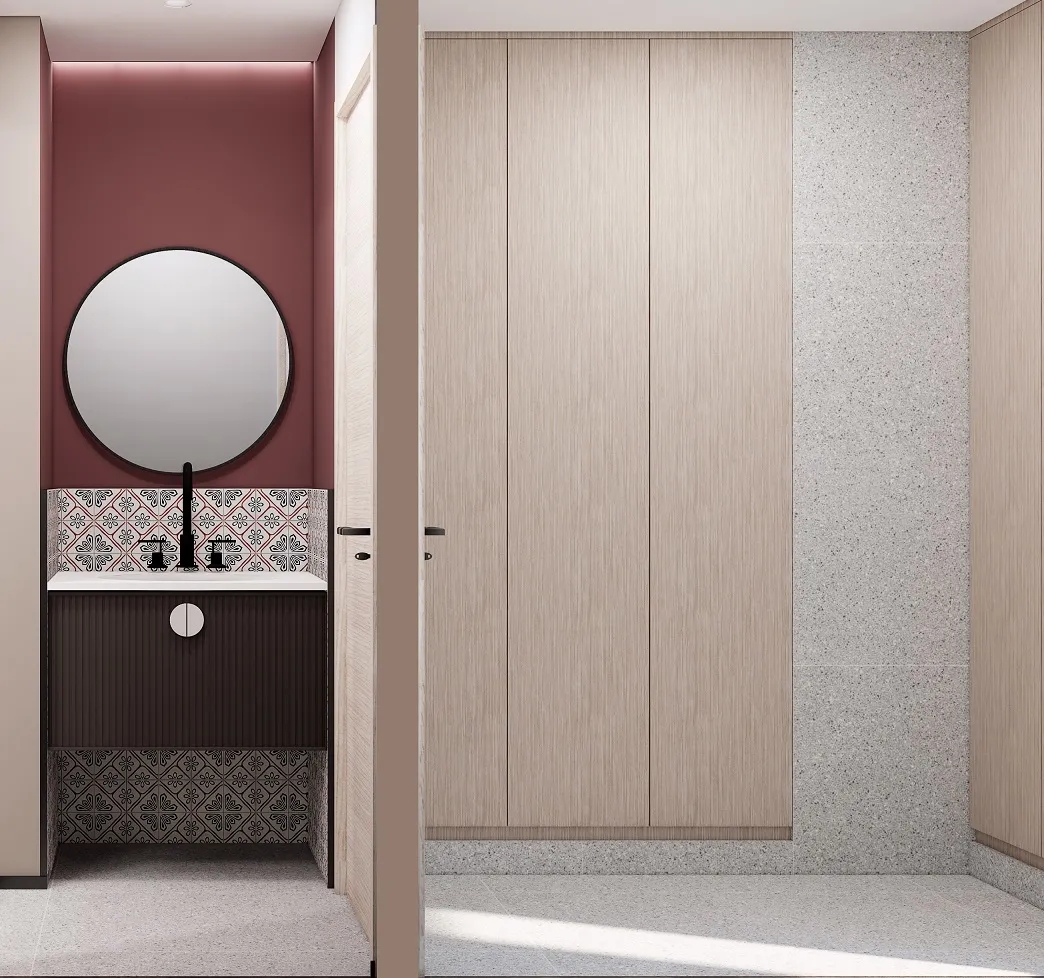 原来的卫生间里宽大的洗手台和马桶在一起,利用率非常低。现在将卫生间改为干湿分离,即方便了员工的使用,也满足了疫情期间消杀防疫的需求。 公司倡导健身文化,大部分员工都会在办公室放置健身用品,原来都堆放在开放式工位区域,显得非常杂乱。现在利用独立卫生间的内部空间定制了储藏柜,专门用来存放员工的健身用品。空间利用率大大提高,整体空间也更加整洁。