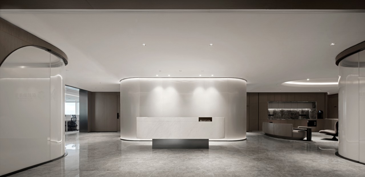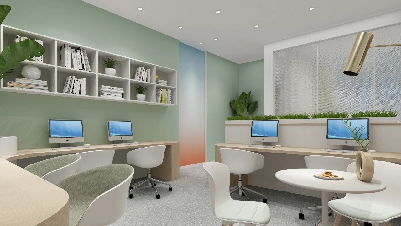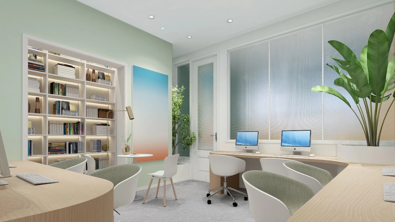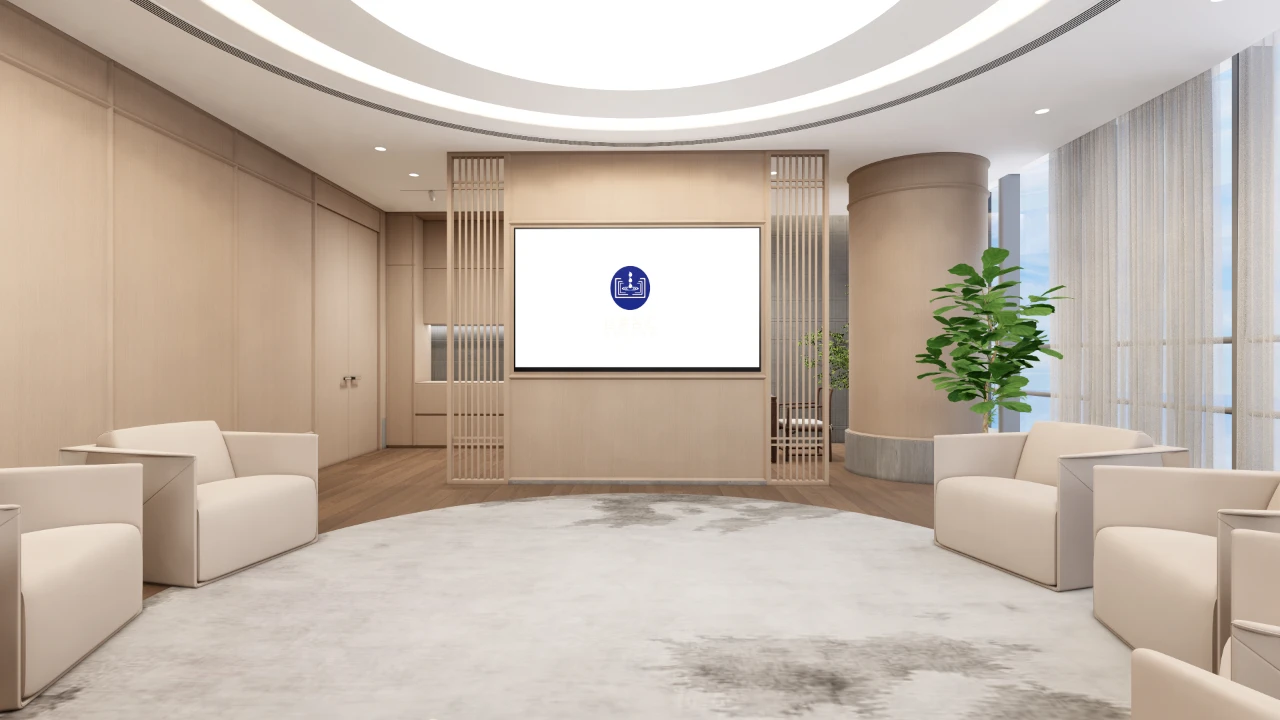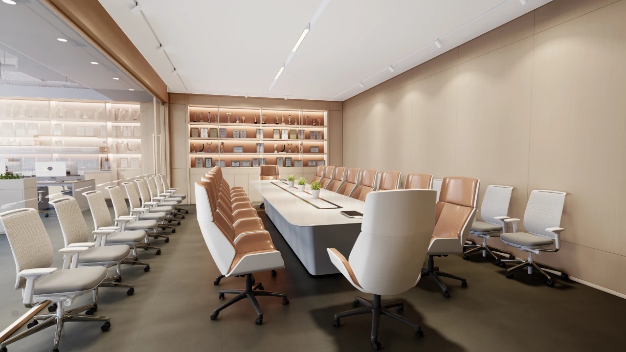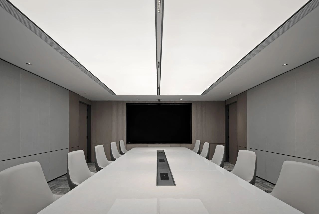 利用调整经理室和财务室后的空间,我们设计了一个小型会议室。会议室南面采用半墙玻璃隔断加镂空墙体设计,将南侧的自然光引进室内。我们将背景墙用弧面造型一直延伸到顶面。让空间有纵向的延伸感。原来堆放在玄关的饮水机,微波炉和电冰箱被收纳入会议室侧柜,除了开会之外,这里平时也可以作为员工的活动室。