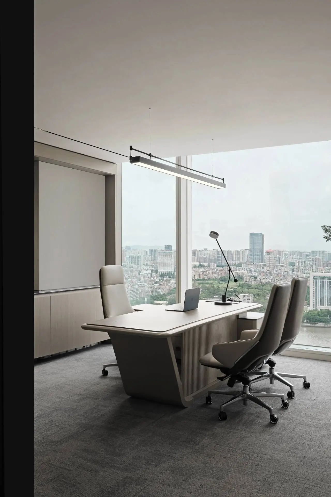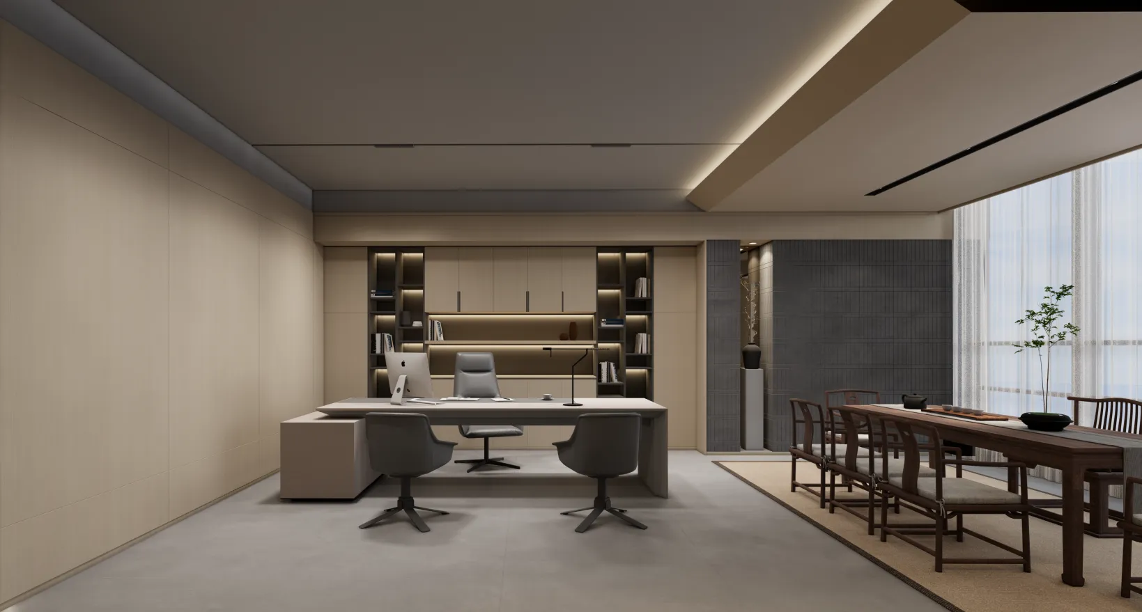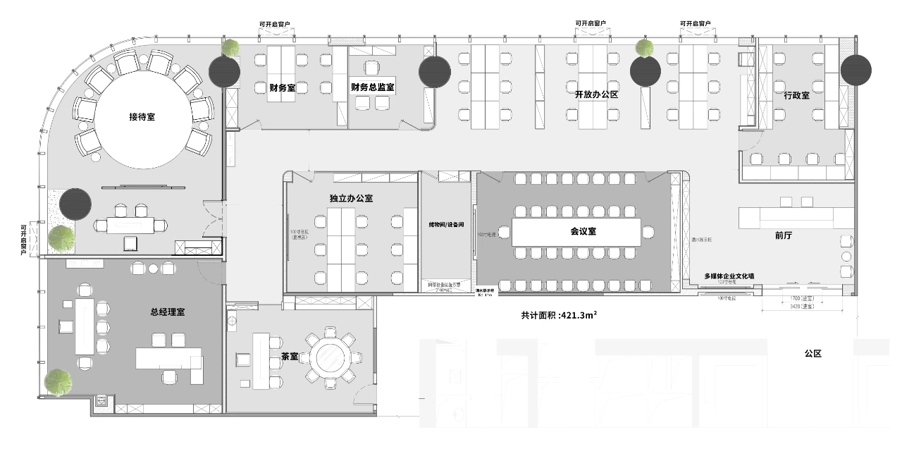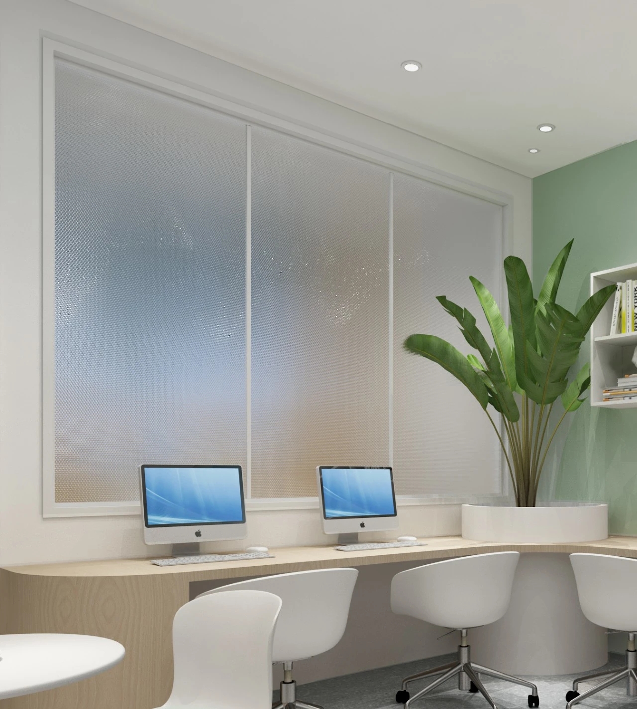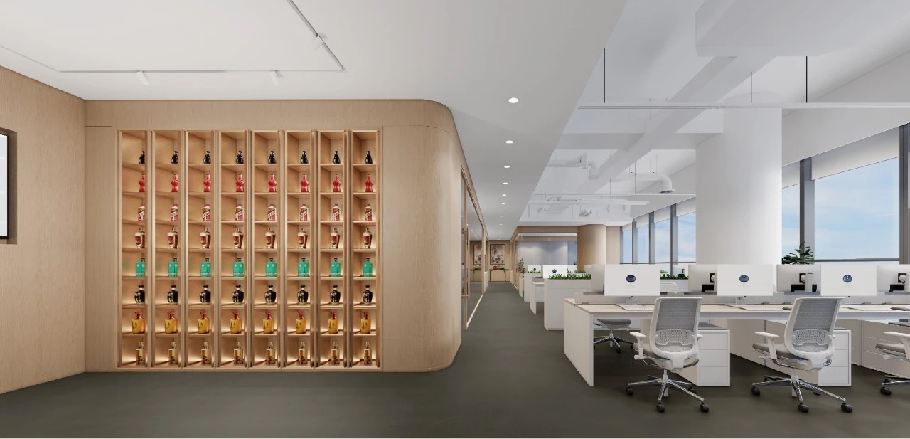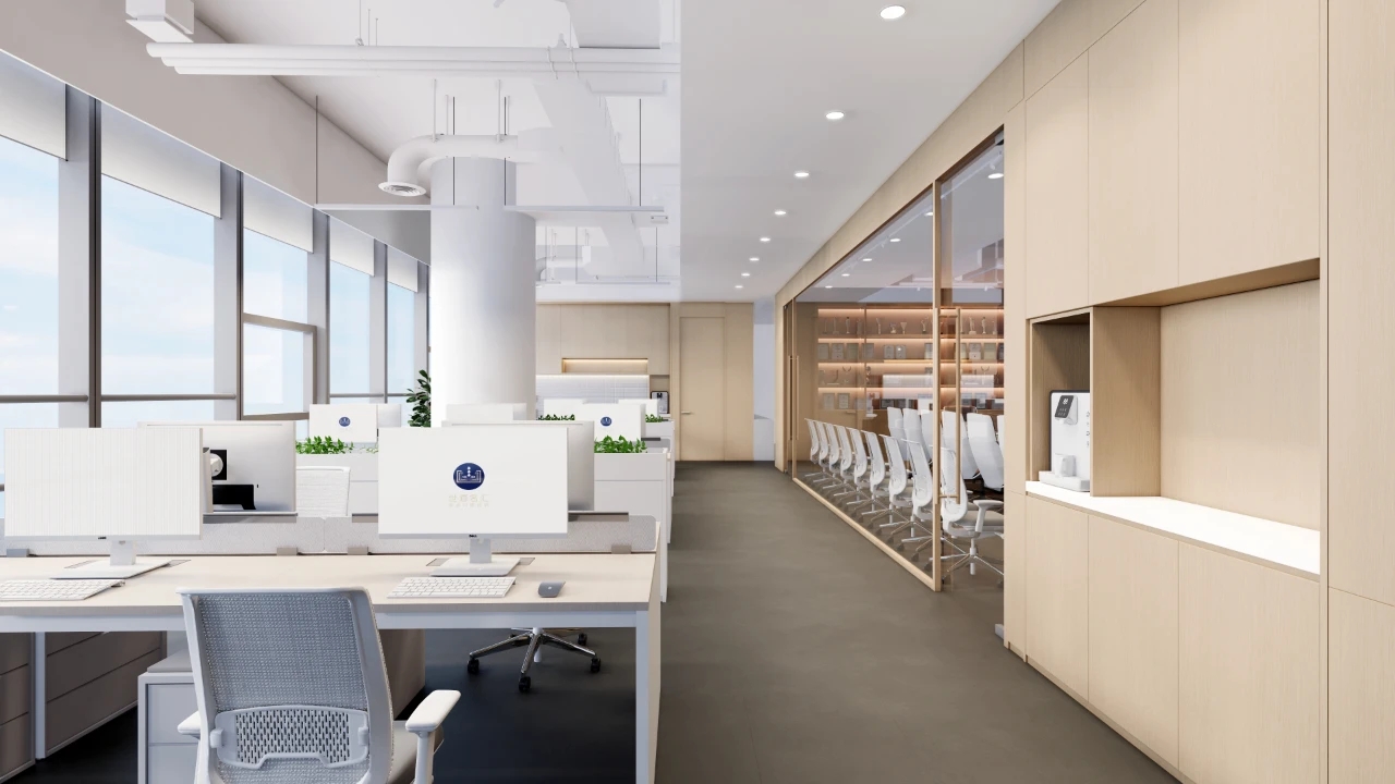 利用调整经理室和财务室后的空间,我们设计了一个小型会议室。会议室南面采用半墙玻璃隔断加镂空墙体设计,将南侧的自然光引进室内。我们将背景墙用弧面造型一直延伸到顶面。让空间有纵向的延伸感。原来堆放在玄关的饮水机,微波炉和电冰箱被收纳入会议室侧柜,除了开会之外,这里平时也可以作为员工的活动室。