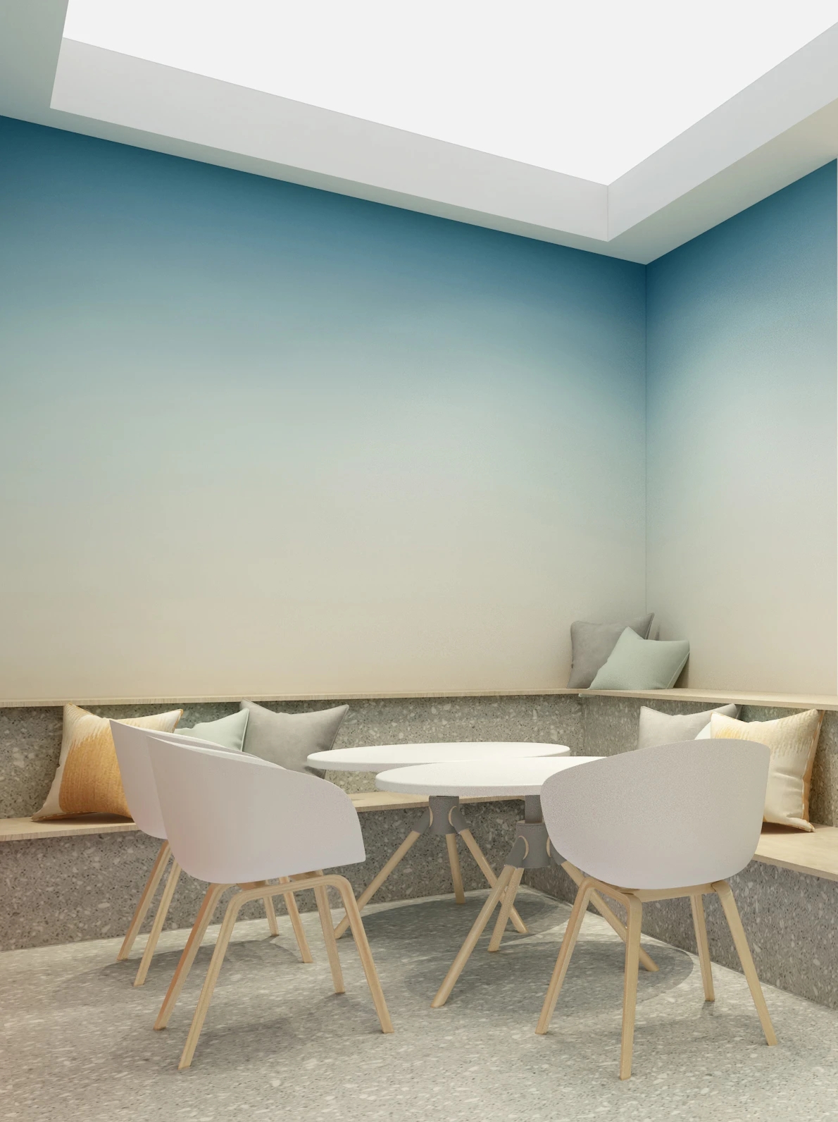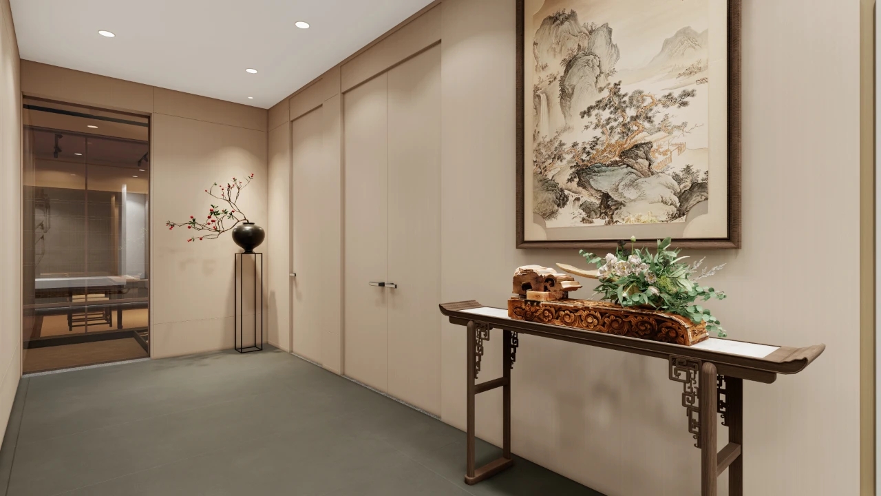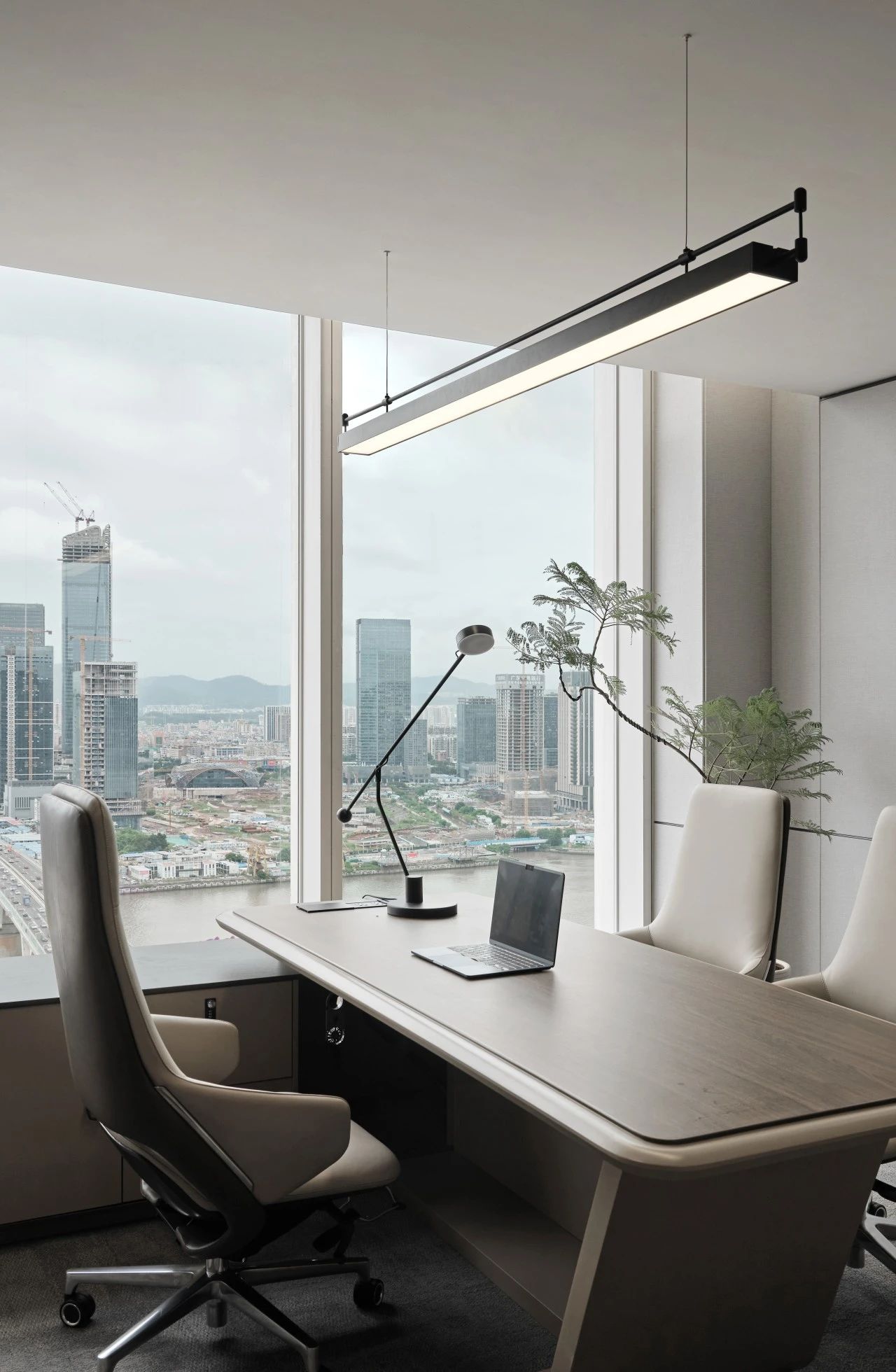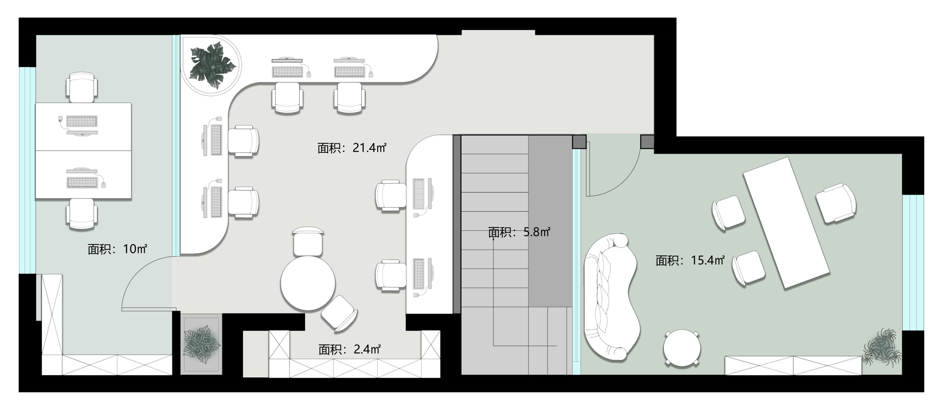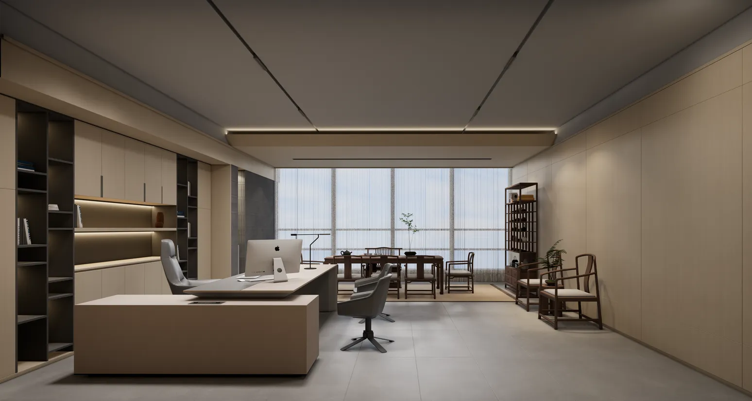 利用调整经理室和财务室后的空间,我们设计了一个小型会议室。会议室南面采用半墙玻璃隔断加镂空墙体设计,将南侧的自然光引进室内。我们将背景墙用弧面造型一直延伸到顶面。让空间有纵向的延伸感。原来堆放在玄关的饮水机,微波炉和电冰箱被收纳入会议室侧柜,除了开会之外,这里平时也可以作为员工的活动室。