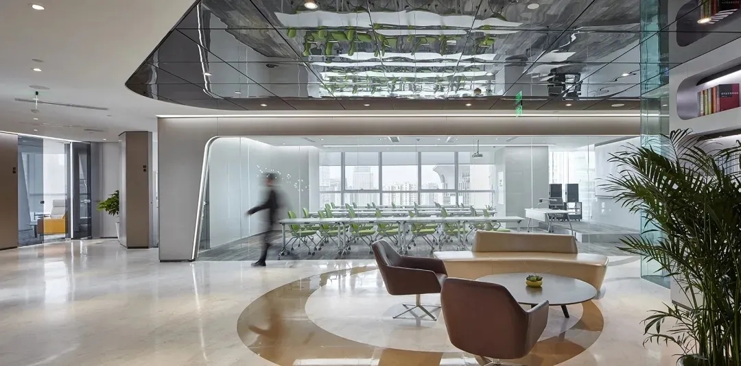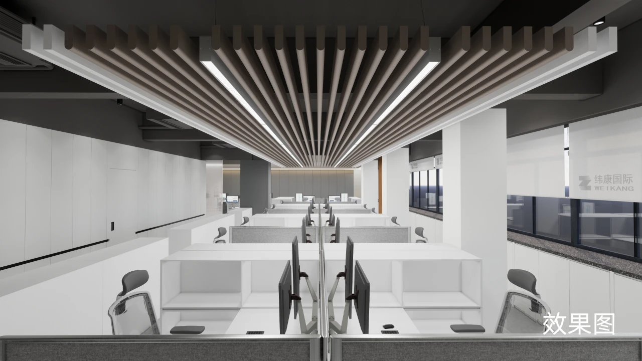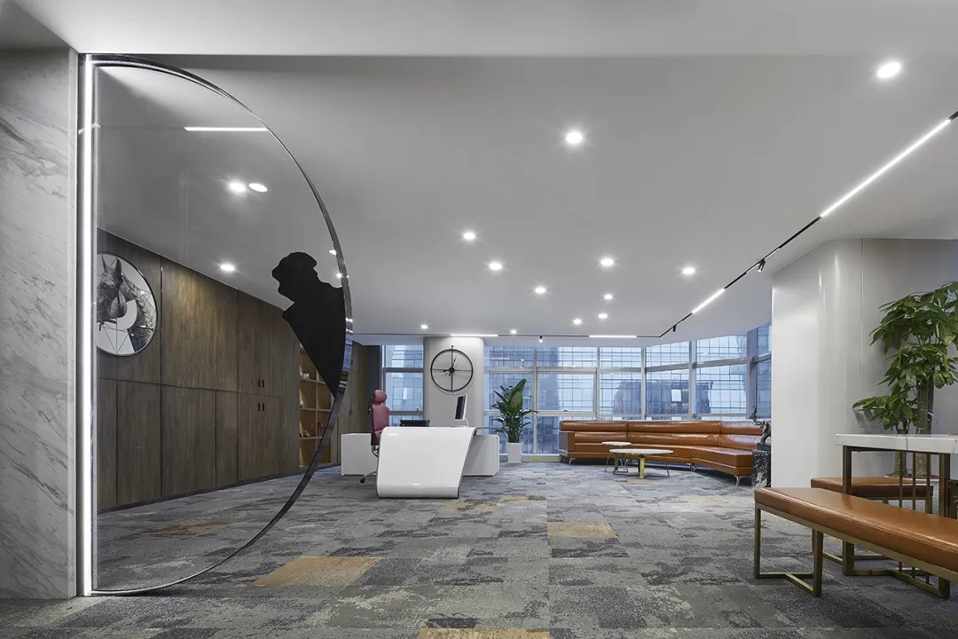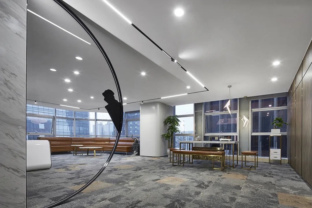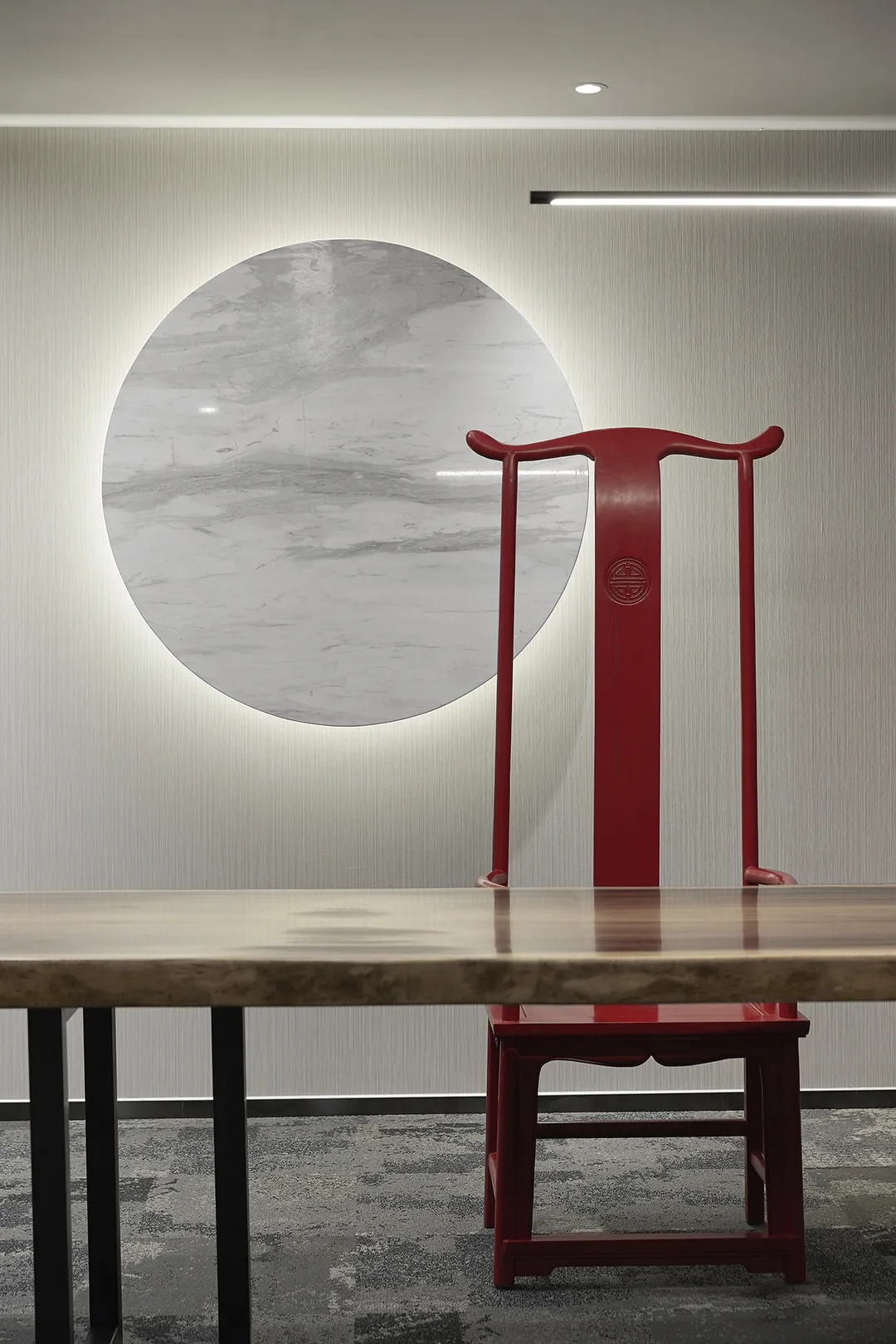 董事长办公室是彰显企业领导风格定位,体现公司形象,表达企业文化价值的一个重要办公场所,因此整体空间设计师还是沿用现代、简约、大气的风格为主。纬康的企业文化中,每个人都有作画的习惯,中间会议桌也是近几年他们一直在绘画中使用的,在甲方的要求下利旧使用,也算是对该公司企业文化的一种传承。为迎合员工经常在此画画的需求,天花板使用灯光软膜作为主体光源意在模仿自然光,墙面采用烤漆玻璃加毛毡板形式,方便董事长在会议中书写及做决策等使用。