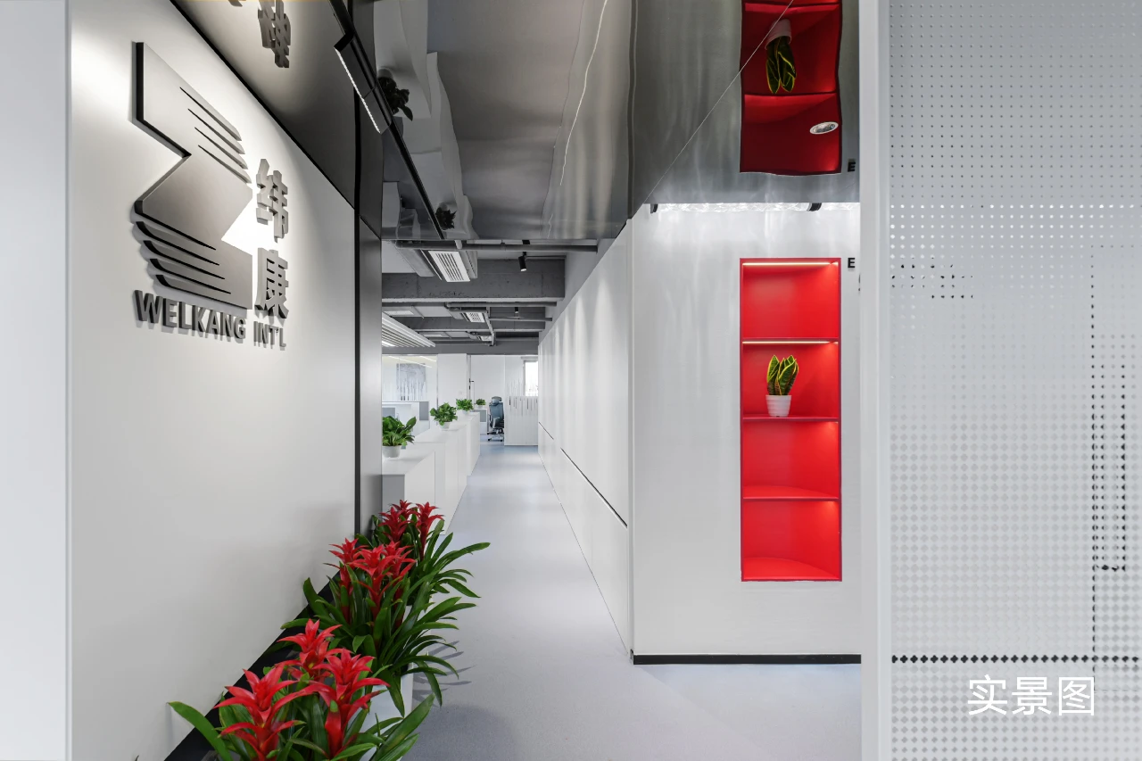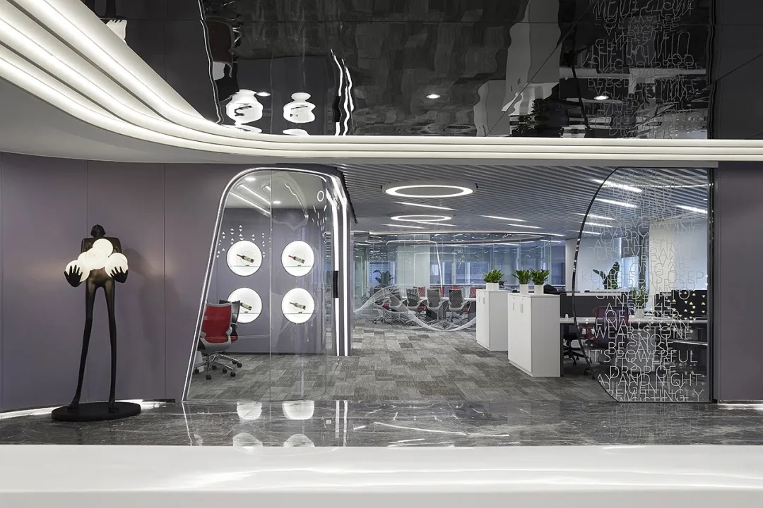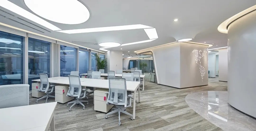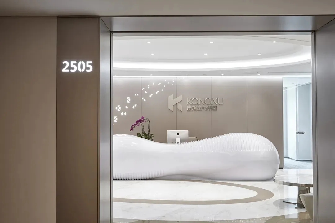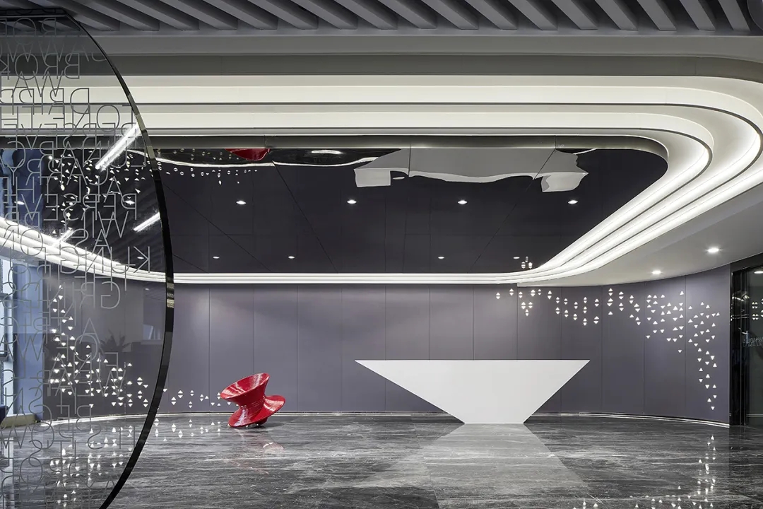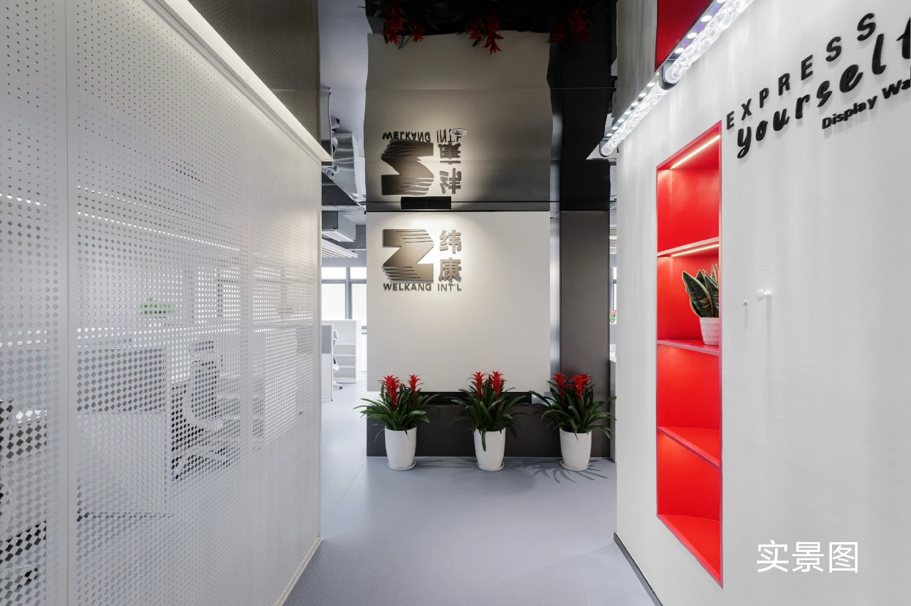 董事长办公室是彰显企业领导风格定位,体现公司形象,表达企业文化价值的一个重要办公场所,因此整体空间设计师还是沿用现代、简约、大气的风格为主。纬康的企业文化中,每个人都有作画的习惯,中间会议桌也是近几年他们一直在绘画中使用的,在甲方的要求下利旧使用,也算是对该公司企业文化的一种传承。为迎合员工经常在此画画的需求,天花板使用灯光软膜作为主体光源意在模仿自然光,墙面采用烤漆玻璃加毛毡板形式,方便董事长在会议中书写及做决策等使用。