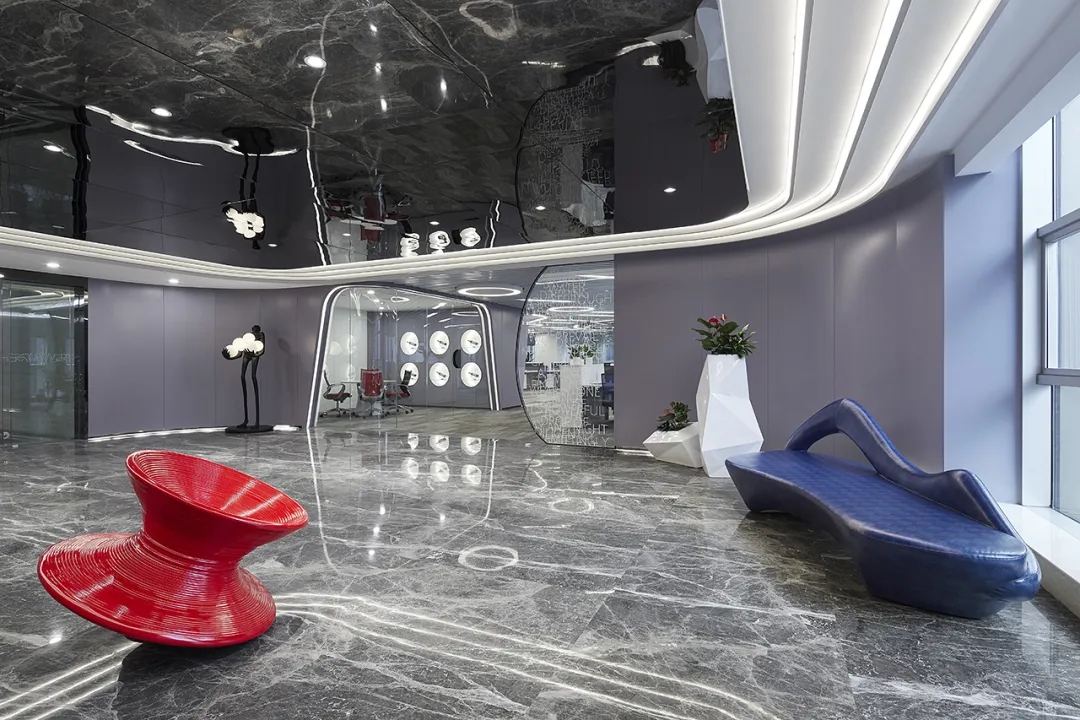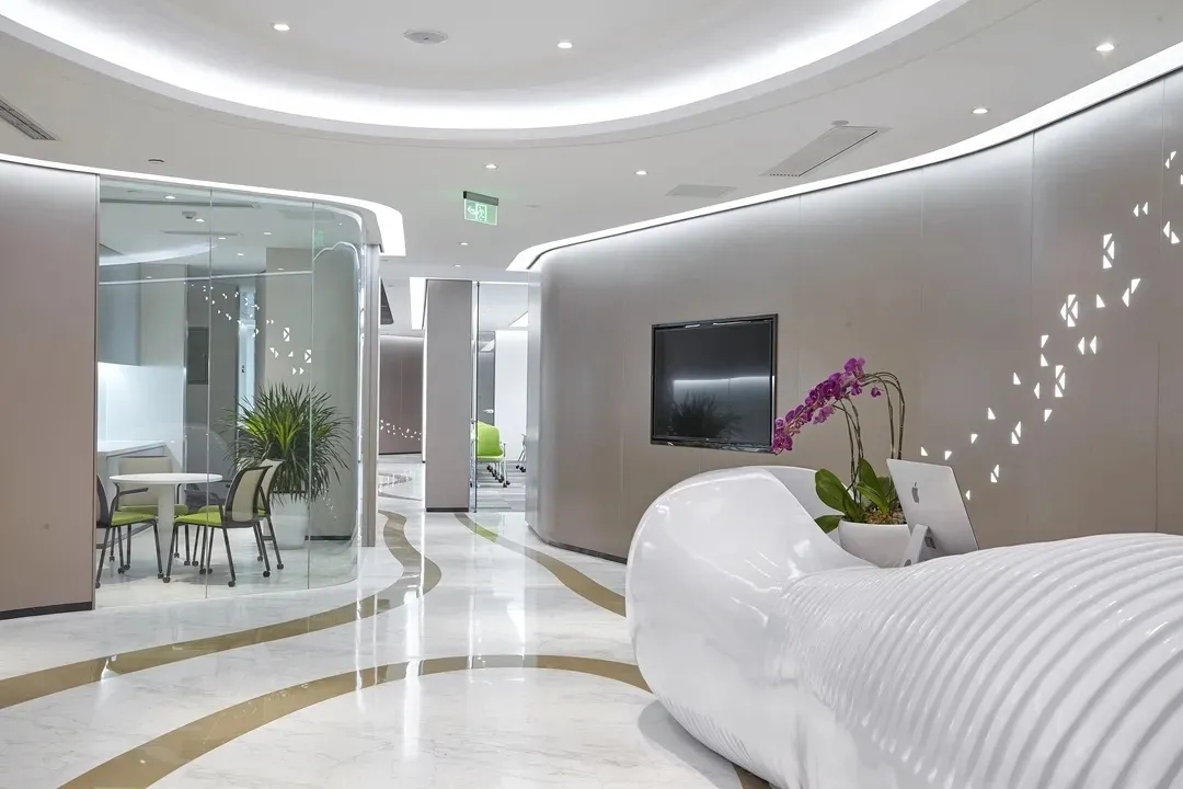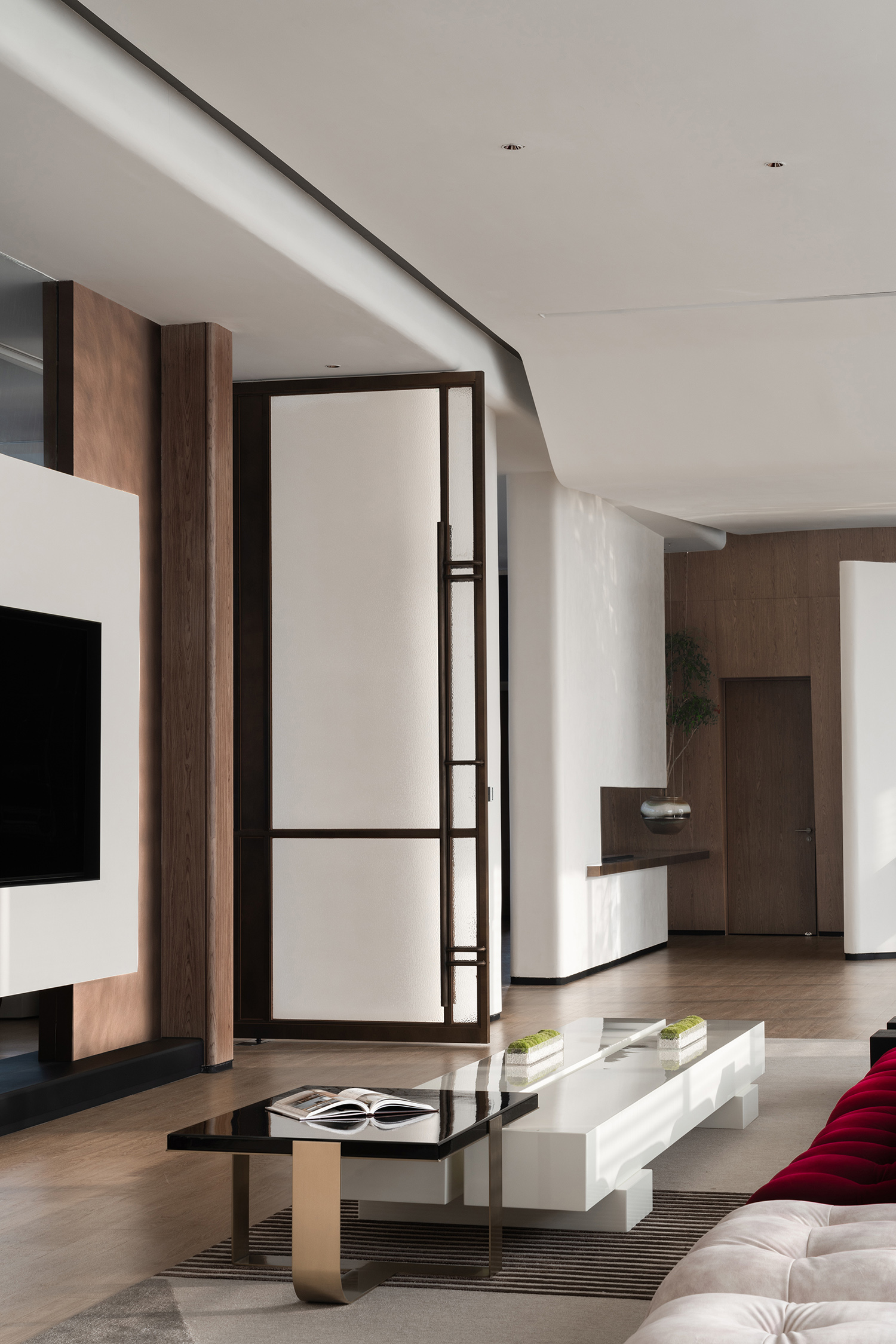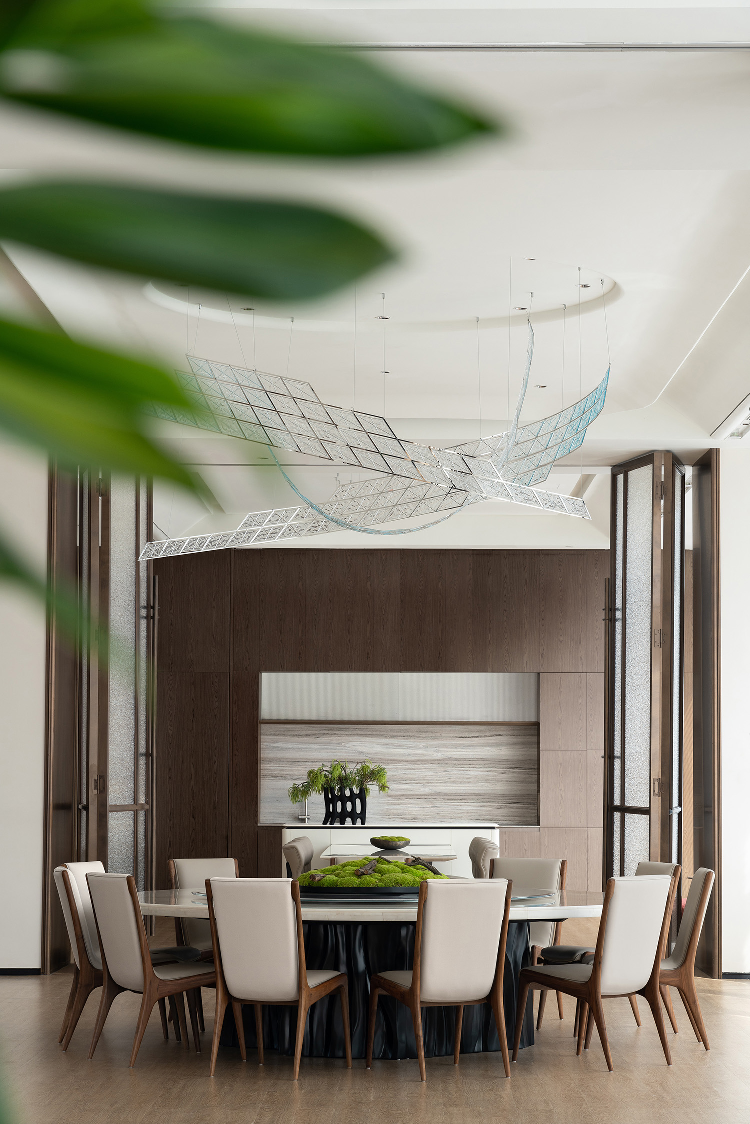 董事长办公室是彰显企业领导风格定位,体现公司形象,表达企业文化价值的一个重要办公场所,因此整体空间设计师还是沿用现代、简约、大气的风格为主。纬康的企业文化中,每个人都有作画的习惯,中间会议桌也是近几年他们一直在绘画中使用的,在甲方的要求下利旧使用,也算是对该公司企业文化的一种传承。为迎合员工经常在此画画的需求,天花板使用灯光软膜作为主体光源意在模仿自然光,墙面采用烤漆玻璃加毛毡板形式,方便董事长在会议中书写及做决策等使用。