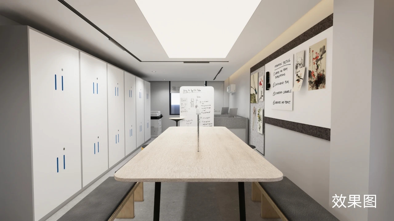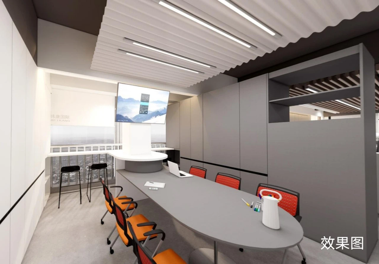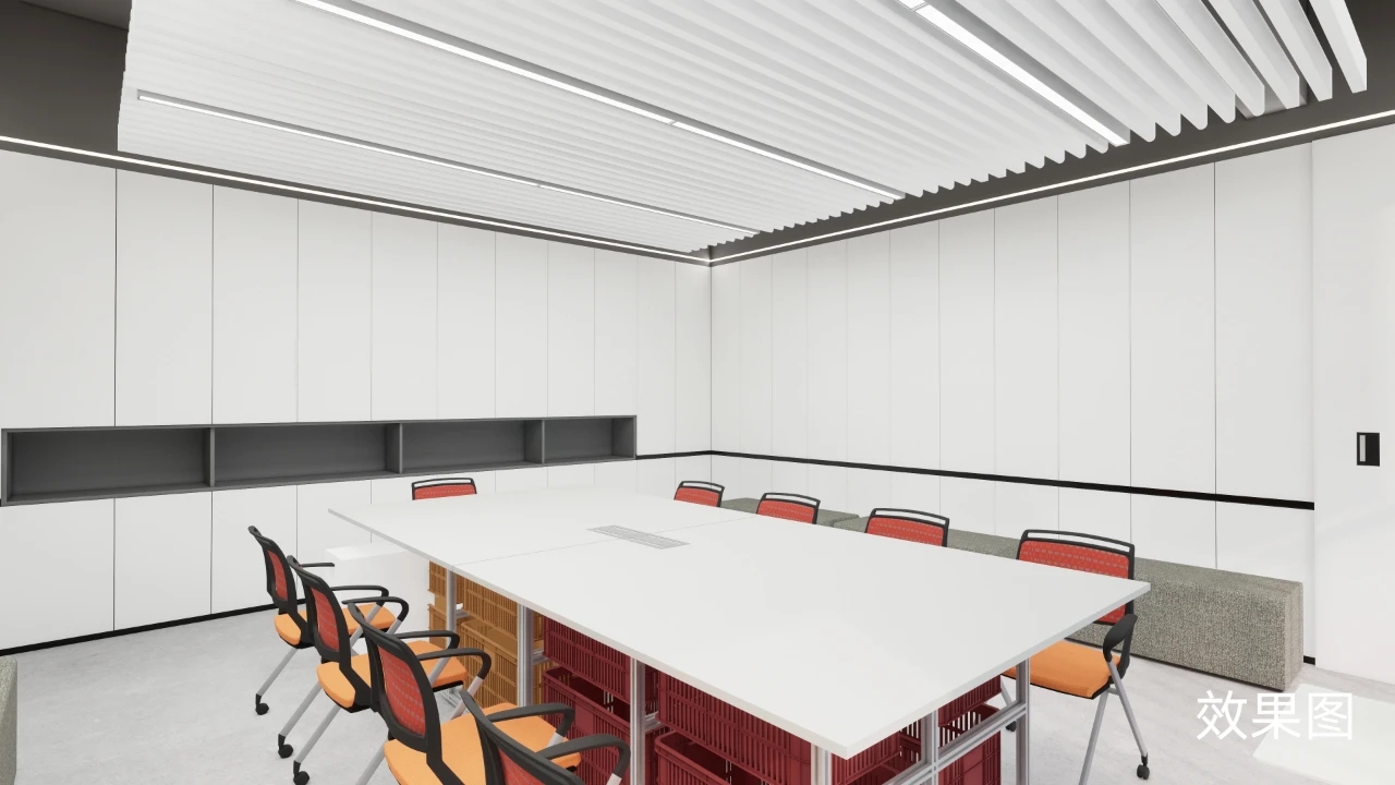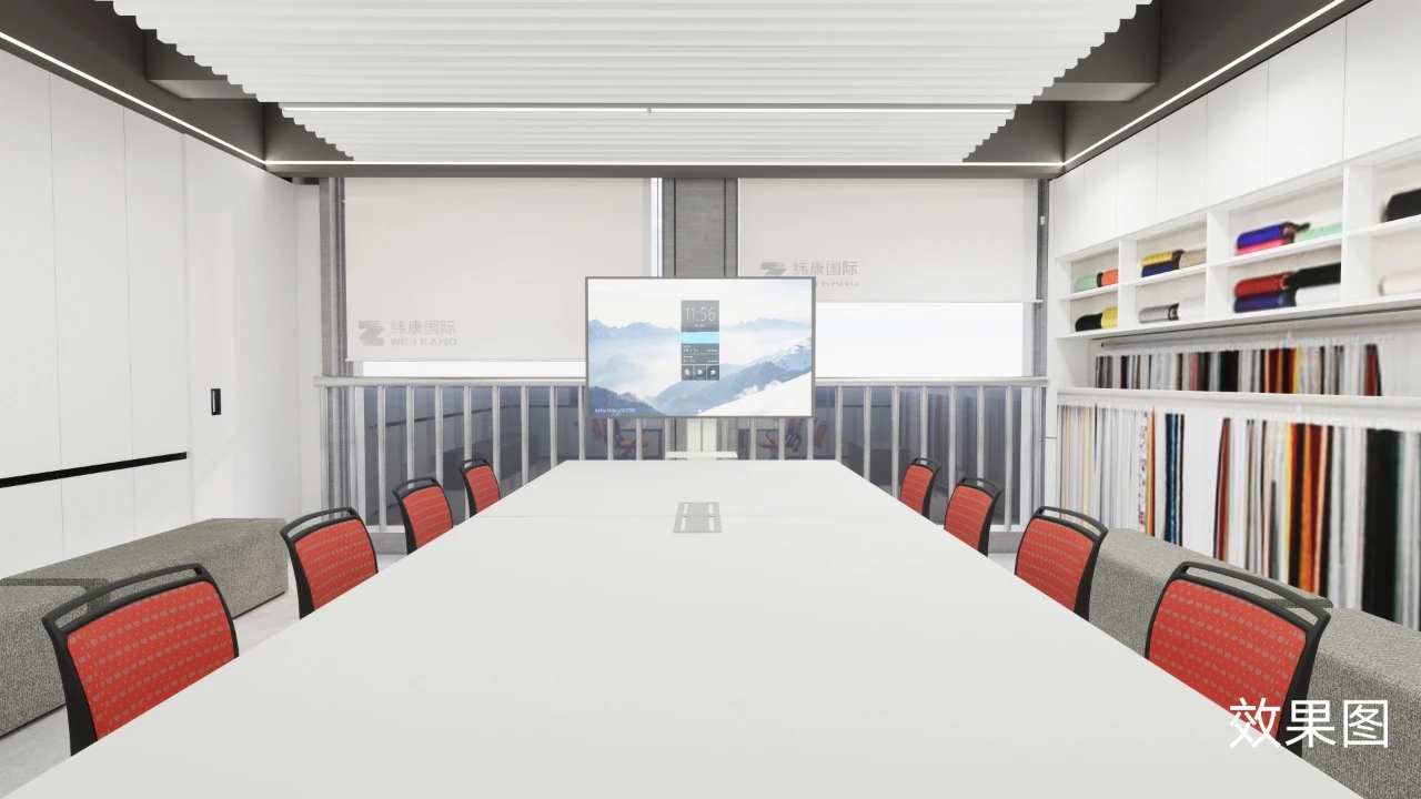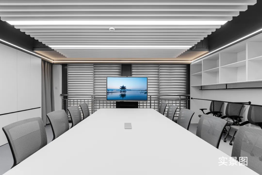 会议室天花以长条平板灯作为主灯,格栅周围使用线性灯绕一圈围成长方形,再将长条平板灯穿插于格栅之间,让天花板有了立体效果。会议室右侧墙设置格子间立体柜,赋予空间更多元素,这里主要承担布料展示功能。
