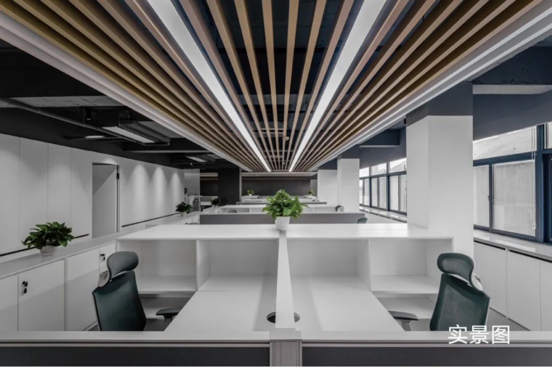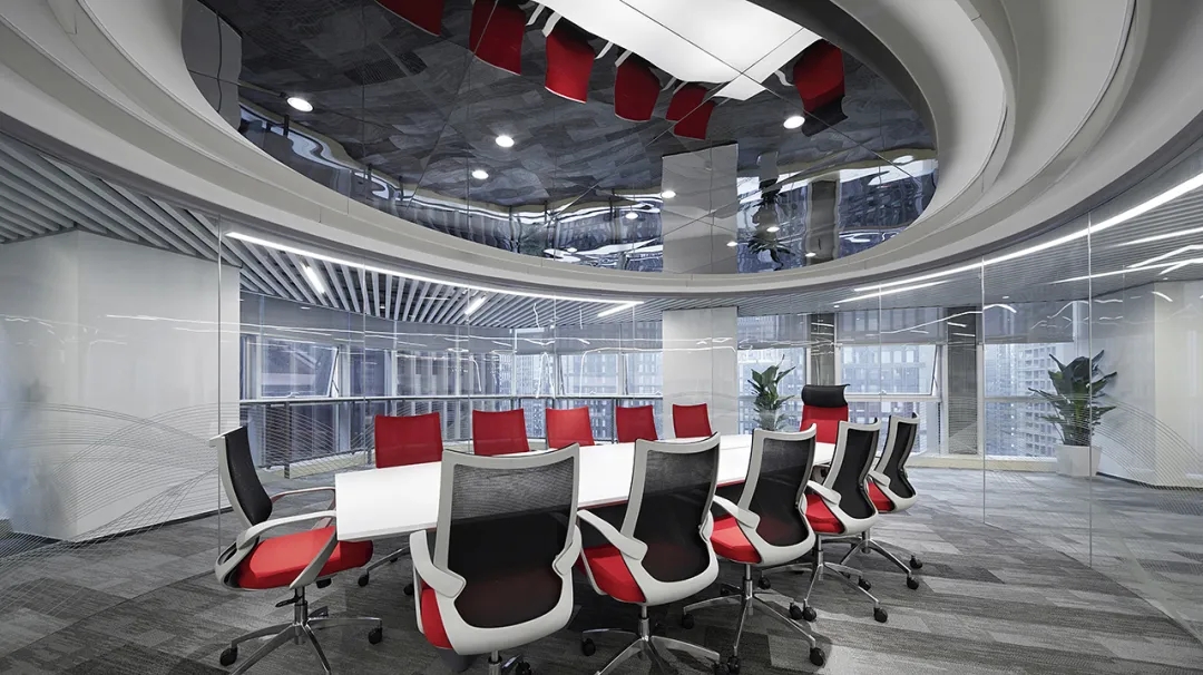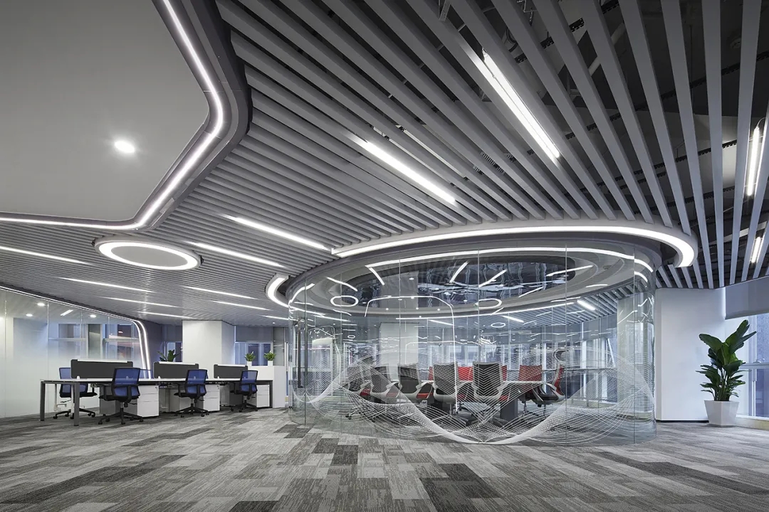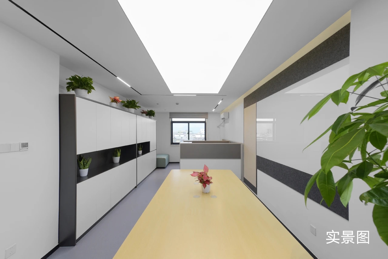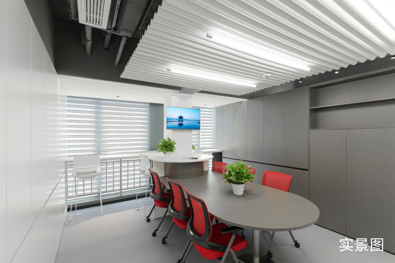 会议室天花以长条平板灯作为主灯,格栅周围使用线性灯绕一圈围成长方形,再将长条平板灯穿插于格栅之间,让天花板有了立体效果。会议室右侧墙设置格子间立体柜,赋予空间更多元素,这里主要承担布料展示功能。