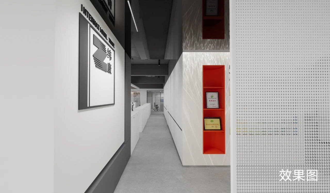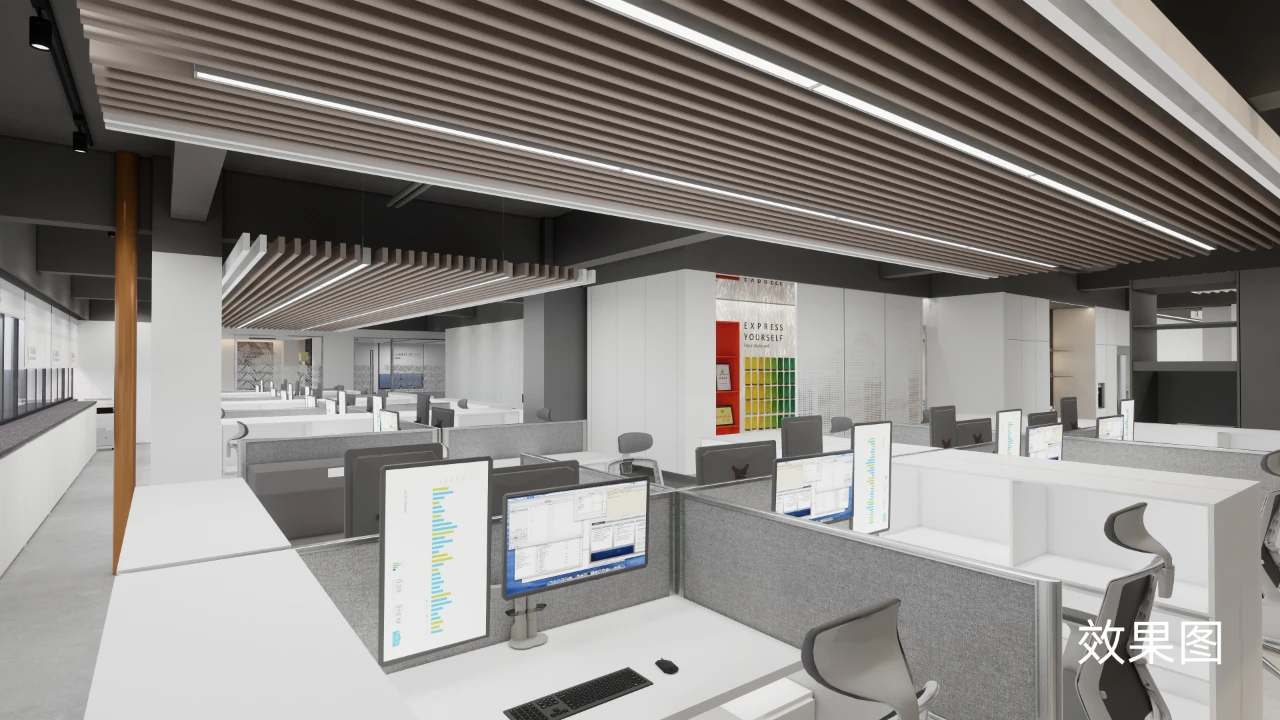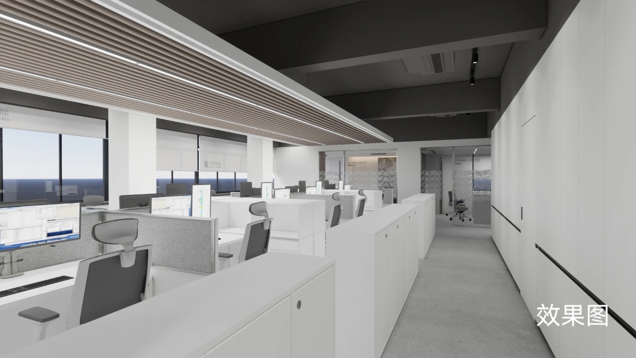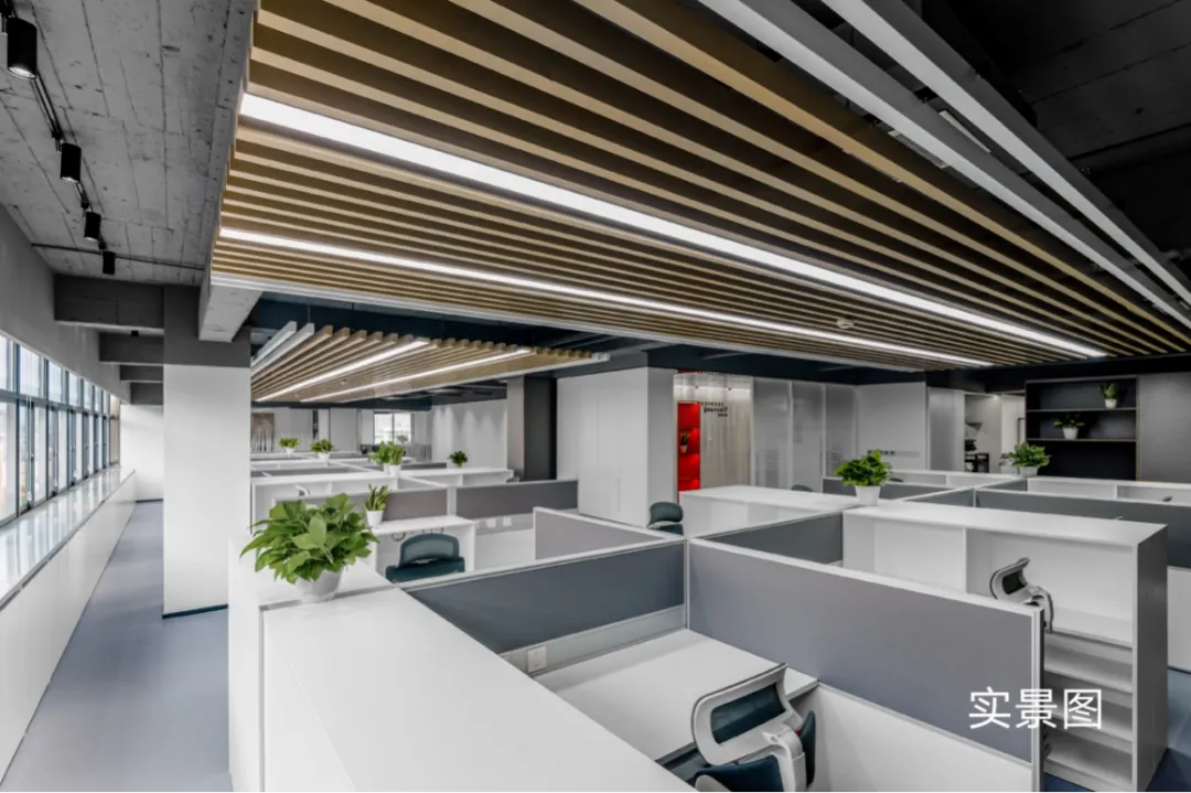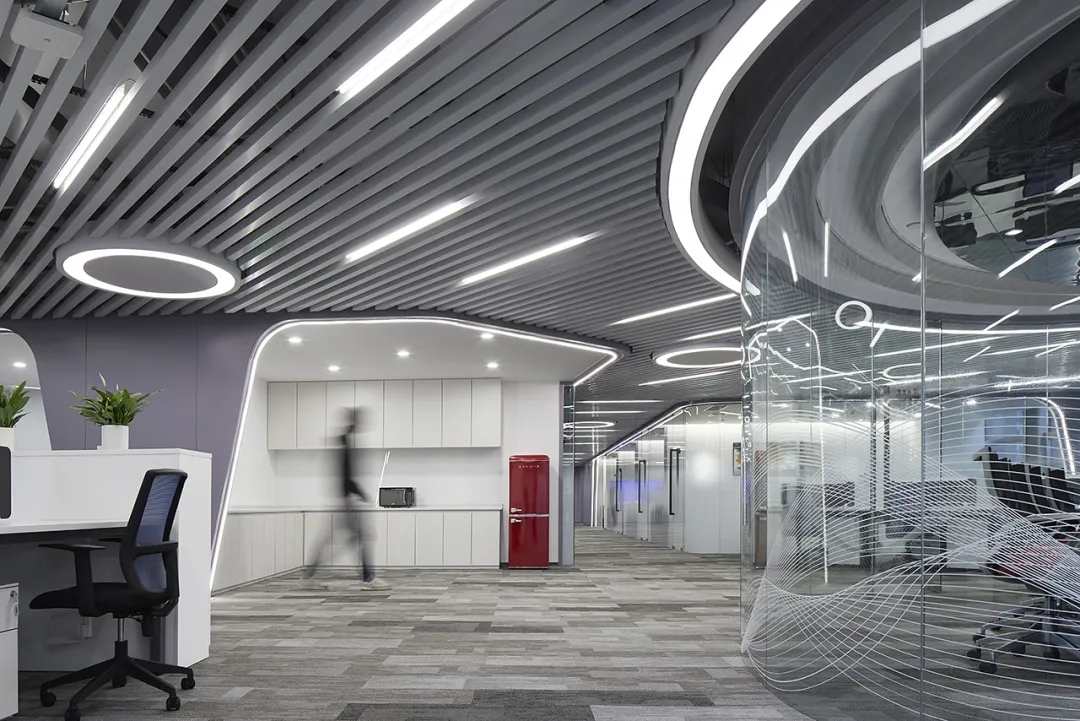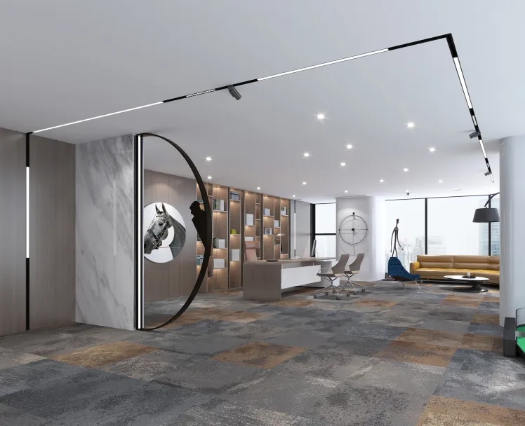 会议室天花以长条平板灯作为主灯,格栅周围使用线性灯绕一圈围成长方形,再将长条平板灯穿插于格栅之间,让天花板有了立体效果。会议室右侧墙设置格子间立体柜,赋予空间更多元素,这里主要承担布料展示功能。