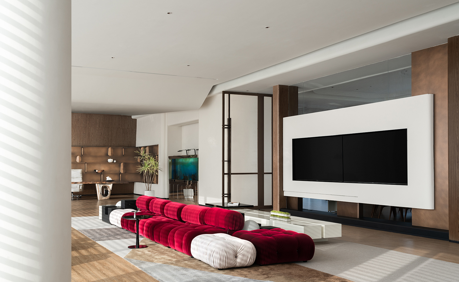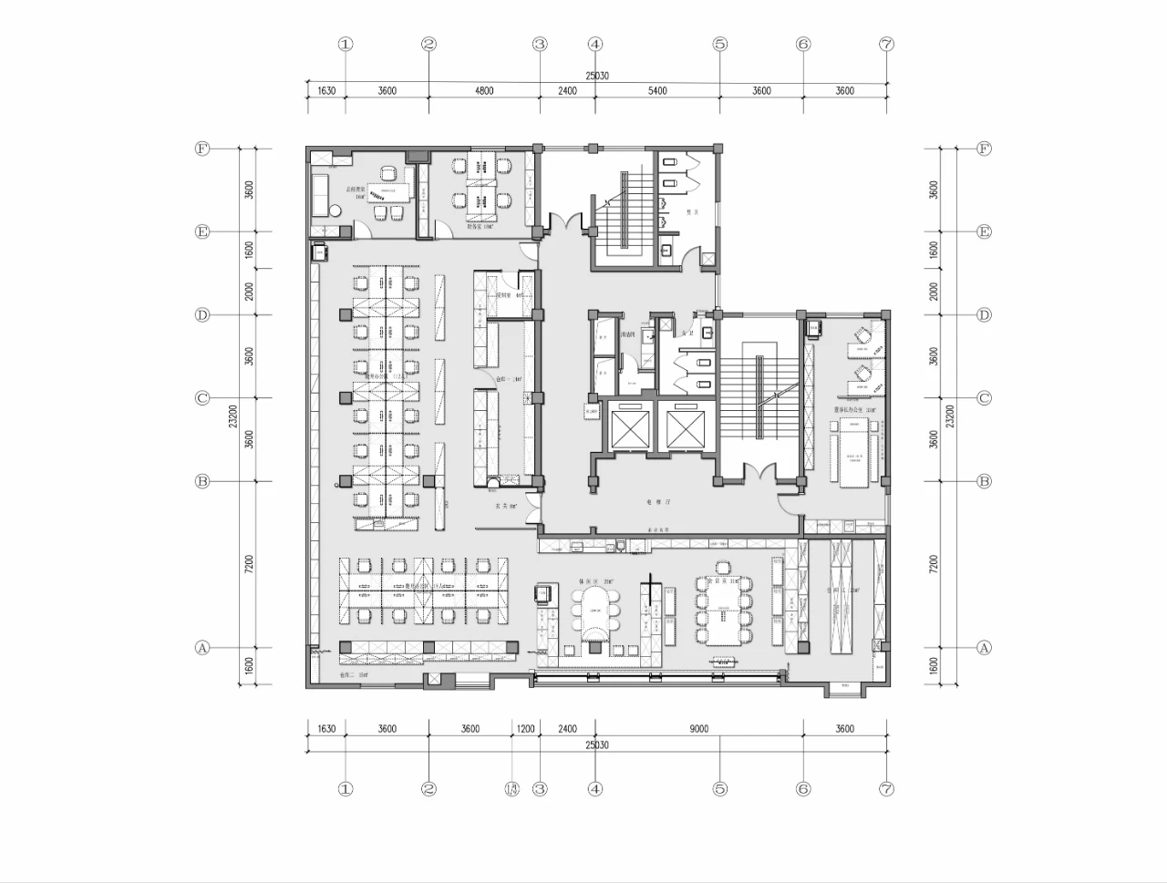 休闲区从左侧长方形吧台到圆柱体台柱再到第二层的吧台桌延伸至第一层长形椭圆桌,此工艺为一个整体。员工下午茶,平时看球赛等都可在此放松休闲。空间两侧没有过多修饰,而是使用了大的立面柜做空间装饰。
