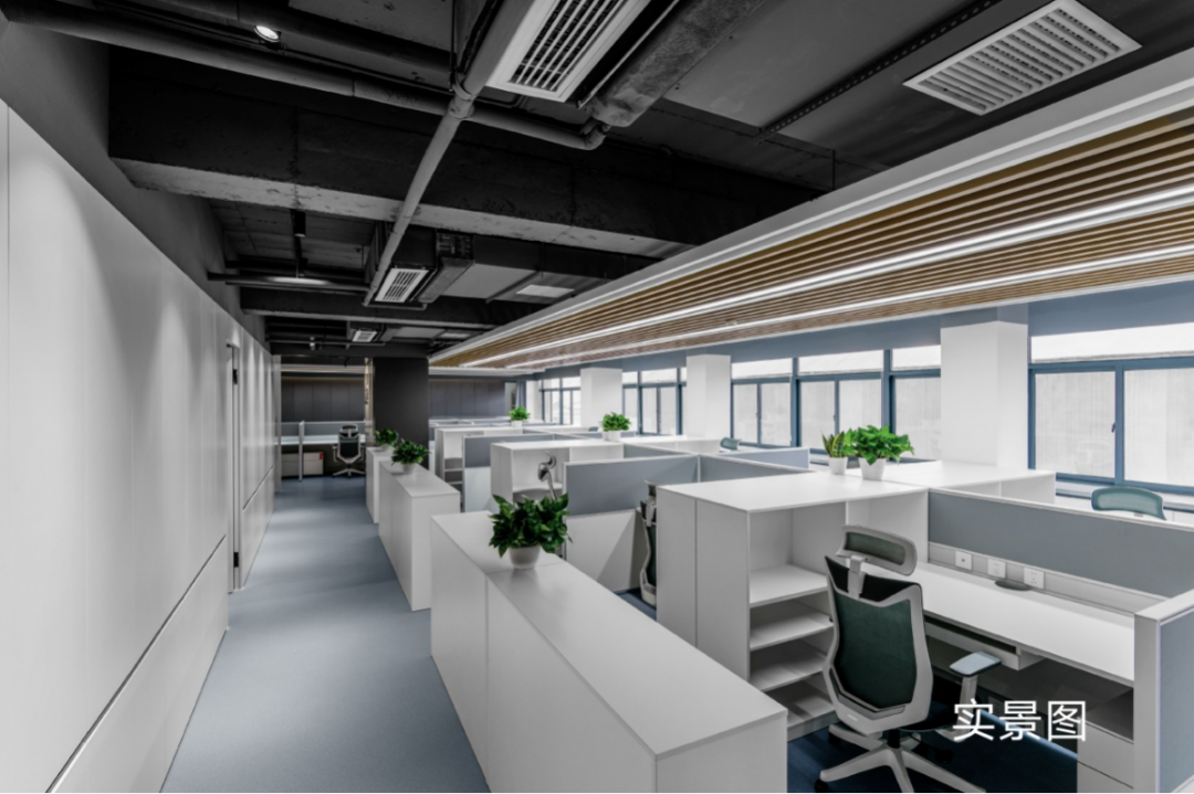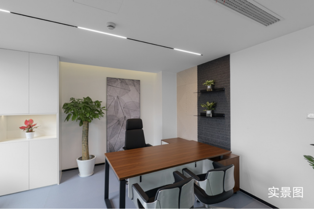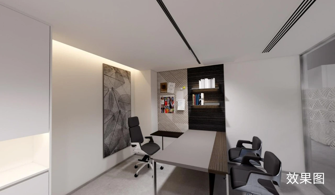 经理办公室天花采用嵌入式磁吸轨道灯照明,办公桌正后方置入绿植和装饰画,叶脉装饰画既抽象又典型,设计师使用毛毡板粘于右侧墙面,组装拼接成一面艺术墙,实木材质办公桌提亮整个空间。