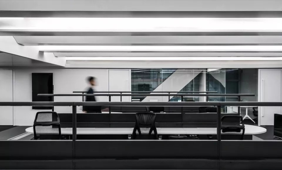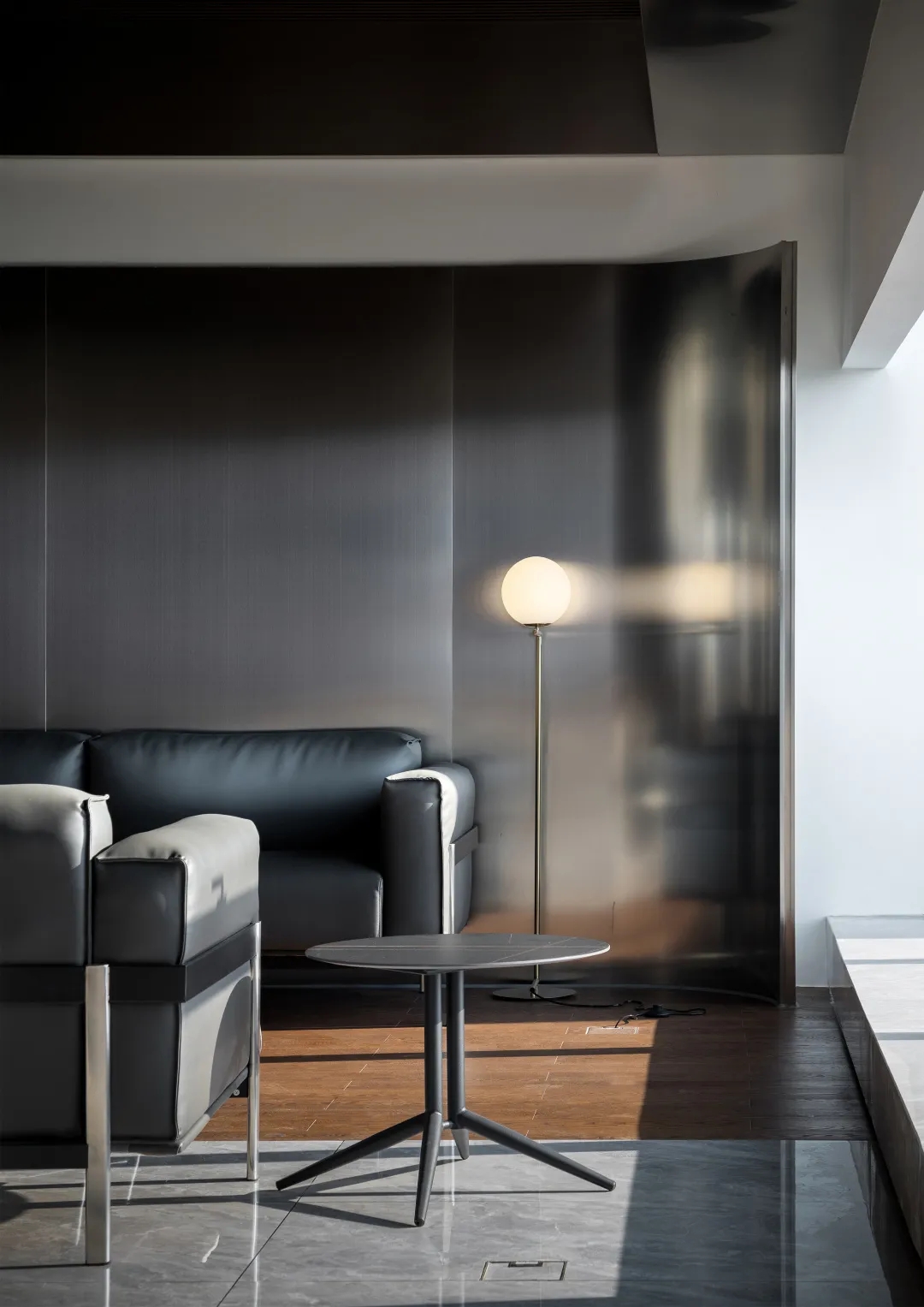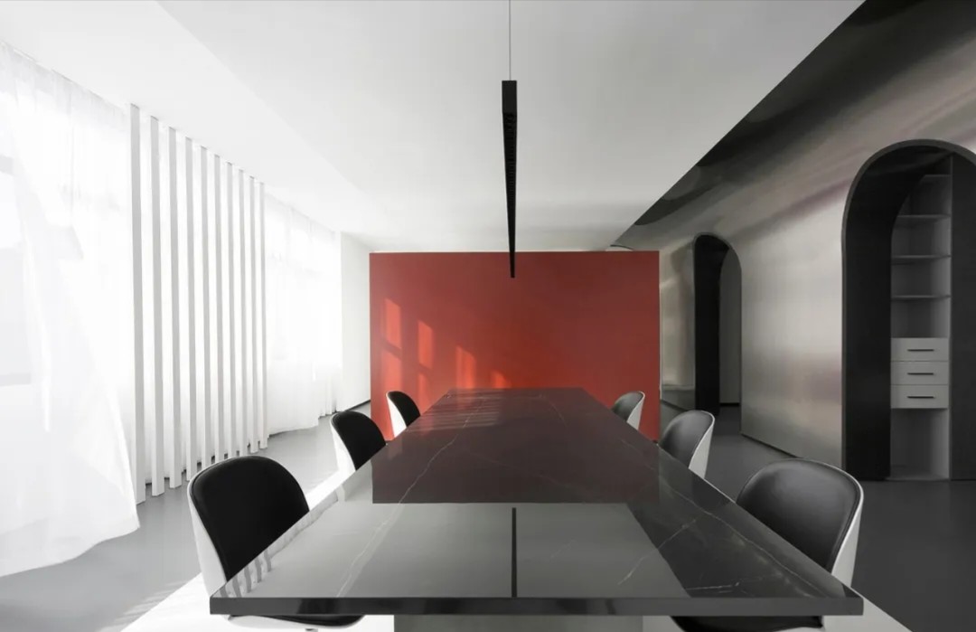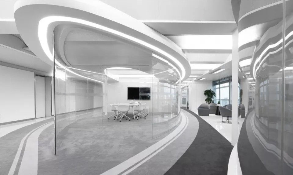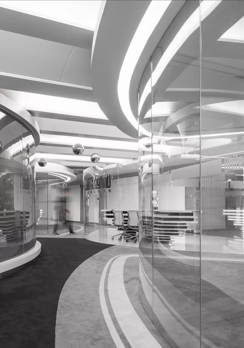 在大面积的黑白二元对立中,曲线以其灵动、柔美,及富有变化的特性,中和了干练,成就了一种简约又时尚的新感官体验,同时也柔化了空间中沟通交流的情绪。