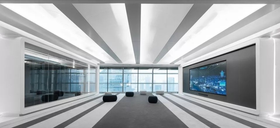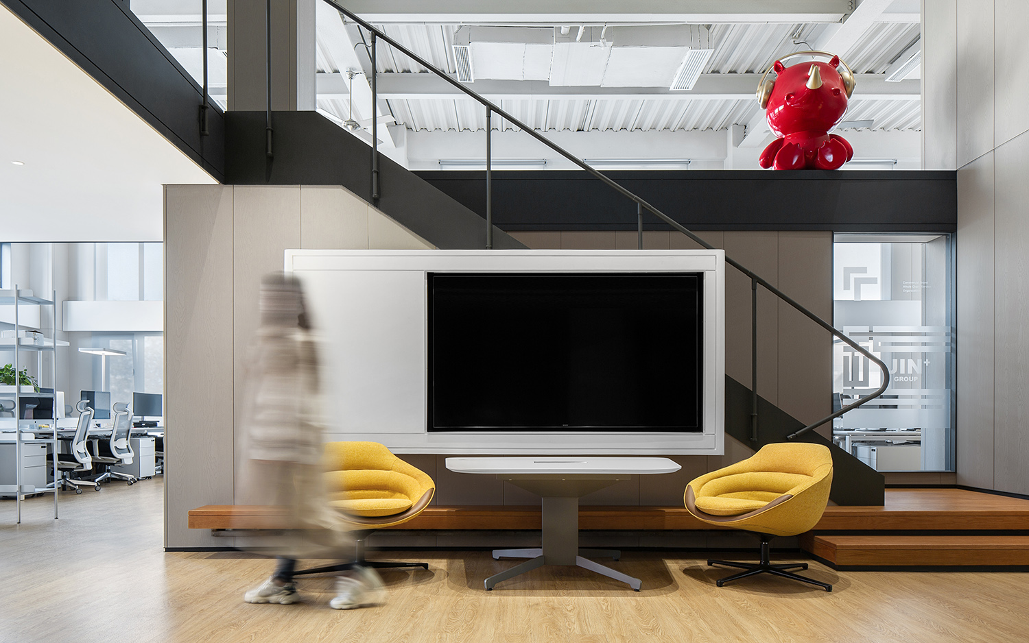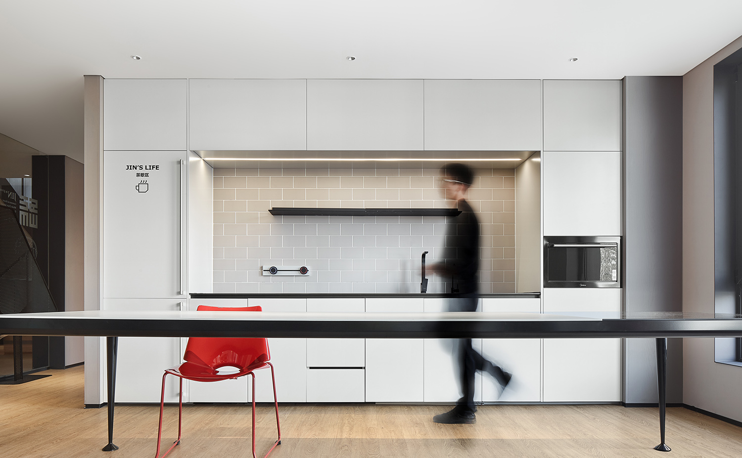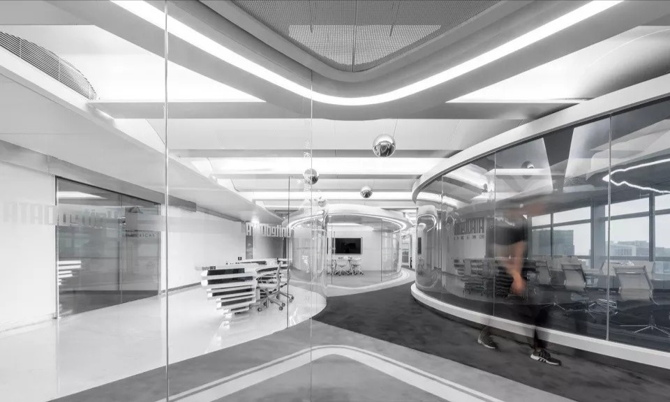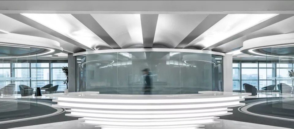 在大面积的黑白二元对立中,曲线以其灵动、柔美,及富有变化的特性,中和了干练,成就了一种简约又时尚的新感官体验,同时也柔化了空间中沟通交流的情绪。