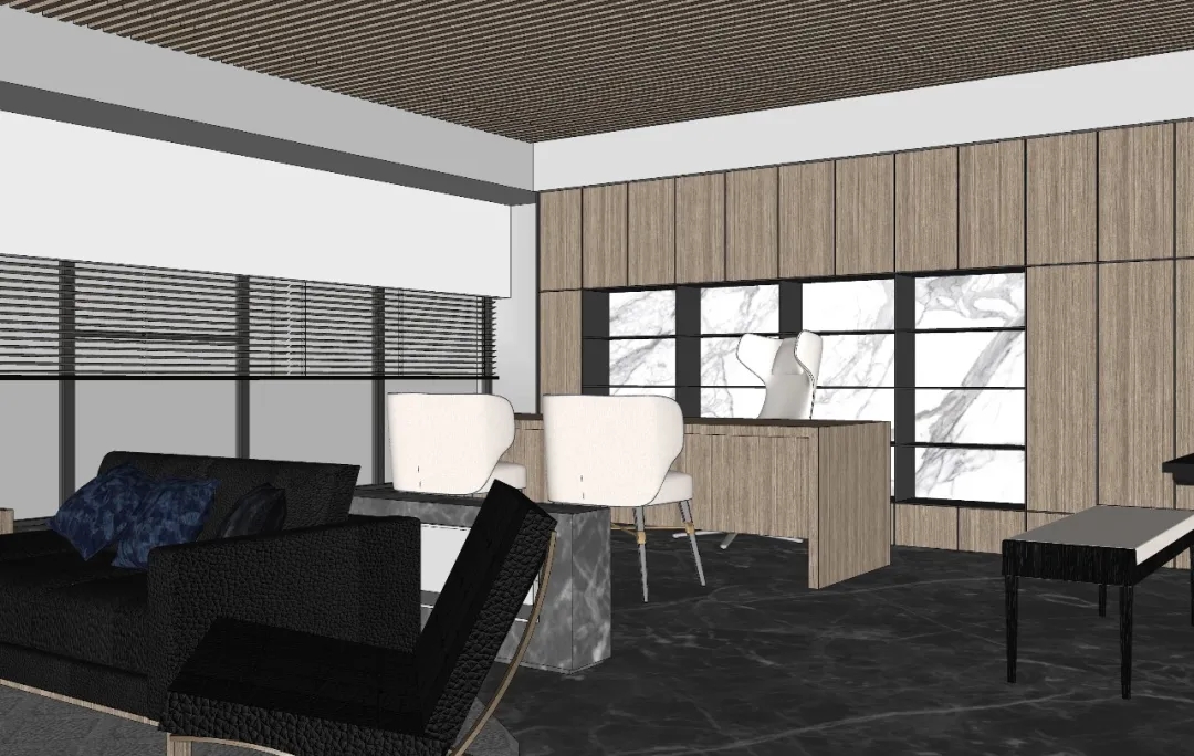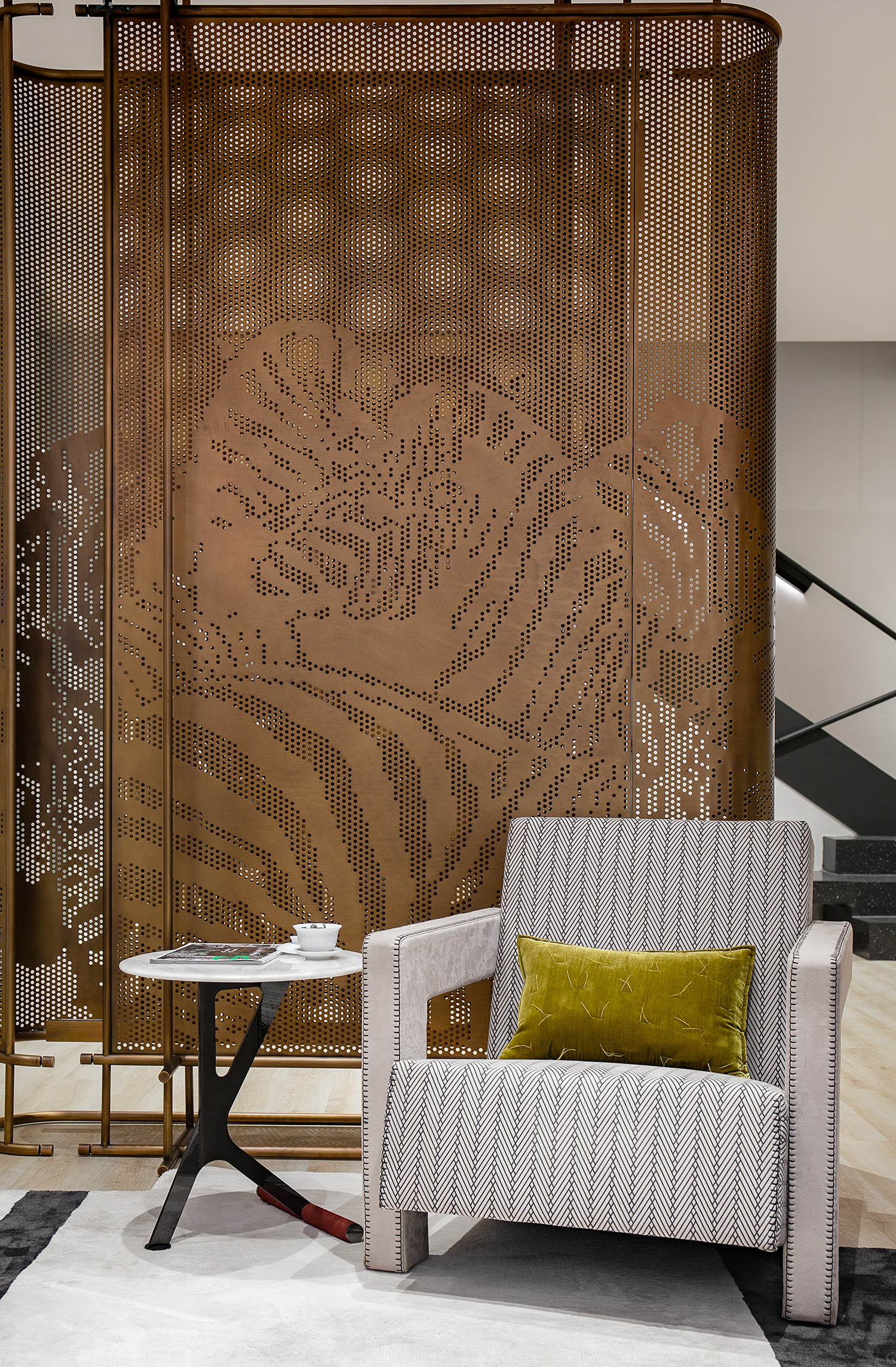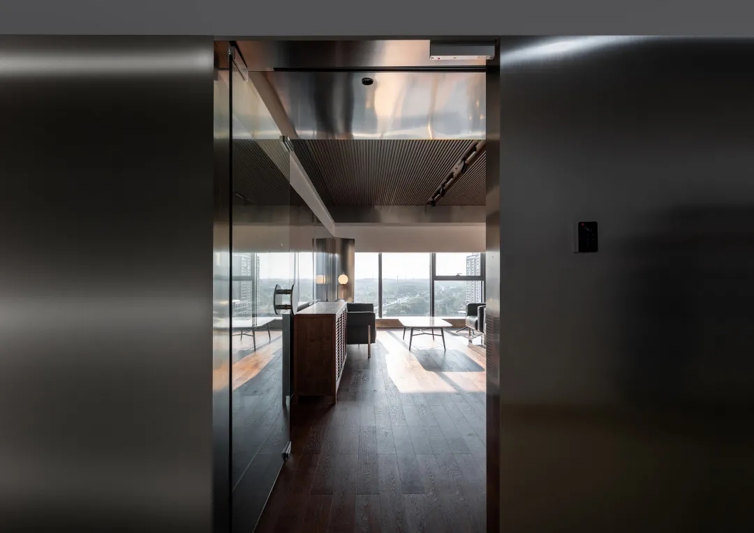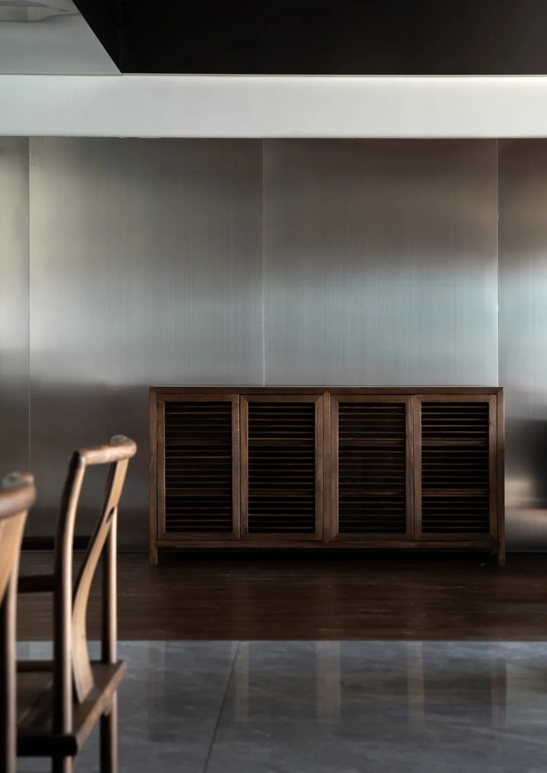 我们所说的空间从来不是一种被定义的风格,它是一种能服务于使用者的工具。铁元素与木元素的相遇会让空间产生一种良性的化学反应。整体的空间框架都采用了不锈钢这种材料,它的加入瞬间让整个环境变得威严和庄重,把整个氛围给衬托起来。当然只是不锈钢的加入是不行的,会让整体感觉太压抑,于是我们的设计师又增加了木质元素,让原本失衡的空间,立马变得活跃起来。木质材料的加入就像催化剂,让原本灰冷的空间有了暖意。材质的不同,给人的视感与触感就不同,既有共通亦要有所保持。这是一种美的呈现方式。空间所表达的气质,是与主人的气质成一致性的。像是存在某种关系的纽带。不同格调 元素 颜色 复杂简单 都围绕着使用者本身,重新组合不再有明显的界限,相反它会以一种独特的气质呈现出来。木材的加入是传统与时尚的一次联谊,是一种非传统的混合方式。金属特有光辉色彩及其质感,可塑性延展性,可以用设计手法表现出画龙点睛的作用,除了可以表现装饰特性还具有可靠的承受较大的荷载,可以为结构支撑构建,即有较强的装饰性又有稳定的实用功能。
