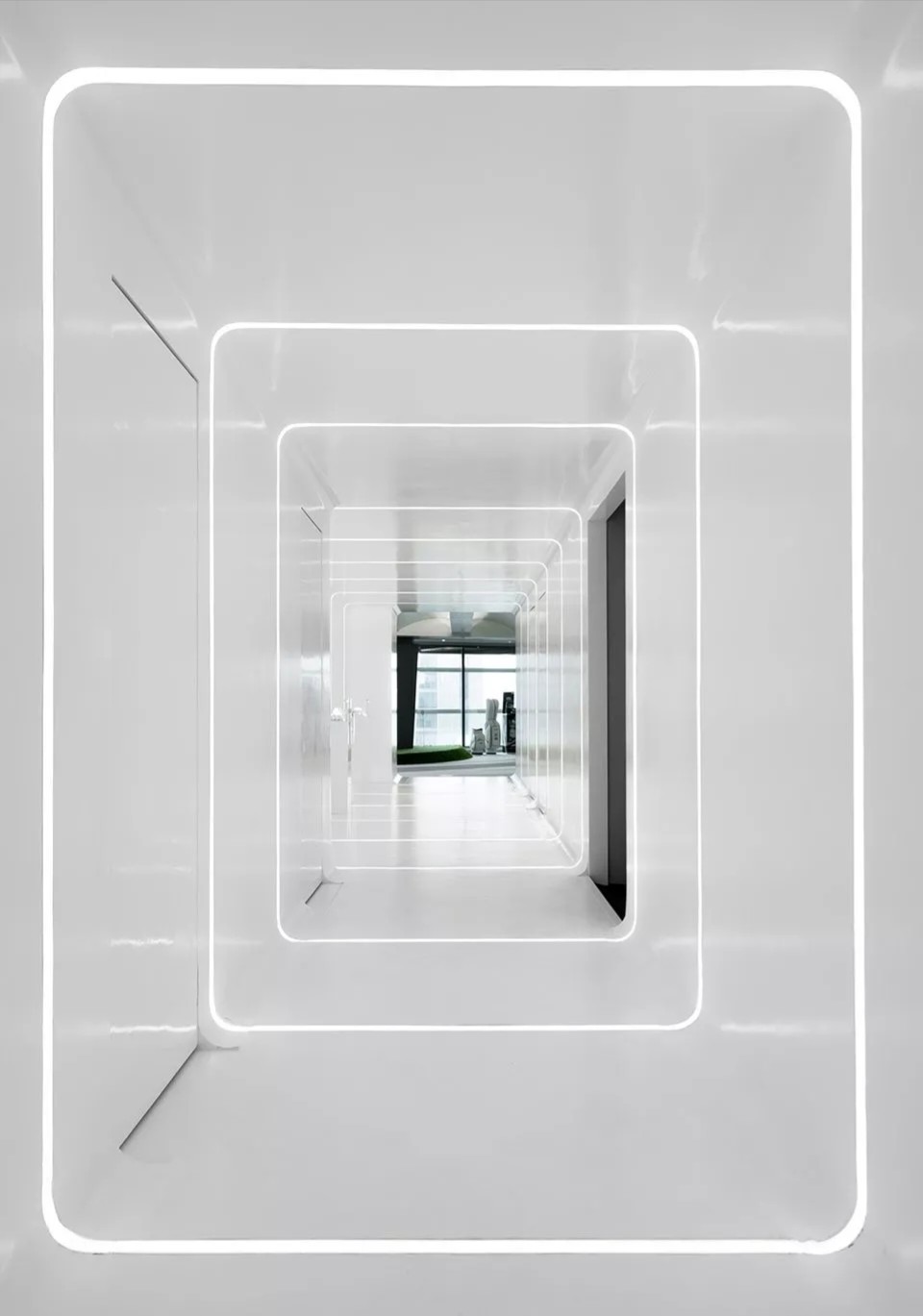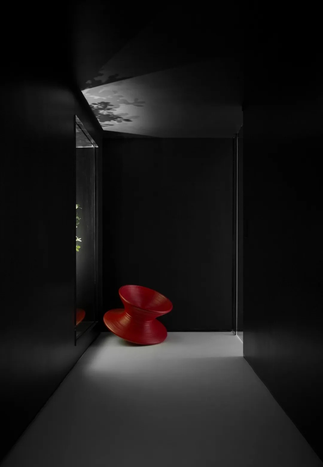 黑白分明的简洁利落,且兼顾品质的艺术性,进口处的盒子空间,奠定了整个设计的基调。欢迎的仪式感,隐藏的光源设定,更增加了其聚焦效果,如深邃的魔盒,吸引着到来者不由自主进入探索。