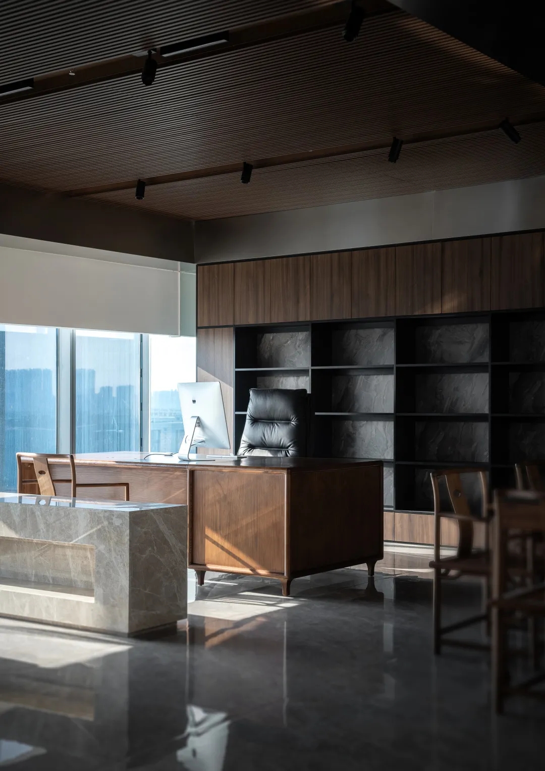 背景墙与天花板采用了金属不锈钢去进行设计语言的表现。美观、舒适、健康的室内环境可以帮助人们提高工作质量和生活水平,木质材料无疑在其中扮演了重要角色,复古的颜色与现代格调融合,赋予了一种全新的美感。