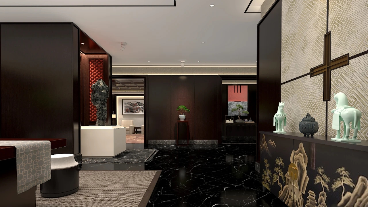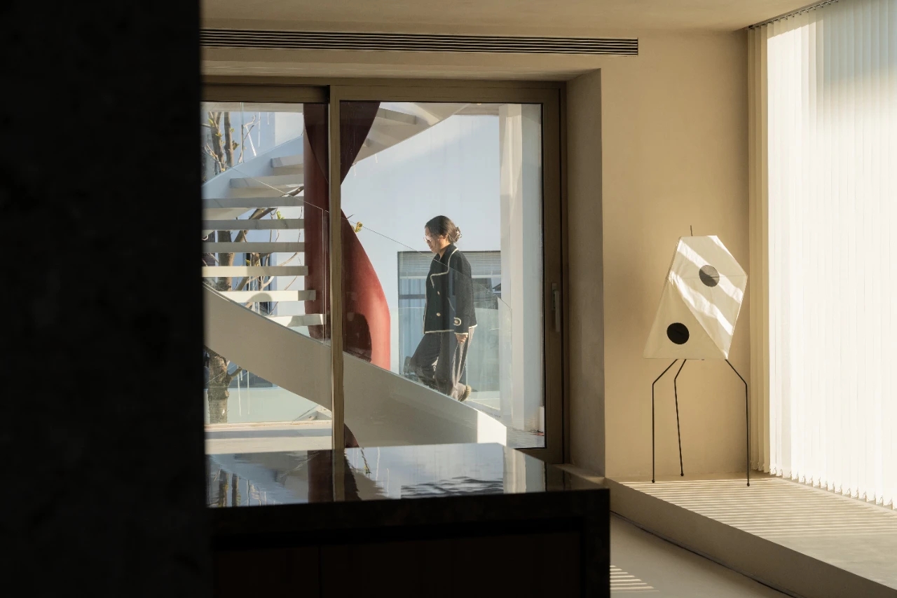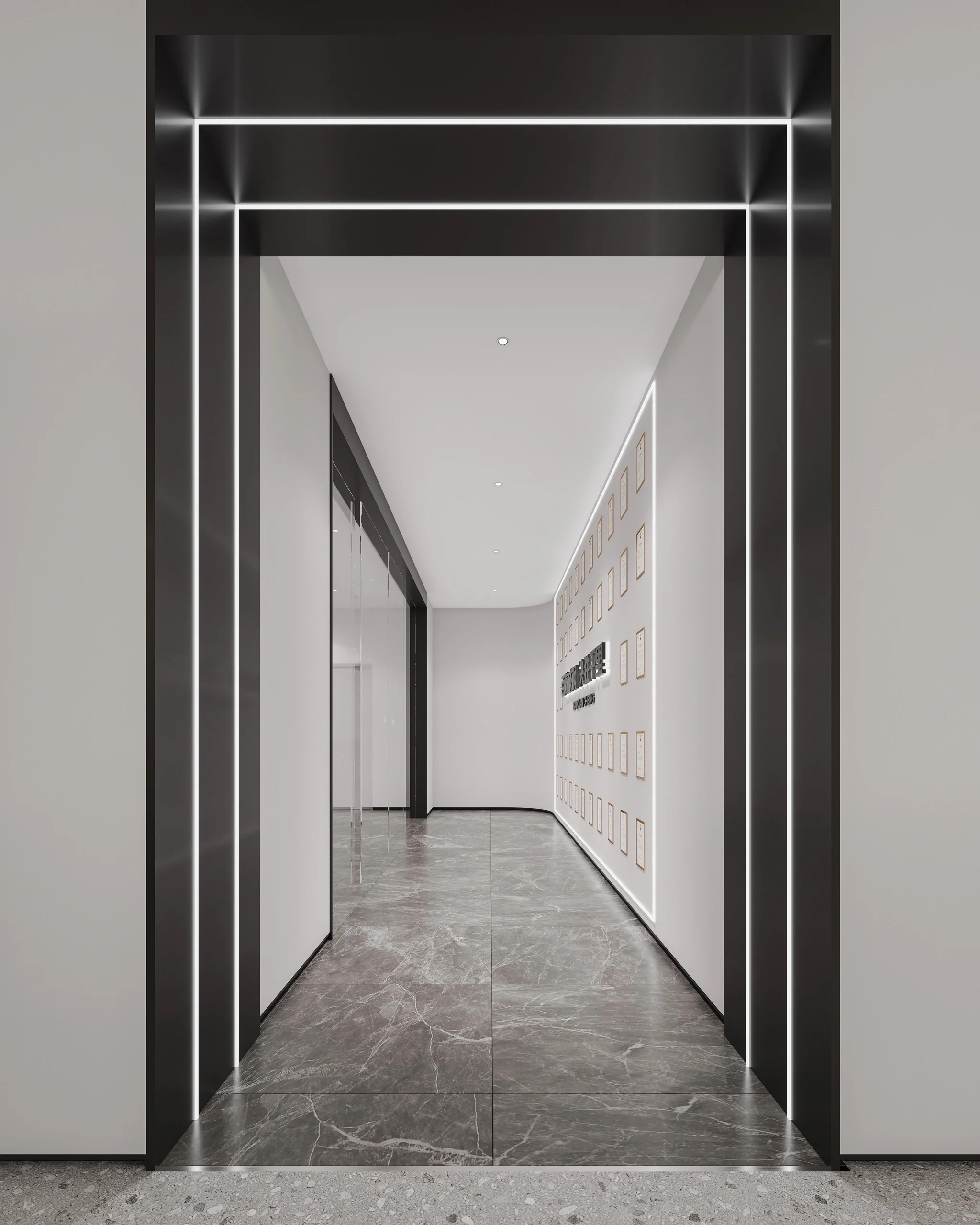 南侧入口玄关处是地台步道,步道尽头的镜面随着参观者步行深入过程中发现这无尽走廊的“小秘密”,辅以落地窗的光影序列,理性之美油然而生。