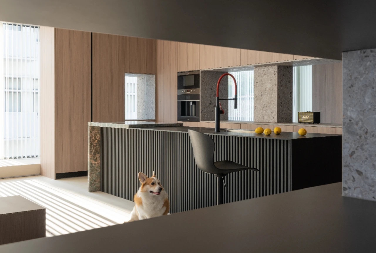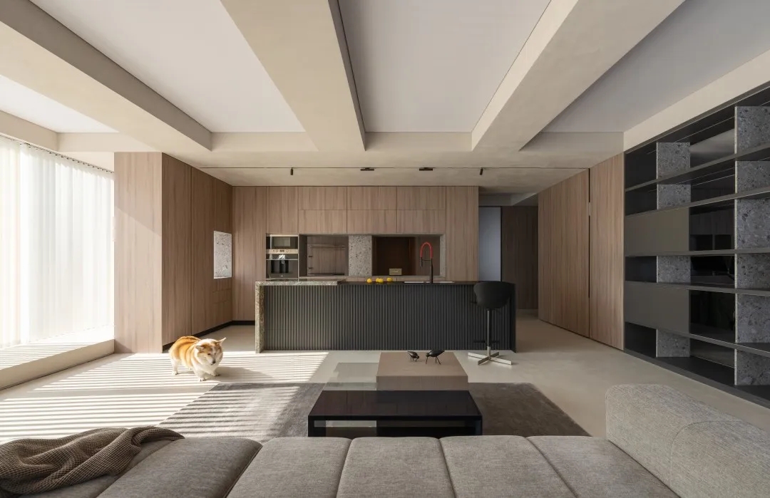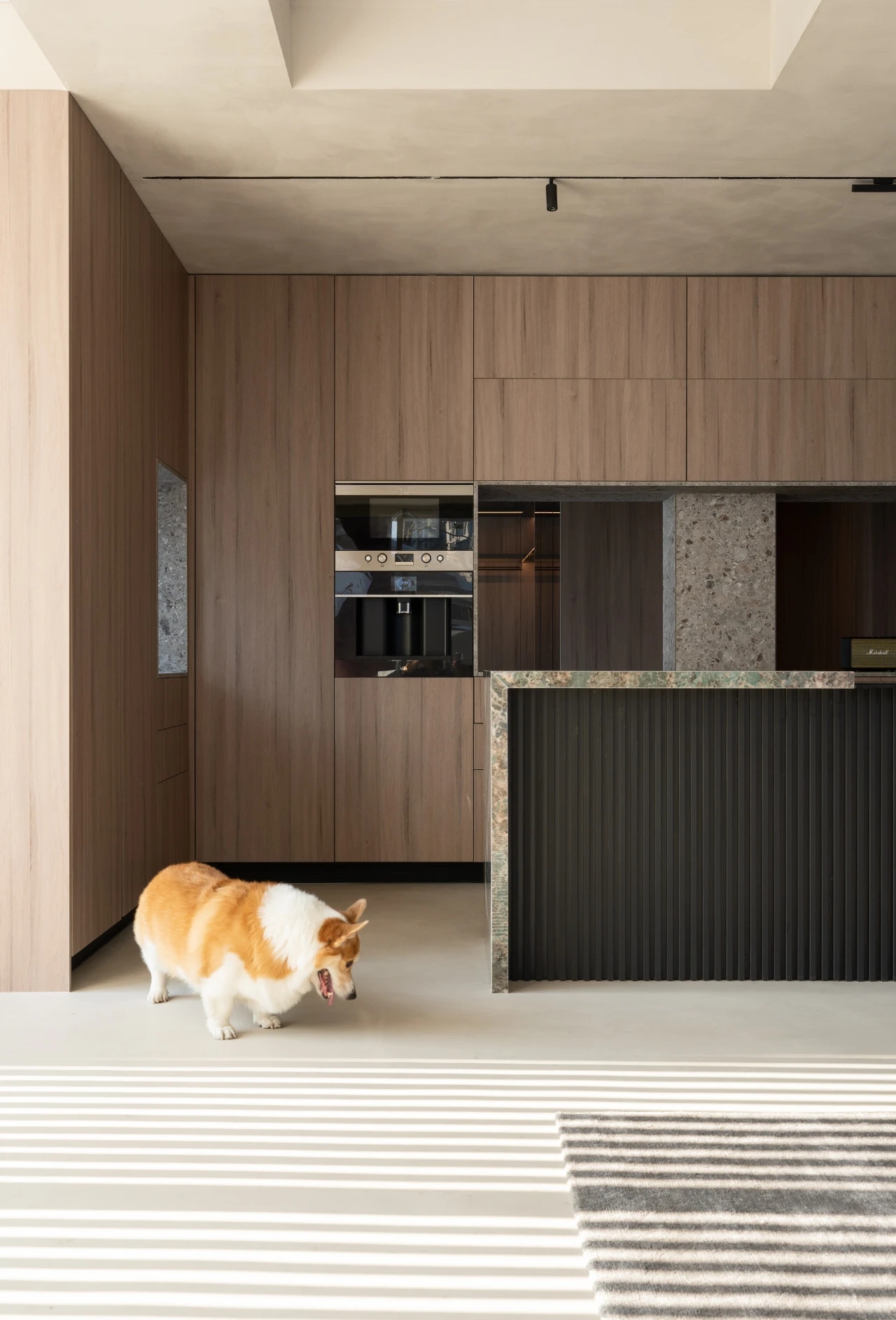 西厨和客厅的横向布局让沙发上的客人与在吧台做茶水服务的主人有了良好的互动情绪和情景带入性。龙头与岩板部分的撞色让沉寂的大地色系有了盎然的生机。