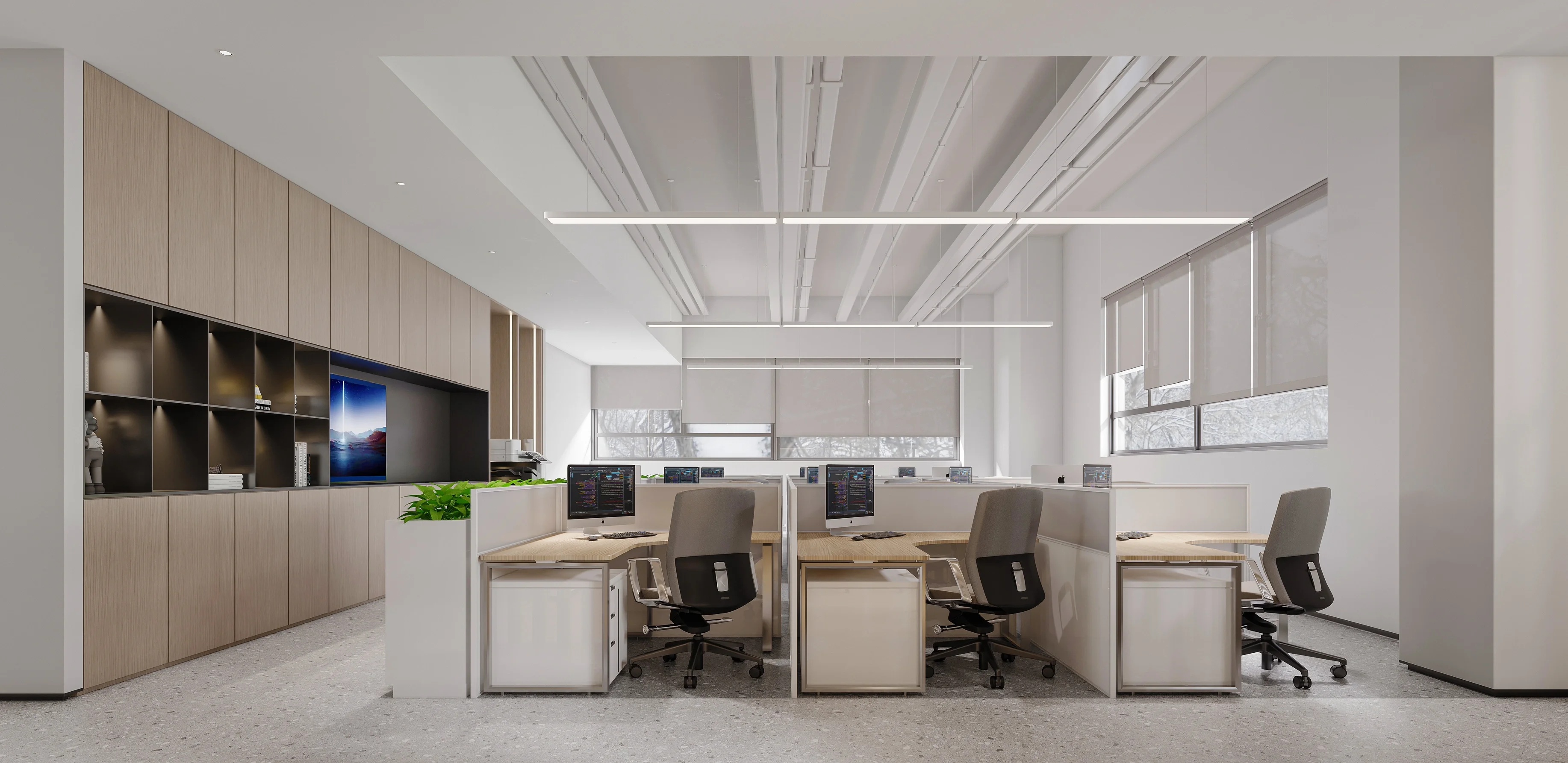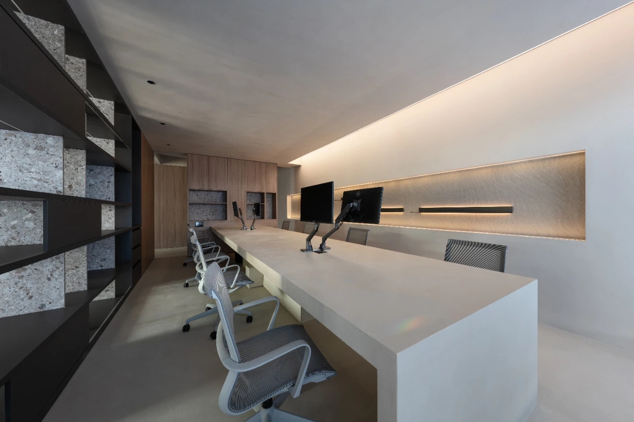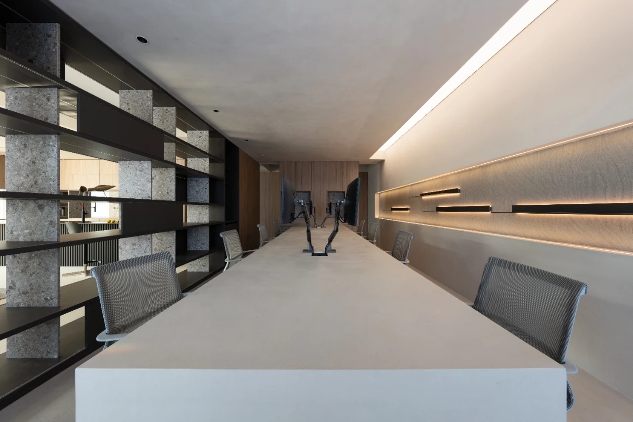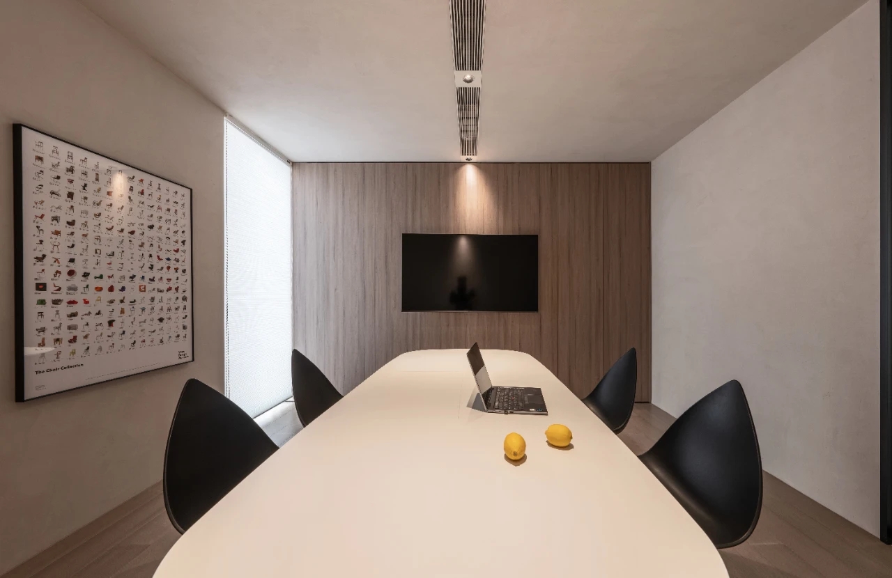 150㎡的办公场所让“小中见大”成为了设计的核心议题,除去会议、物料及卫生间的实墙之外,所有区域划分及界定全部采用虚实结合的定制柜体来完成兼收纳功能的隔断,保证区域之间的相对私密又能保持视觉在空间中的延伸。