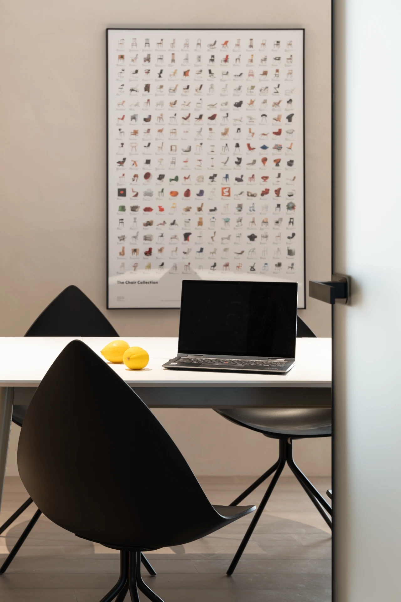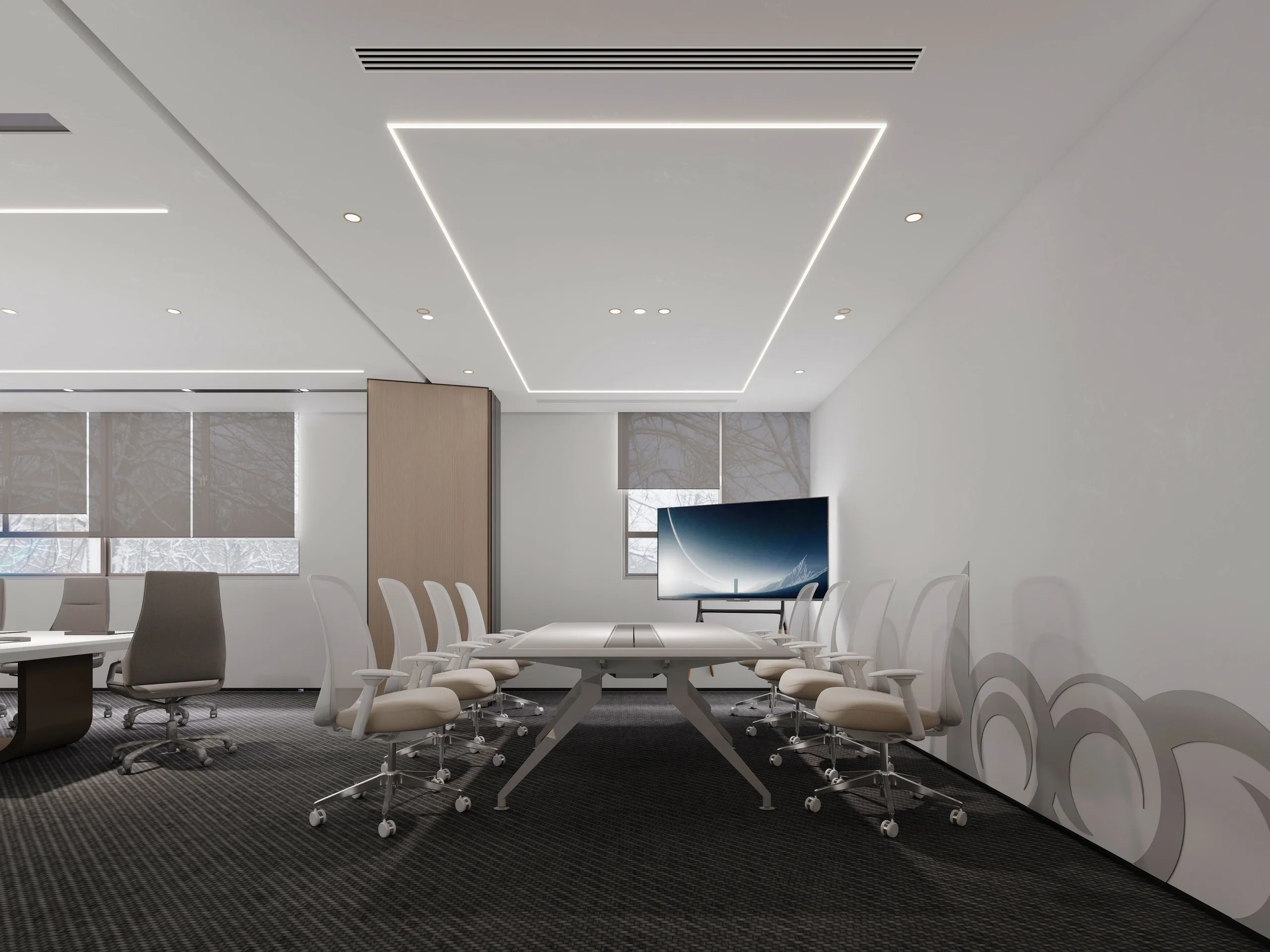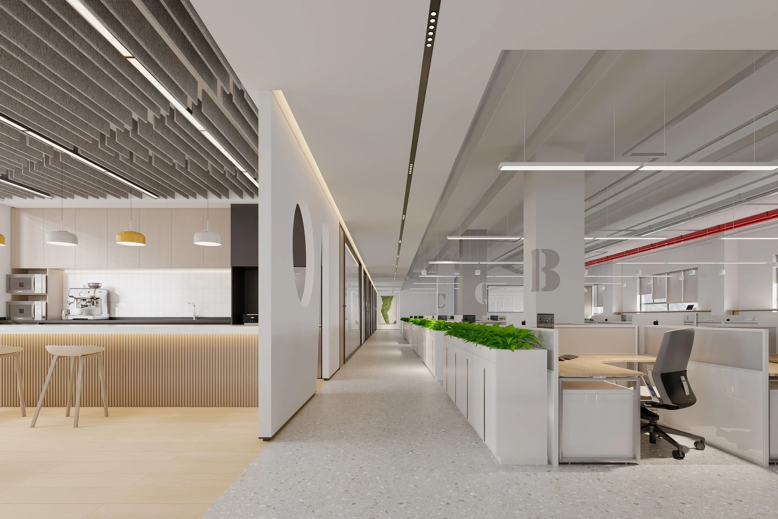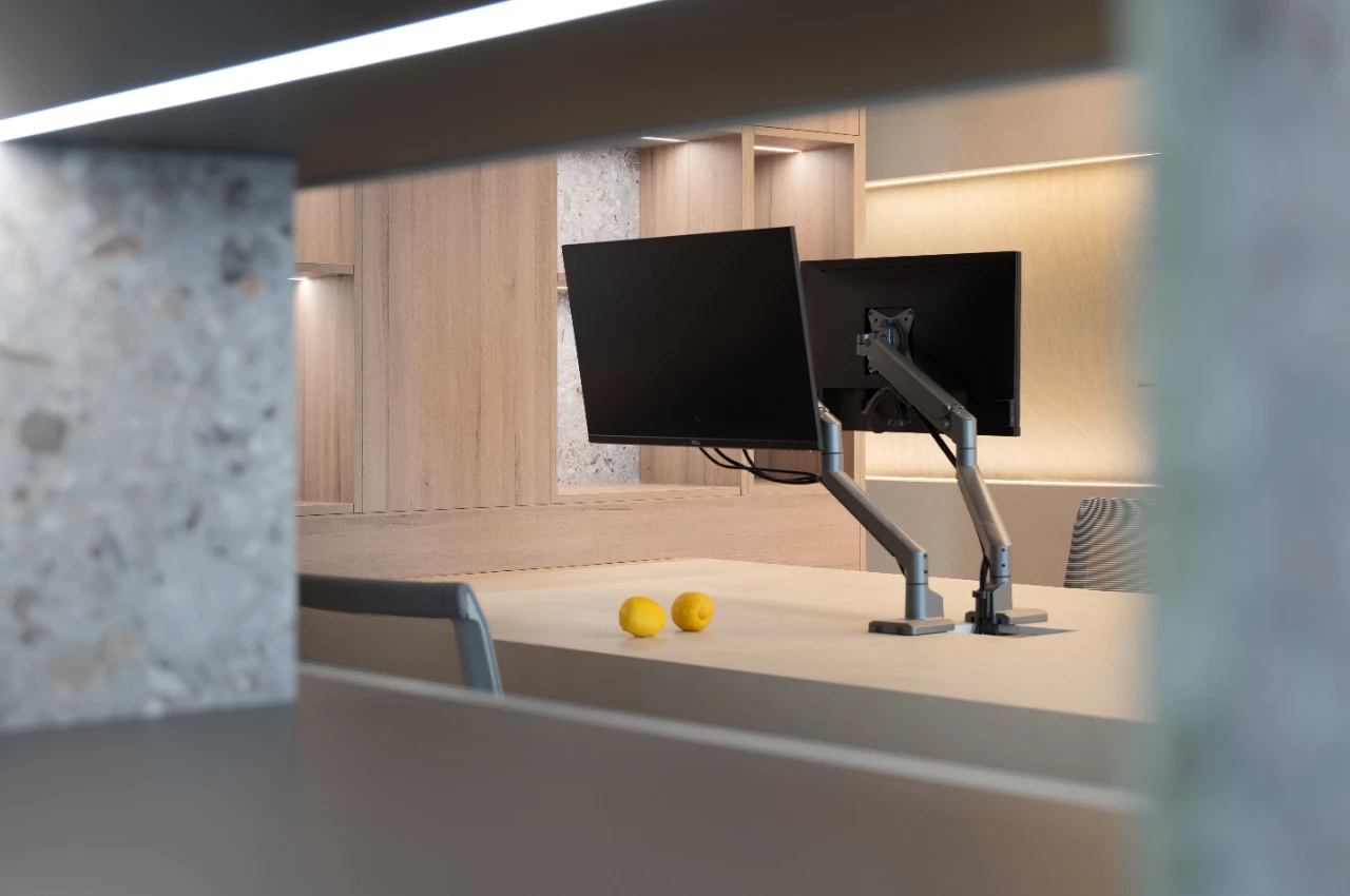 150㎡的办公场所让“小中见大”成为了设计的核心议题,除去会议、物料及卫生间的实墙之外,所有区域划分及界定全部采用虚实结合的定制柜体来完成兼收纳功能的隔断,保证区域之间的相对私密又能保持视觉在空间中的延伸。