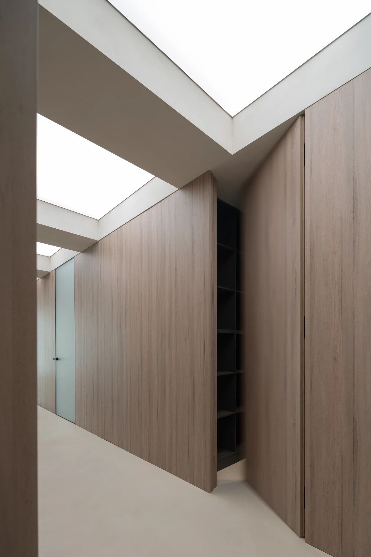 过道顶棚利用原始梁的高差形成了连续体量,靠软膜天花造就明暗的交替。虚实之间的秩序强化了行走在过道上的仪式感。