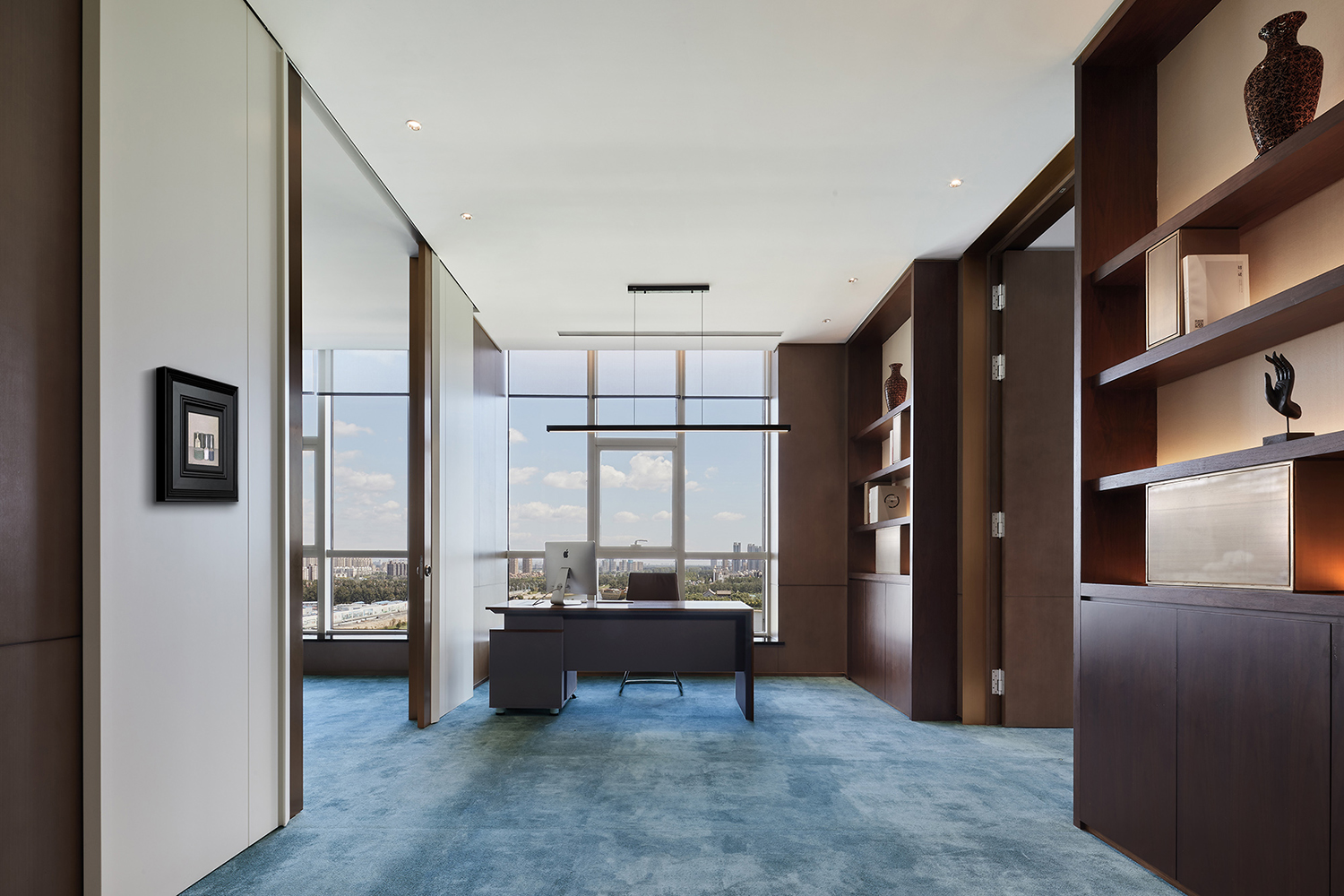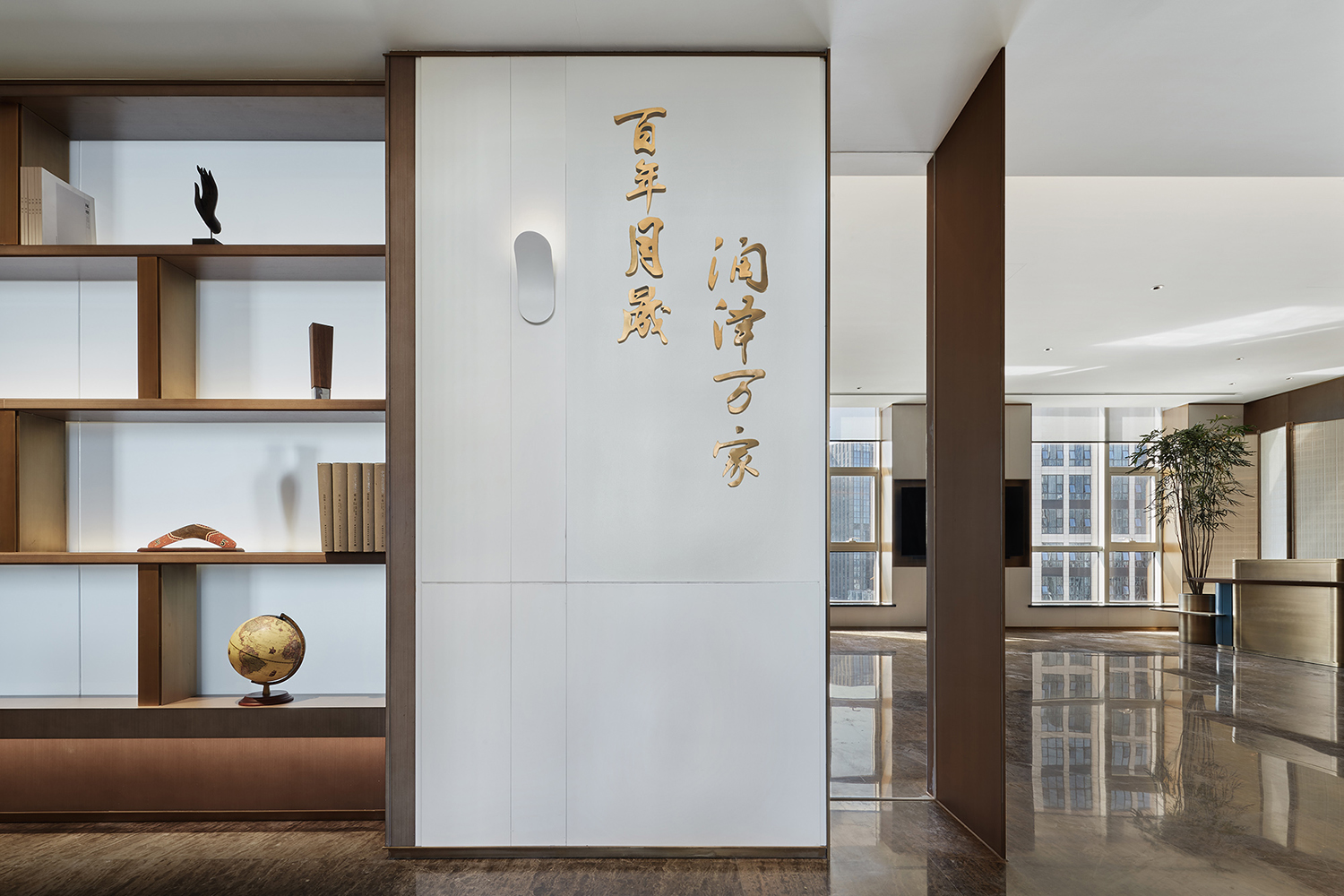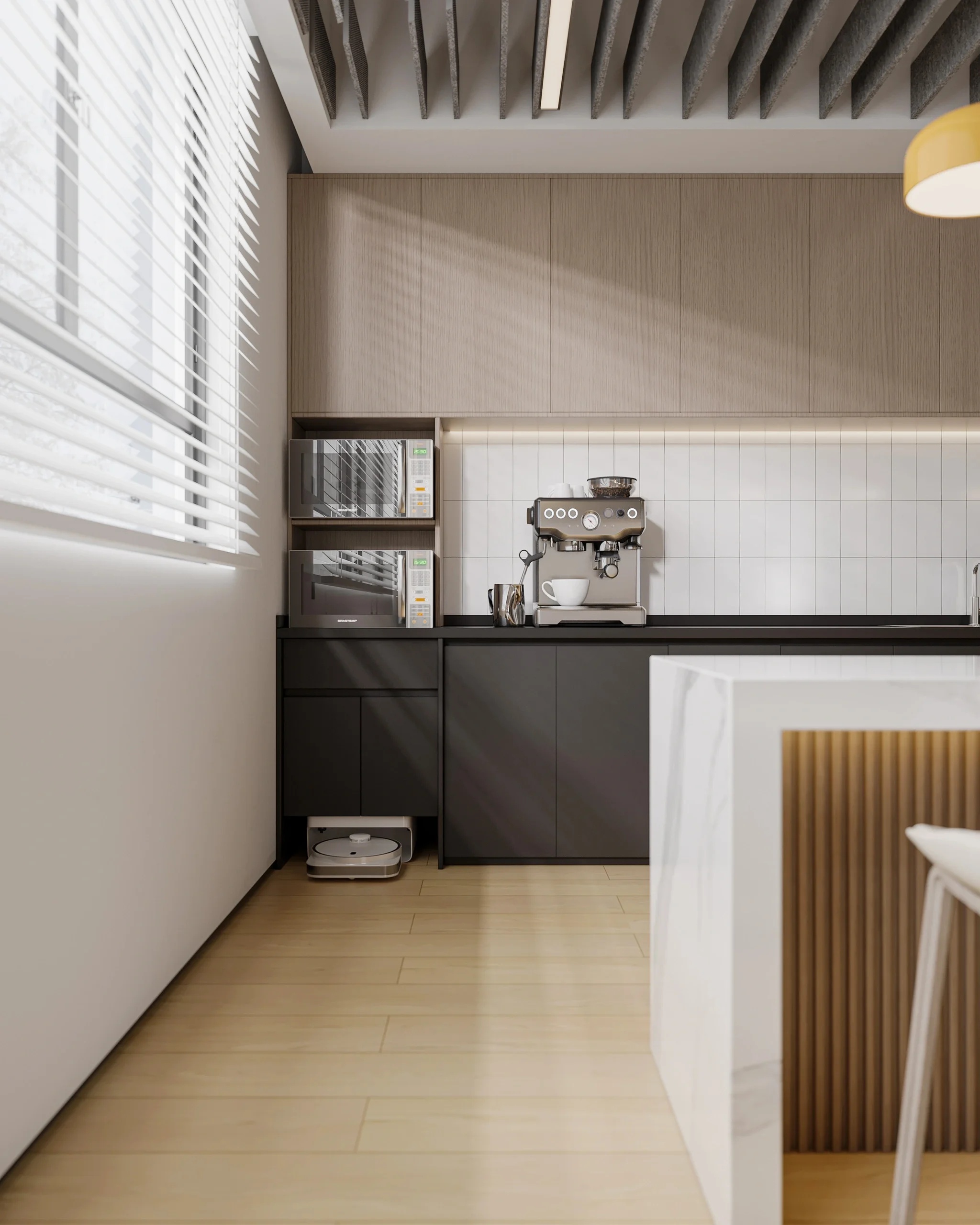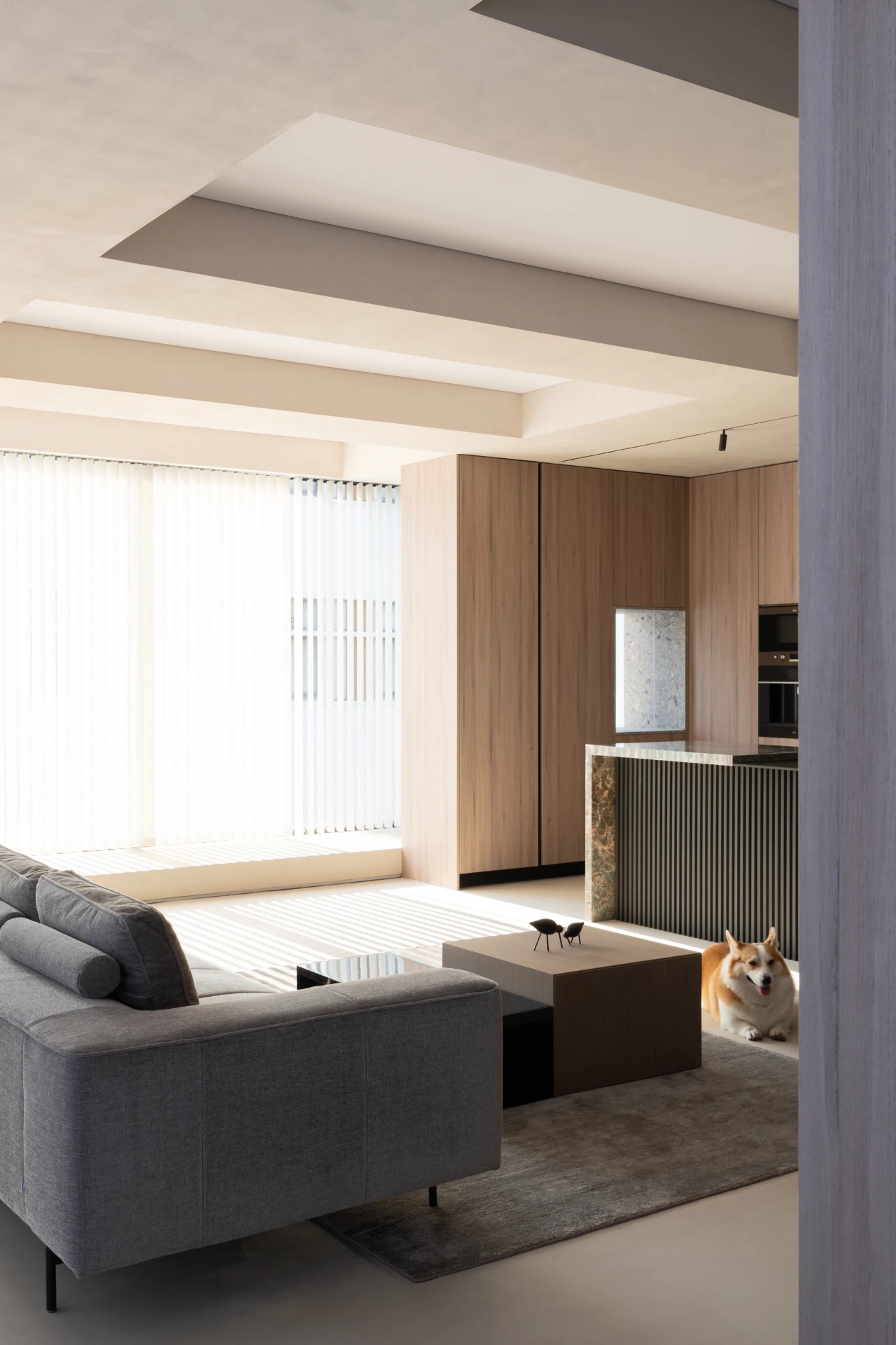 位于空间西侧的落地玻璃配合竖向百叶帘形成的光影序列成为会客厅的焦点,与水吧立面的格栅物理结构两者相互渗透获得更深刻的秩序体验。