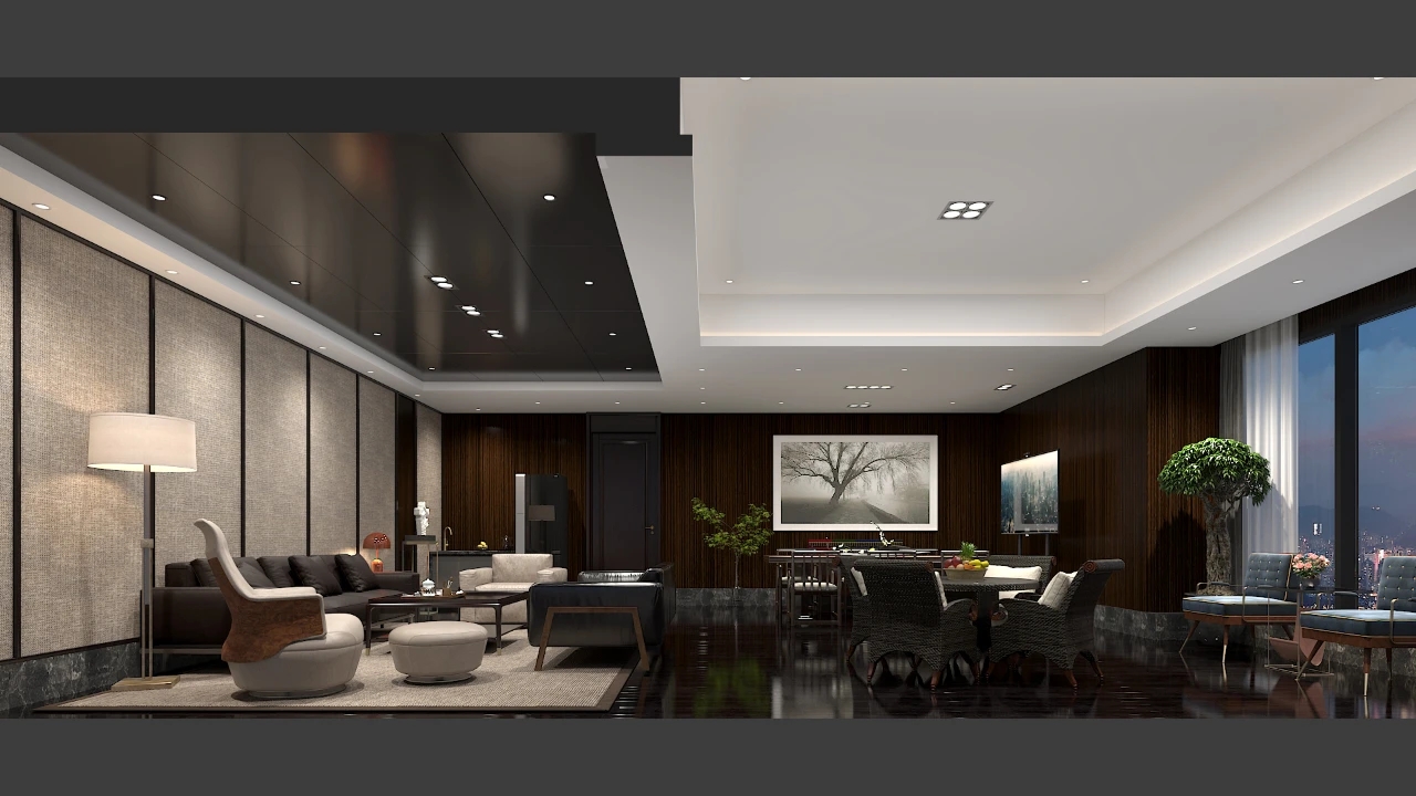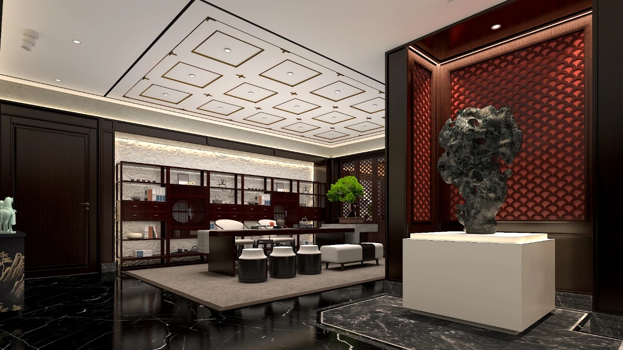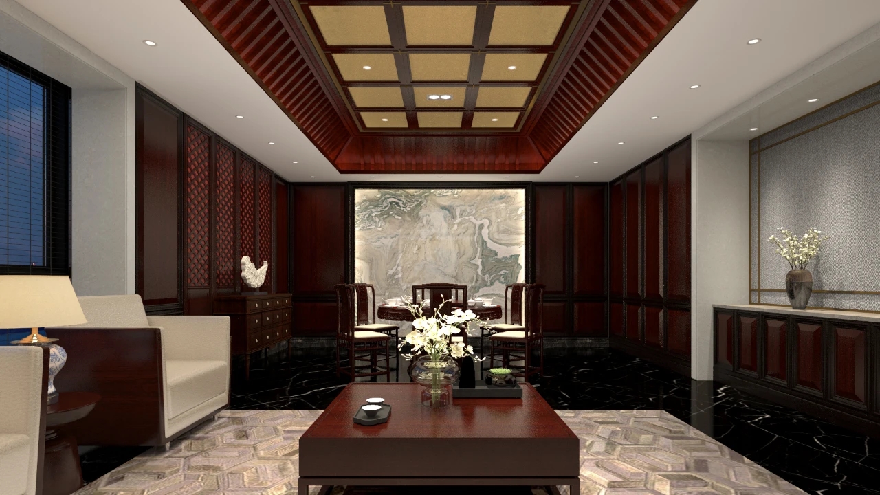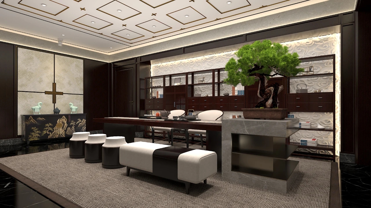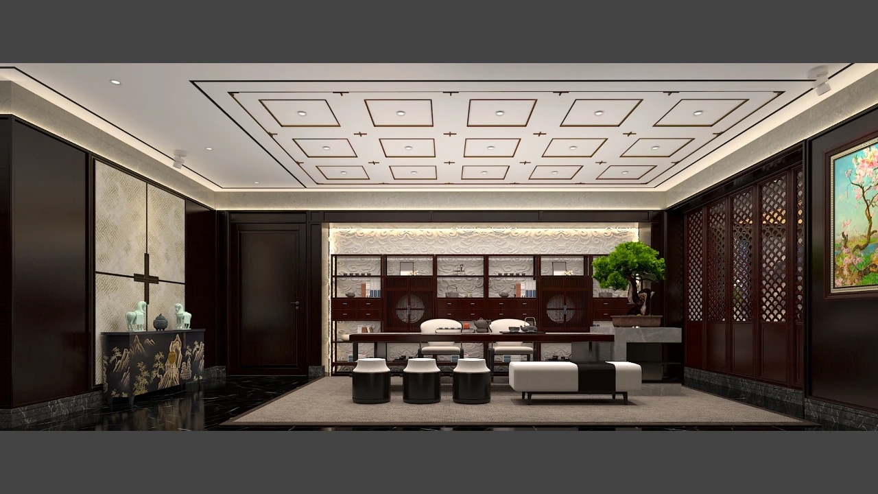 位于空间西侧的落地玻璃配合竖向百叶帘形成的光影序列成为会客厅的焦点,与水吧立面的格栅物理结构两者相互渗透获得更深刻的秩序体验。