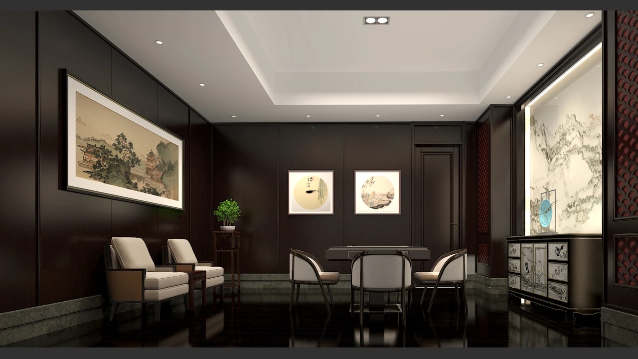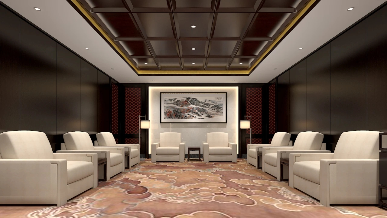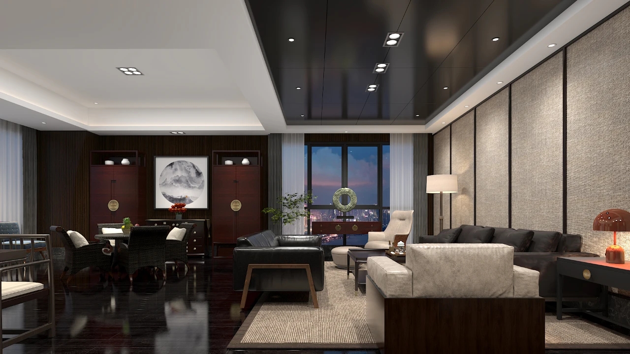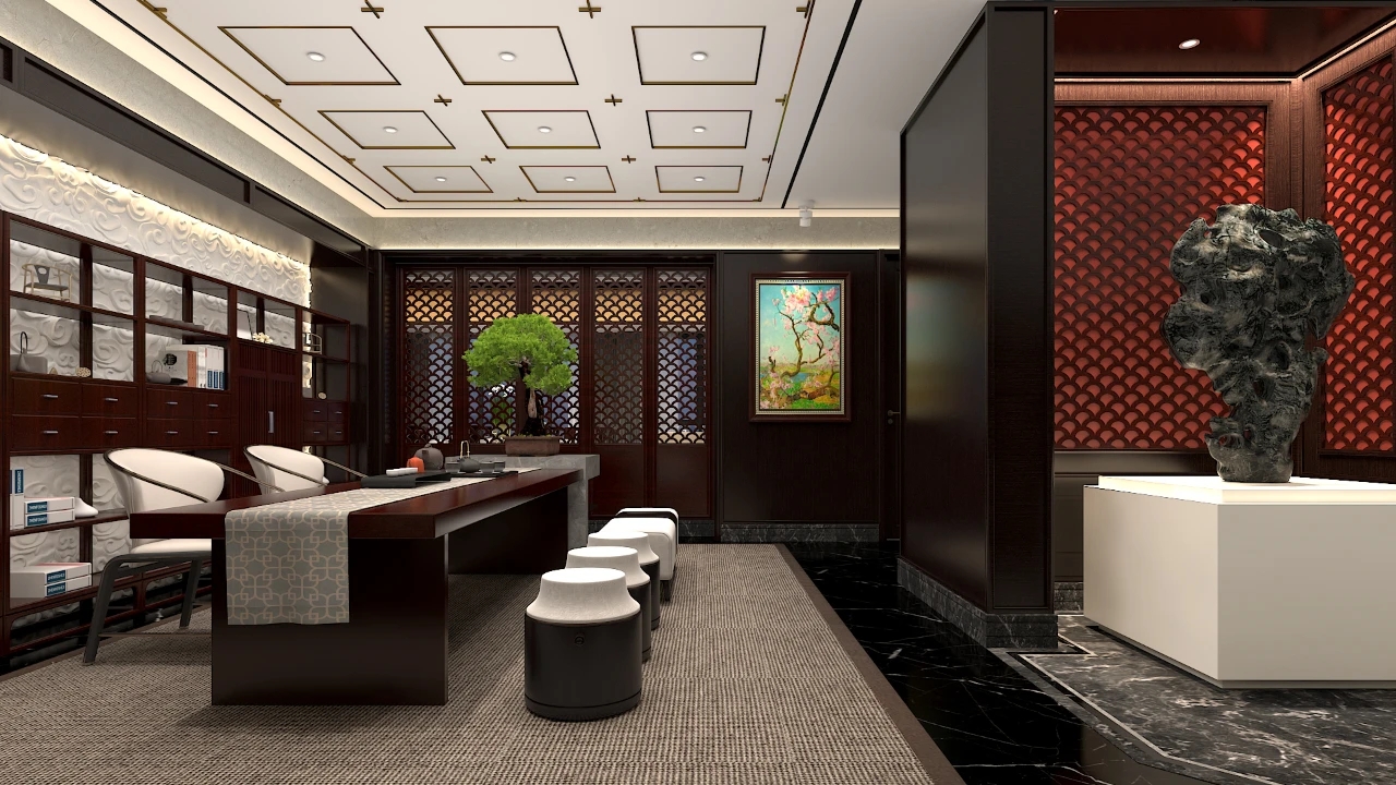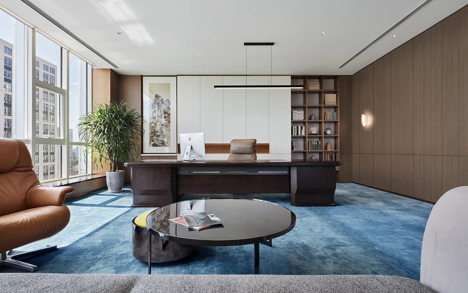 位于空间西侧的落地玻璃配合竖向百叶帘形成的光影序列成为会客厅的焦点,与水吧立面的格栅物理结构两者相互渗透获得更深刻的秩序体验。