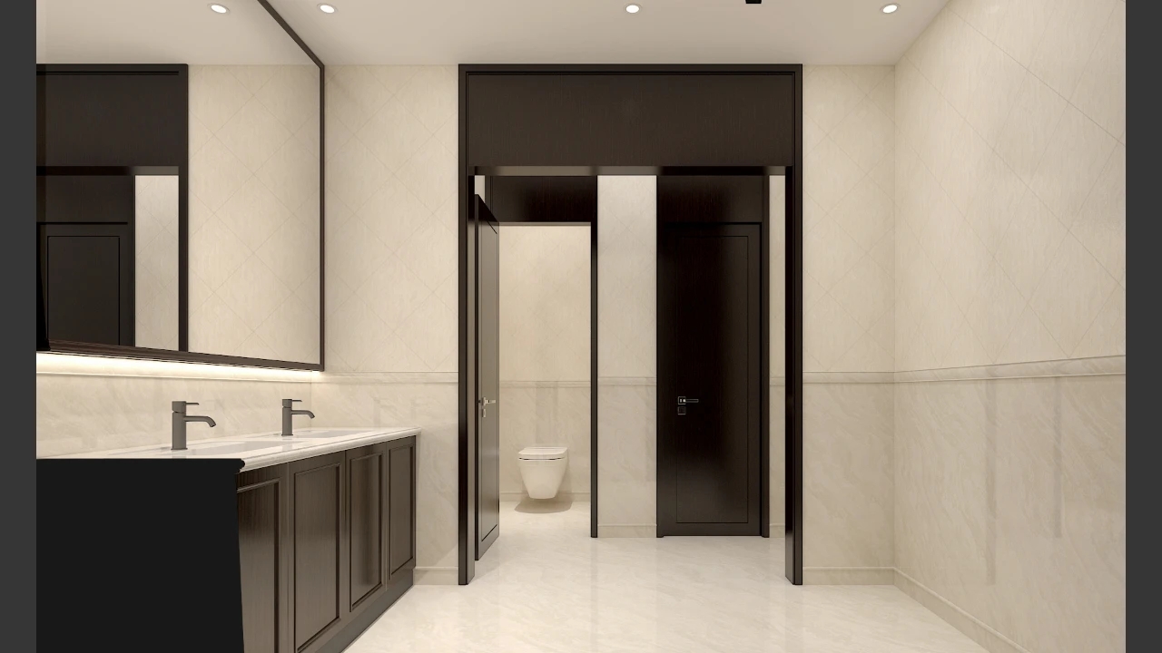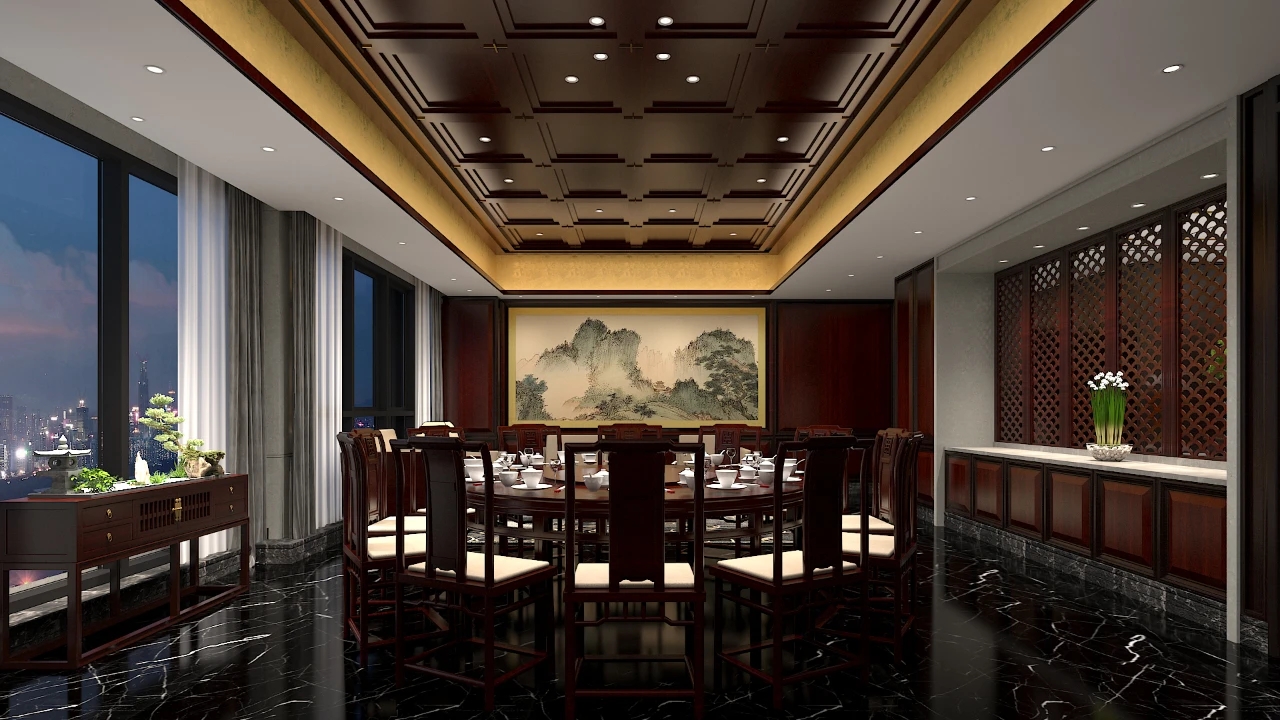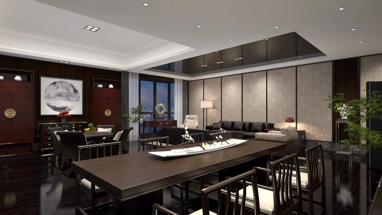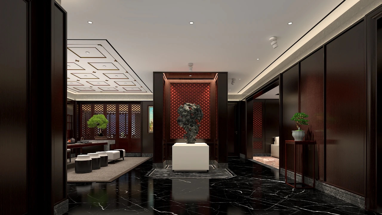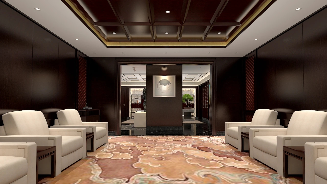 位于空间西侧的落地玻璃配合竖向百叶帘形成的光影序列成为会客厅的焦点,与水吧立面的格栅物理结构两者相互渗透获得更深刻的秩序体验。